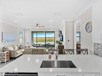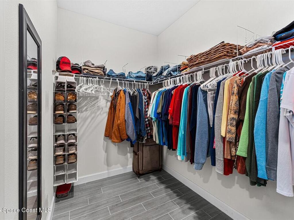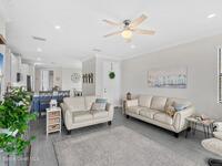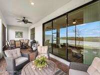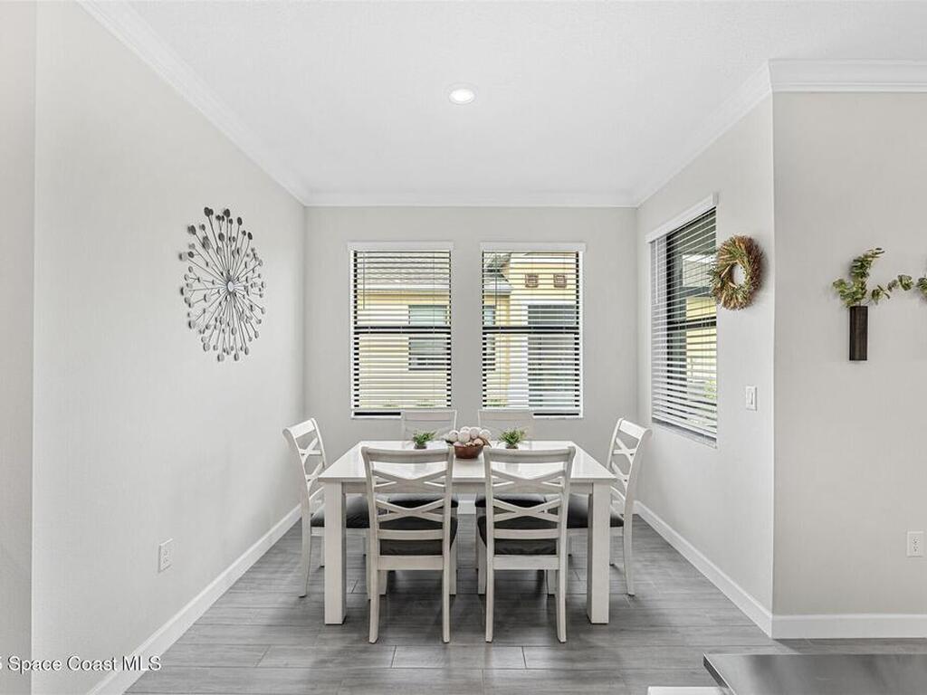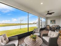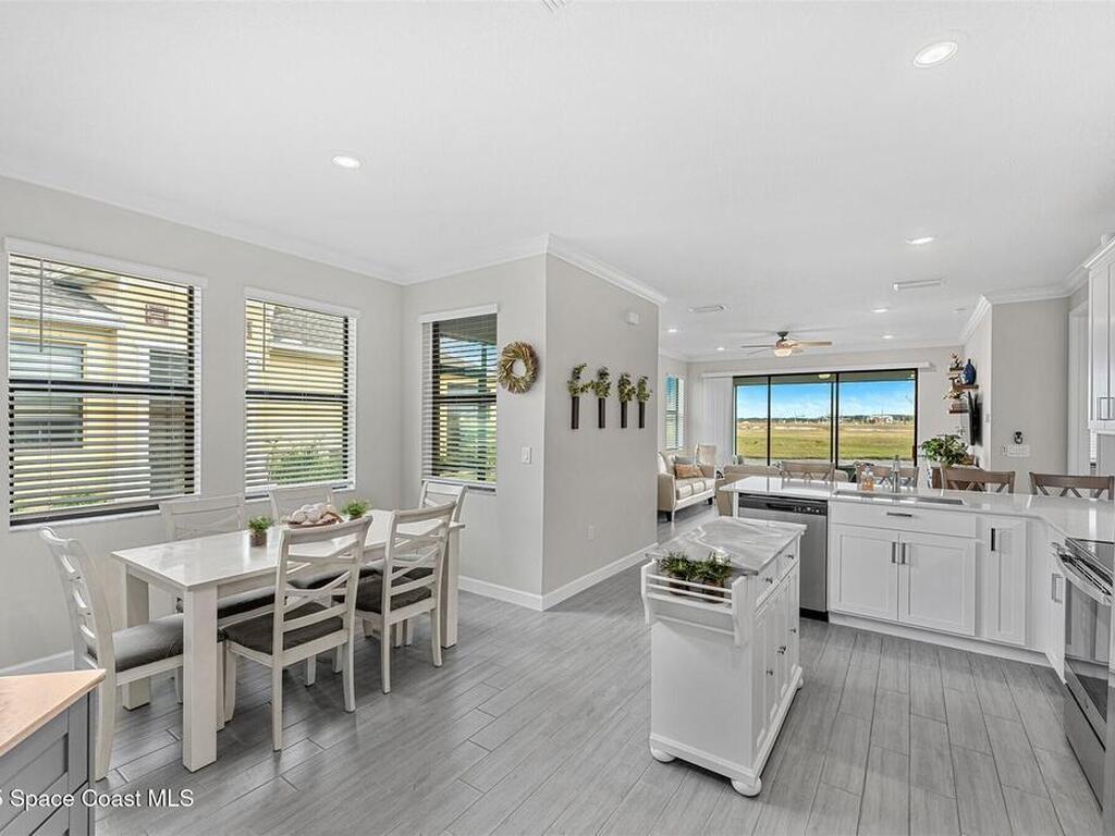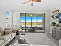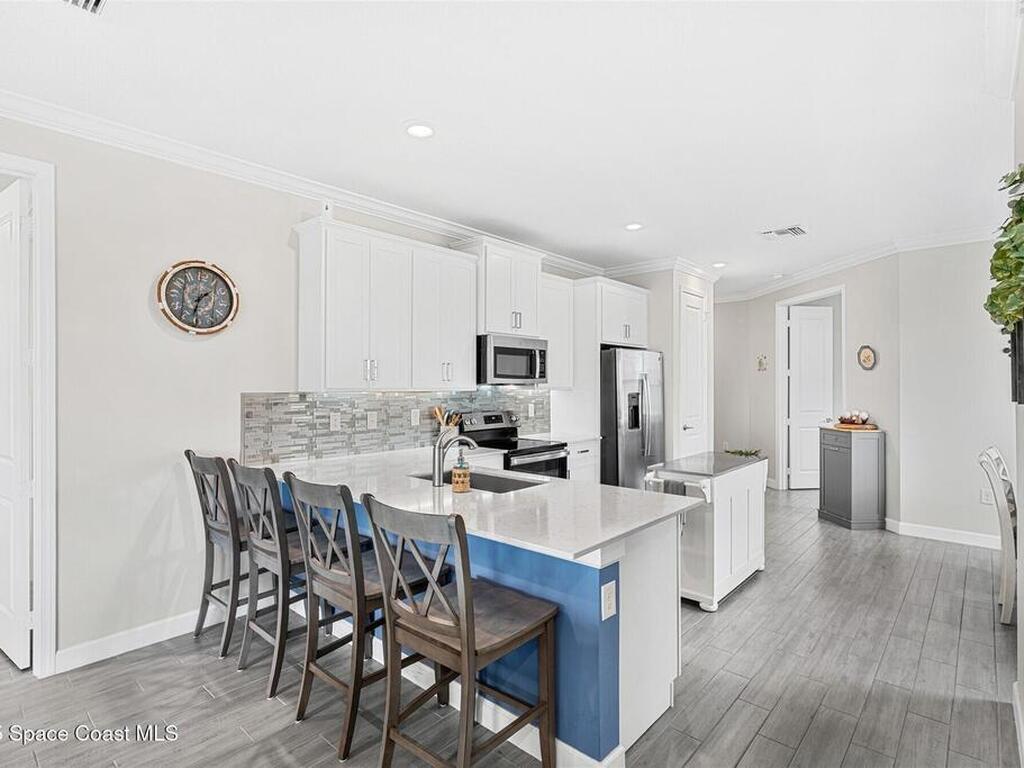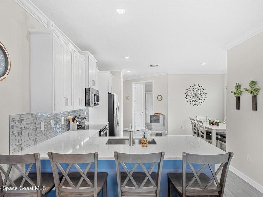 Must See 1565 Sq. ft. waterfront home in in Bridgewater, Viera's sought after 55+ resort style gated community! This 2 bedroom plus study, 2 bath, 2 car oversized garage (20X21) home checks off all the boxes: plank tile floors and crown molding throughout, 8' doors, deluxe light package with LED lights in Great Room and Primary Bedroom, and 5 ceiling fans. Designer kitchen with staggered white cabinets, marble look quartz counters, decorator backsplash, and portable island with extra drawers and cabinets! Luxury primary bath with large shower w/ bench, quartz counters and upgraded faucets! Study with double doors includes a murphy bed for those out-of-town guests! Laundry Rm has extra closet! Private screened-in entry and 270 sq. ft. back porch. Unwind at the private clubhouse, featuring a heated pool w/ waterfall & spa, fitness room, billiard room, coffee lounge, lit tennis & pickle ball courts, and a movie theater! The HOA covers lawn care! Short car ride to Atlantic beaches!
