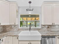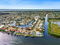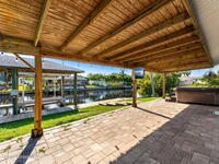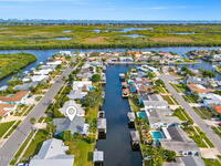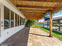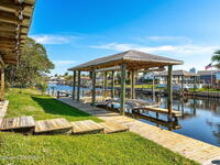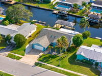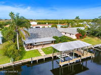 This Diana Shores canal front gem features a 1988 block construction home with high ceilings, no cast iron plumbing, a newer dock with a covered 6, 000lbs boat lift, and quick access to Sykes Creek. Inside, modern finishes include wood-look tile throughout the living space, updated designer off-white shaker cabinetry in the kitchen with granite countertops, and stainless appliances. The split floor plan provides a generous primary suite with his and hers walk-in closets, and a sizable ensuite with a dual vanity, water closet, and separate shower and tub. The living space lends itself to multiple uses, with a formal dining area, a den or office off the main living room, a dinette off the kitchen, plus an additional 700 sqft enclosed patio with a mini-split cooling unit. A spacious indoor laundry room offers everyday convenience, and the garage provides ample storage and a newer garage door. Outside, a spacious pavered lanai overlooks your deep water canal. Just 15 minutes from beach!