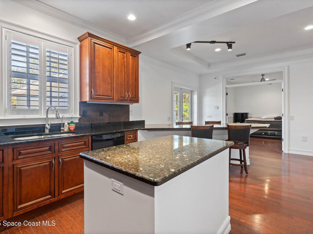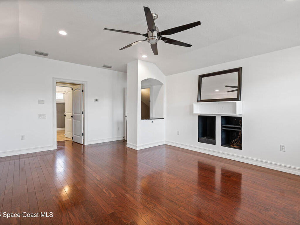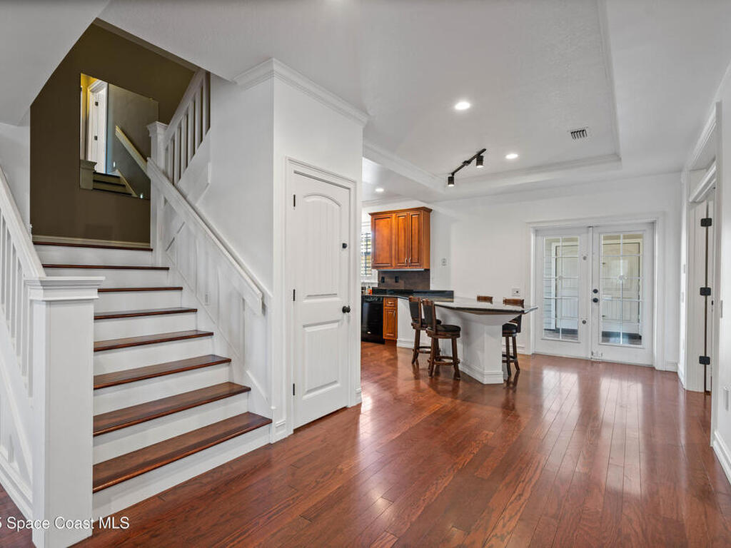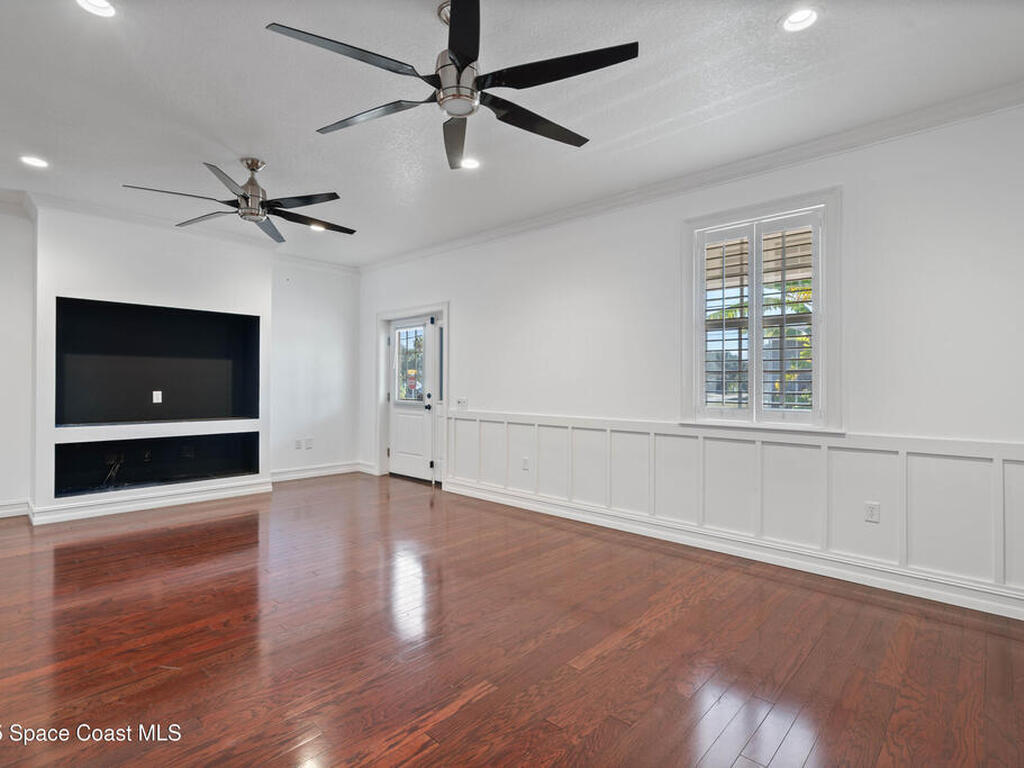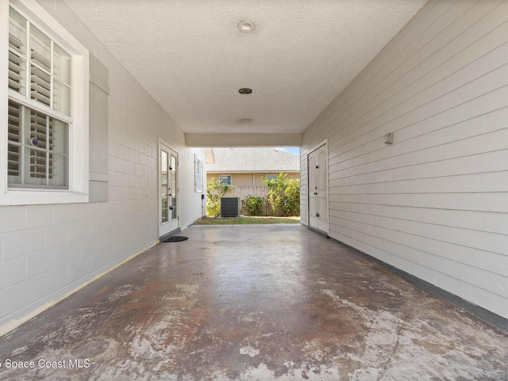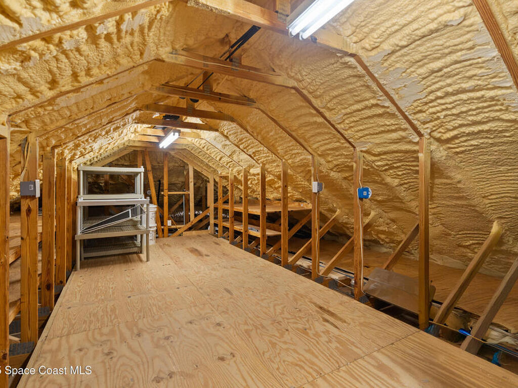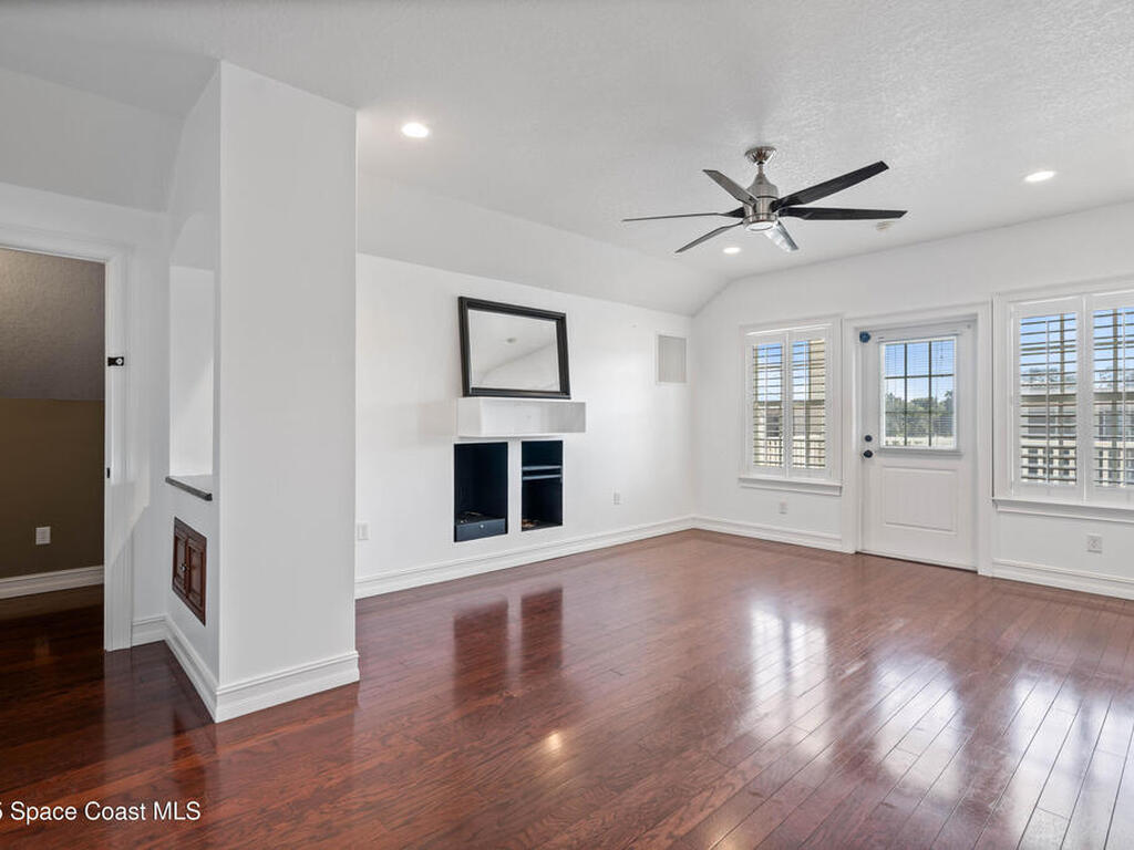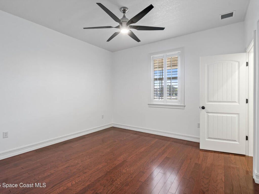 Custom 3 bed, 2 bath, 2, 148 sq ft home close to the Indian River and beaches, in the heart of the Space Coast aerospace and tech hub. Enjoy water views from your private primary balcony, tall ceilings, solid wood floors, granite in the kitchen and baths, an island with bar seating and premium solid wood cabinetry, plus quality fans, upgraded lighting, smart style controls, central vacuum and professionally run wiring. Freshly painted inside and out with board and batten accents, breezeway, irrigation and spray foamed attic spaces, it lives larger than the numbers suggest with approx. 3, 630 sq ft of usable space including bonus areas. Outside, mature banana, guava and citrus trees, upgraded locks, a camera system, concrete pads for an RV, boat, trailer or toys and a giant three car garage workshop with its own AC complete the picture. With no HOA and this level of quality, it is a Space Coast opportunity you will not want to miss.
