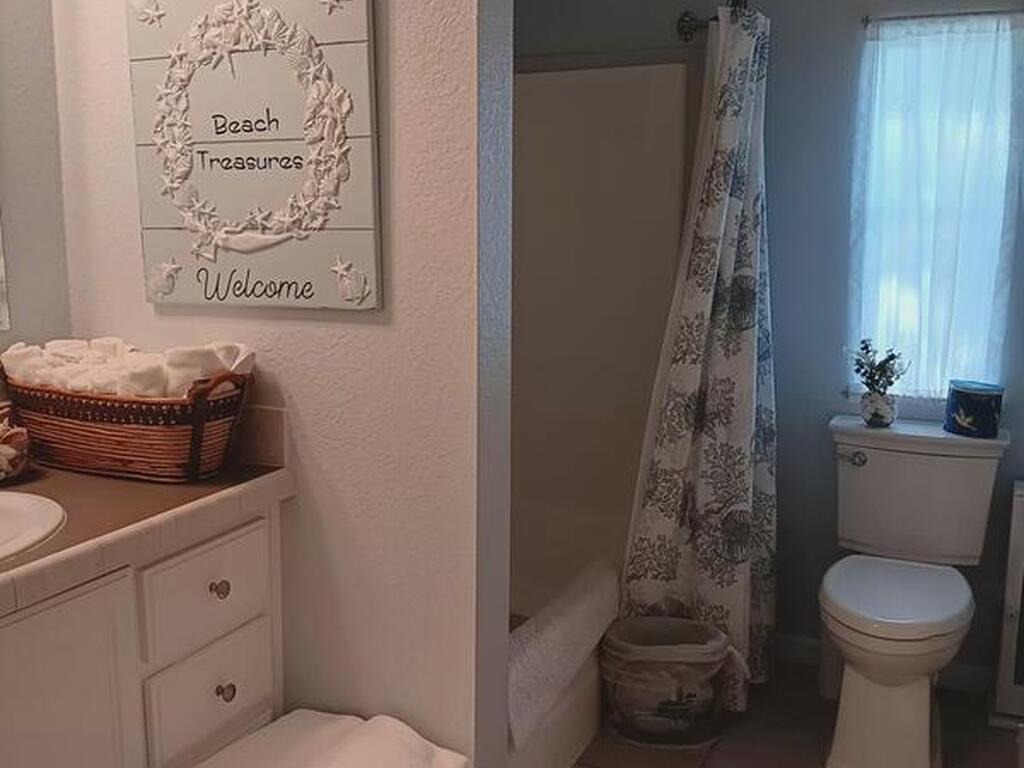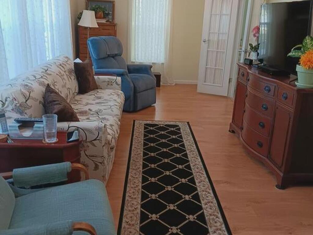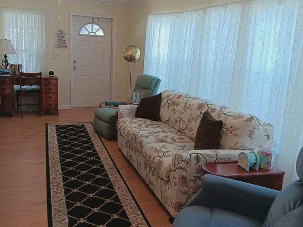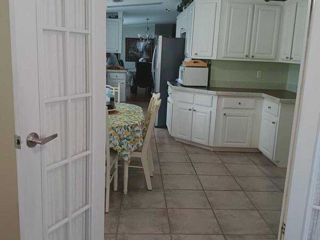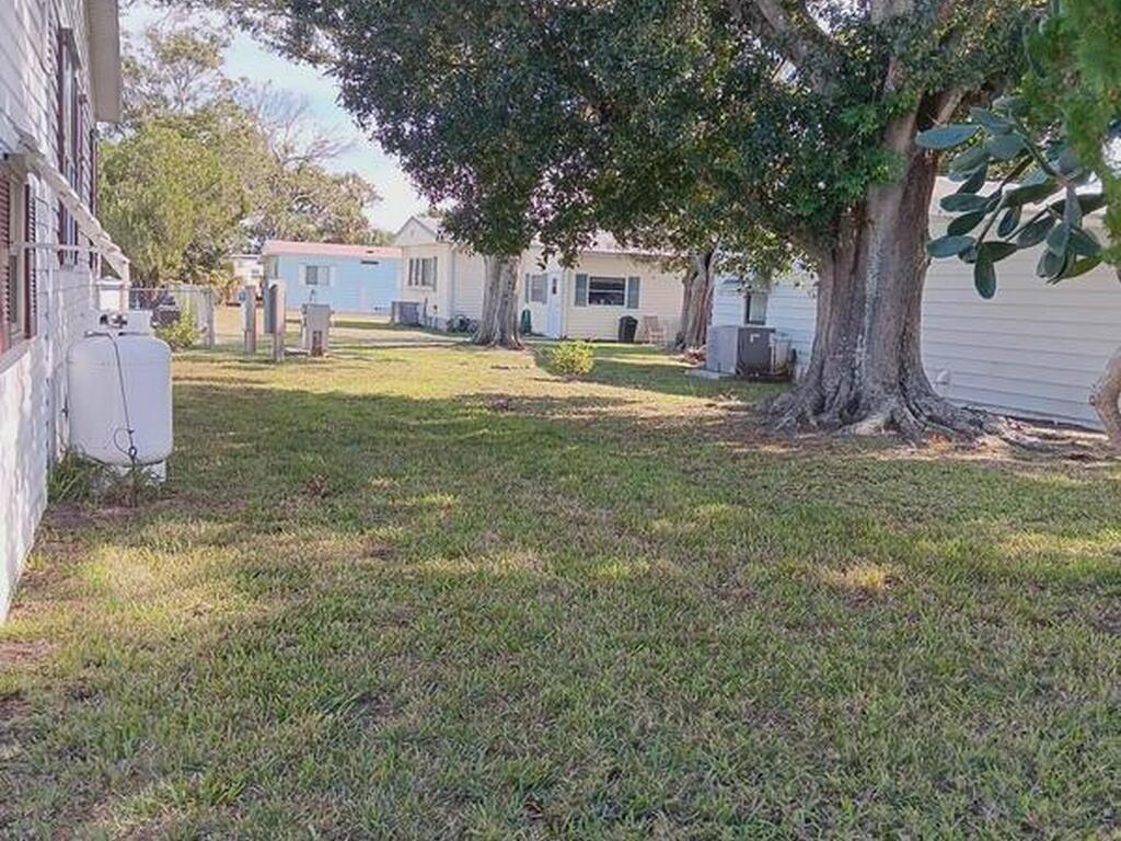 This spacious home has 3 bedrooms and all enclosed front room with French doors leading to the rest of the home. Large kitchen with pantry and plenty of cabinets. Open dining room and living room Separate master bedroom suite with bath plus 2 more bedrooms and full bath. All interior doors are 36'' wide. Home has many updates including, Roof 2023, Hot water heater 2023, AC 2018 just refurbished, water filter, refrigerator and washing machine brand new, Large lot with mature trees for shade, Barefoot Bay offers many amenities for all to enjoy including Private dock and beach. You own the land!