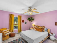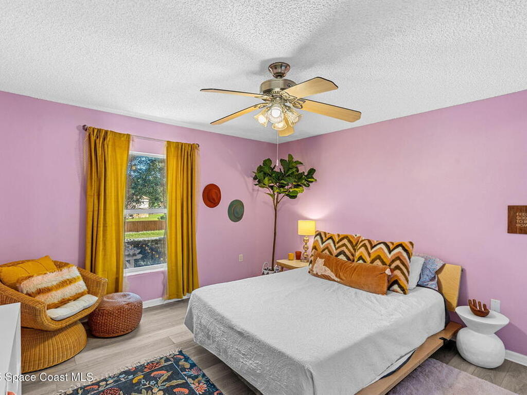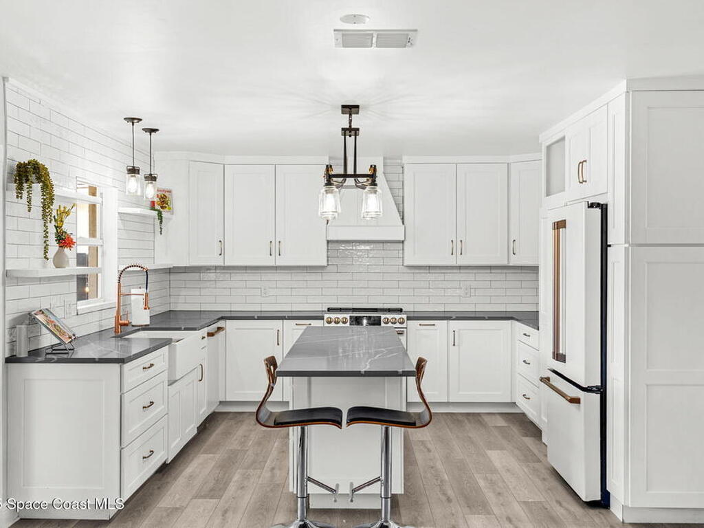 Behind the gates of a low-HOA community, a 5BD/2.5BA standout delivers instant wow w/ fresh interior & exterior paint, new roof, new exterior light fixtures, stone-infused LVP, & custom tile accent walls that feel straight from a designer's mood board. The modern island kitchen steals the show w/ Cambria marbled quartz, counter-to-ceiling subway tile, soft-close artisan white cabinetry, Cafe appliances w/ bronze hardware, an apron-front sink, & a hidden walk-in pantry complete w/ a built-in microwave + butcher-block buffet made for hosting. A 1st-floor BD w/ closet flexes as guest space, office, or bonus room, while the family room brings character w/ shiplap-style walls + floating shelves before opening to a spacious loft. The primary suite reads like a true retreat, styled w/ bedside chandeliers & a spa-like ensuite featuring frosted glass sliders, oblong white tile, a jetted shower, & double rectangular vessel sinks w/ warm wood accents.