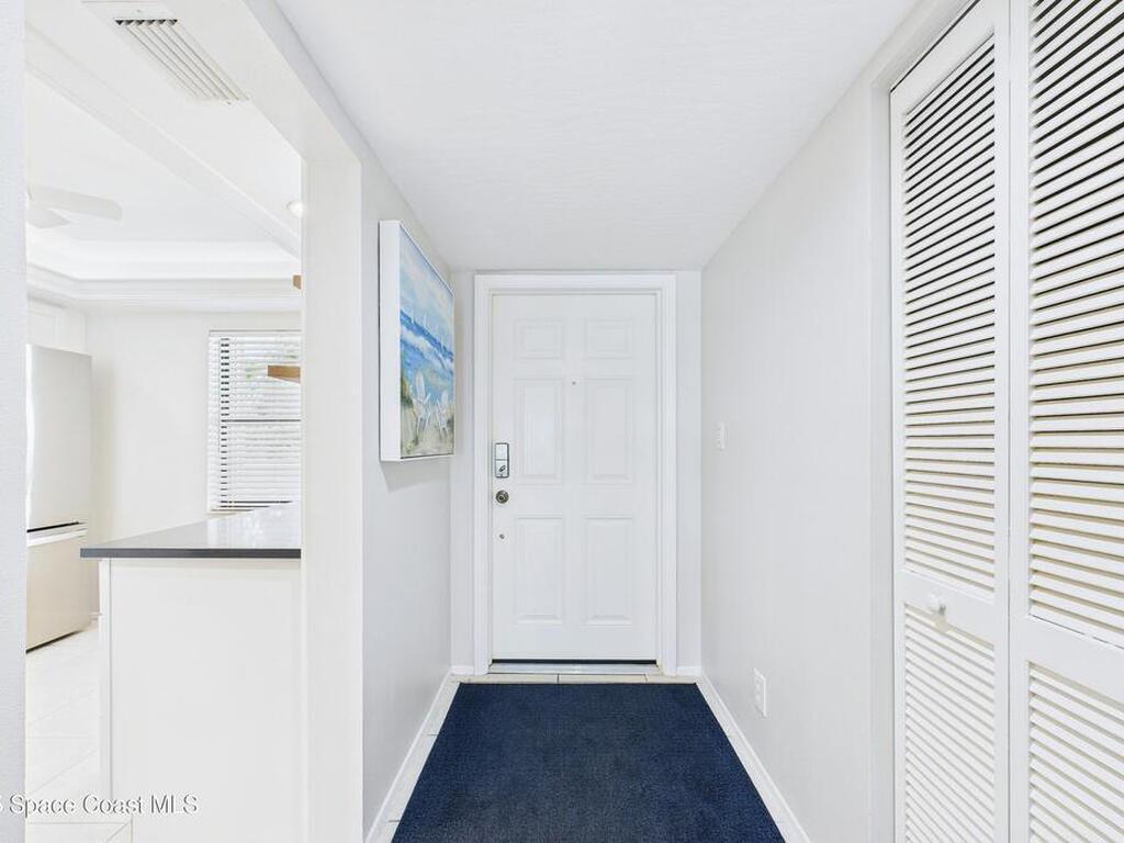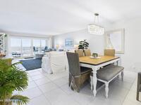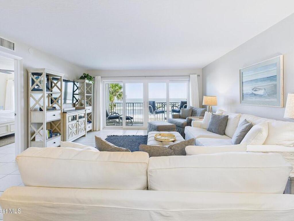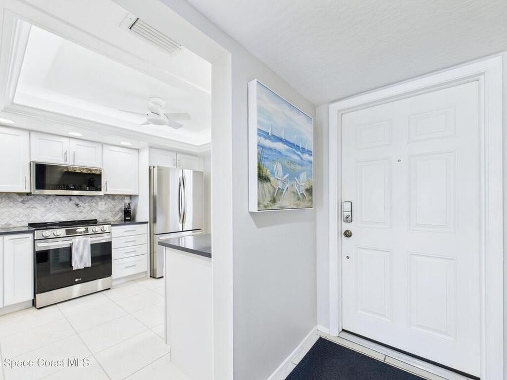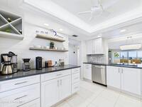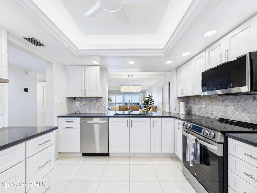 Enjoy oceanfront living with private beach access in this fully renovated 2 bedroom, 2 bathroom condominium at the Commodore Club in Indialantic. This third-floor residence features direct Atlantic views, impact-rated glass doors with turtle-safe tint, and in-unit laundry. The centerpiece is a custom kitchen layout with KraftMaid soft-close cabinetry, Silestone Charcoal Soapstone countertops, LG Smart stainless appliances, a coffee bar with built-in shelving, and a counter-height bar extension. The electrical panel was updated and relocated to create an open flow and feature wall. 2023-2024 upgrades include a new AC system, water heater, and bathroom renovations with granite vanities, new fixtures, and tile flooring. Fresh paint, resurfaced ceilings, updated lighting, ceiling fans, and custom window treatments complete this move-in ready coastal residence with access to a beachfront pool, showcasing quality craftsmanship and the Florida Space Coast lifestyle.