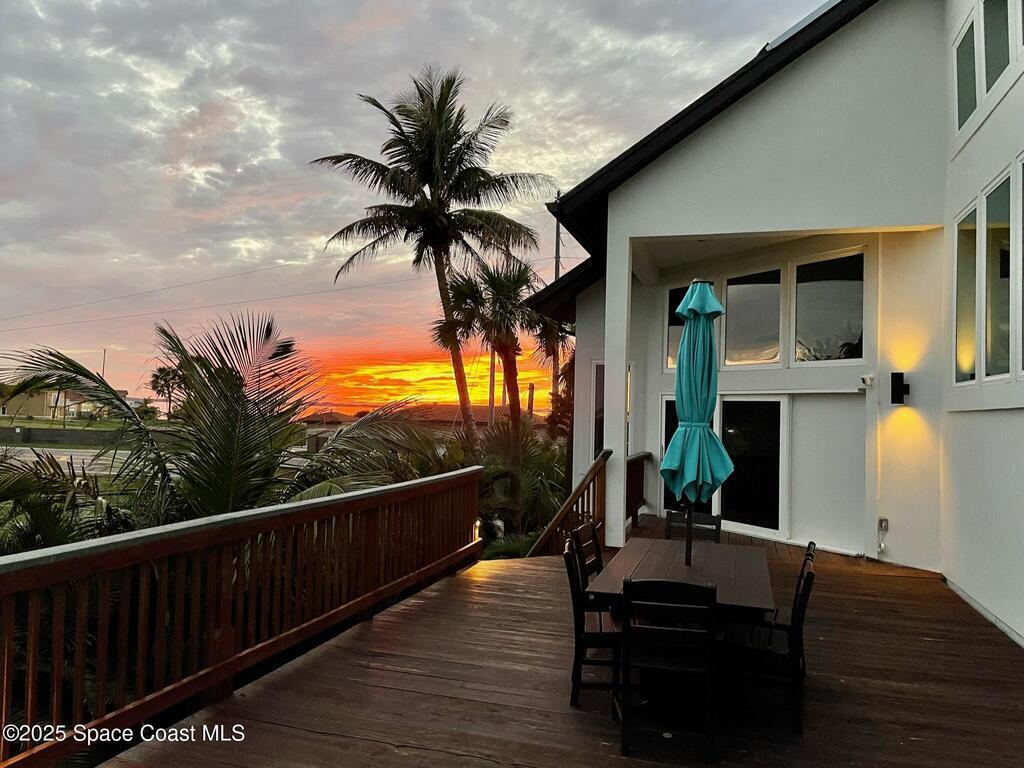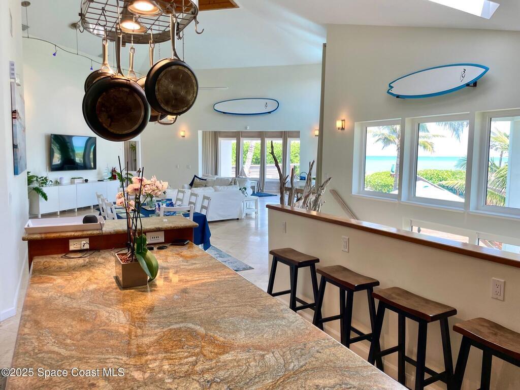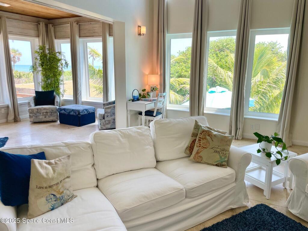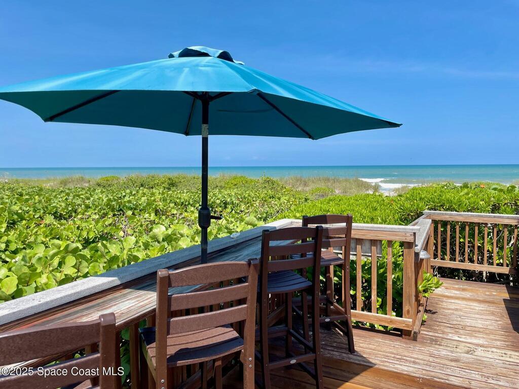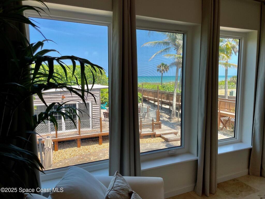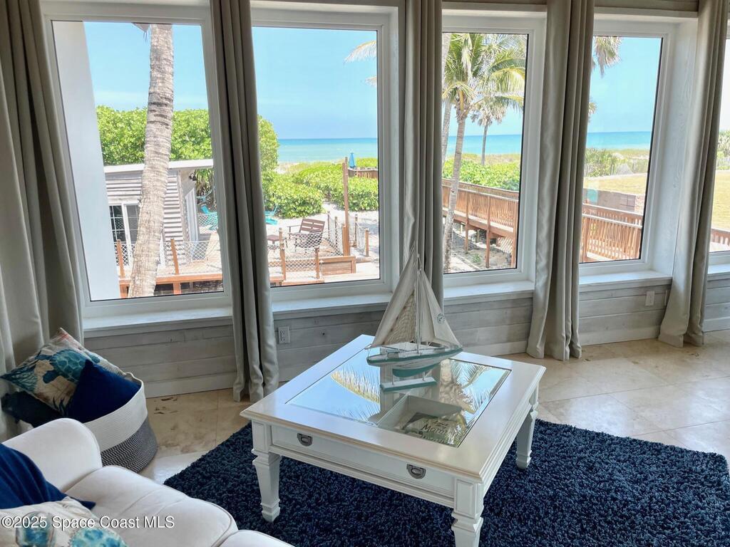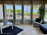 Experience coastal luxury in this exceptional direct oceanfront estate offering approx. 150 ft of private beach frontage. Set on a generous 12, 000+/- sq ft lot, this refined retreat features over 4, 000 sq ft of living space with 4 bedrooms and 3 baths, designed for both relaxation and entertaining. Three spacious patios with BBQ area create the ideal setting for gatherings, poolside lounging, or enjoying s'mores by the fire pit under the stars. Take in breathtaking sunrises, rocket launch views, and seasonal sea turtle hatchings from your own backyard. The first level includes a private mother-in-law suite with living area and wet bar, perfect for guests. Upstairs, floor-to-ceiling windows showcase sweeping ocean views. The gourmet kitchen is equipped with a Sub-Zero refrigerator, Wolf range with warming drawer, stainless steel appliances, and ample workspace. Additional features include dual split A/C, whole-home water softener, and generator. Live your best life in paradise every day.