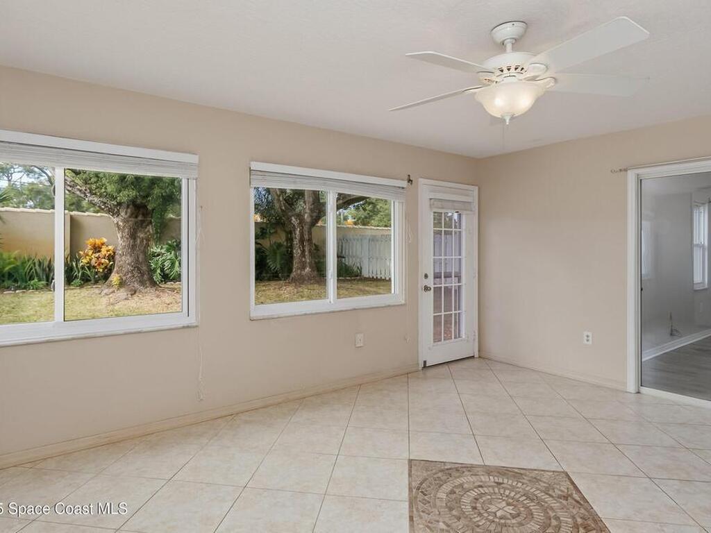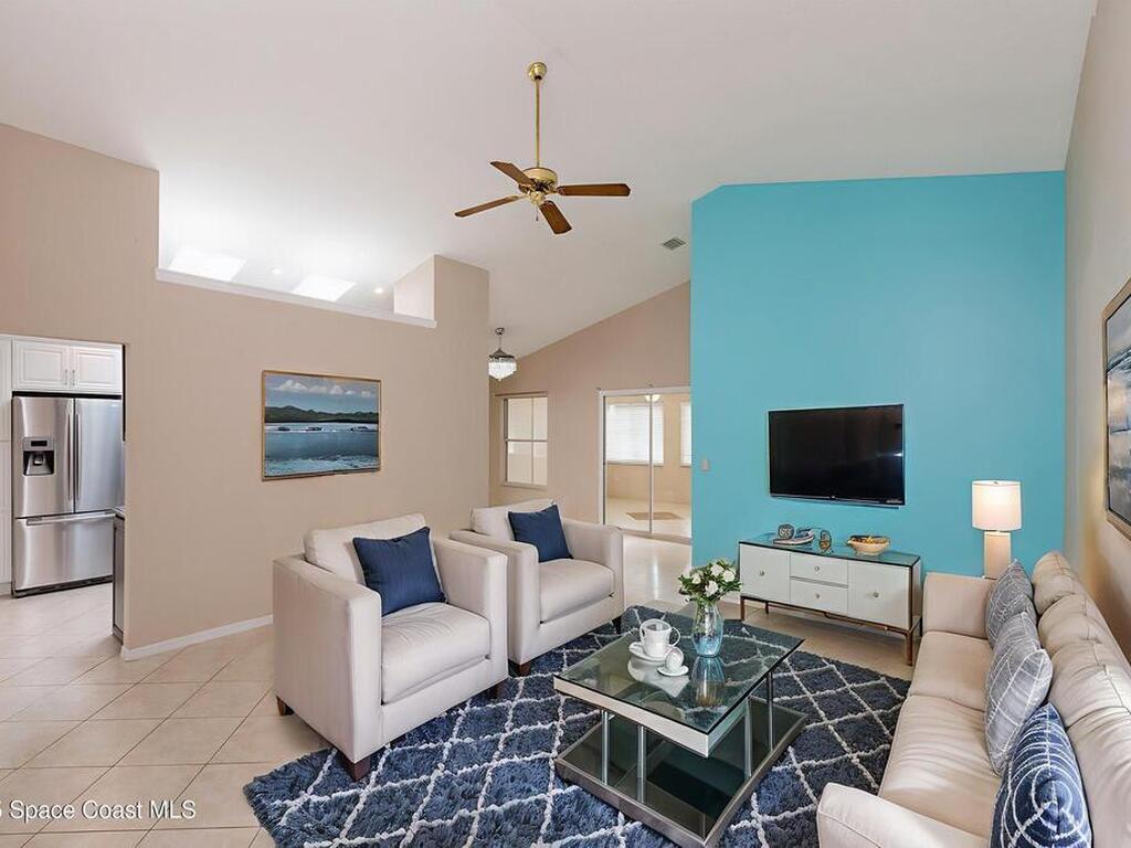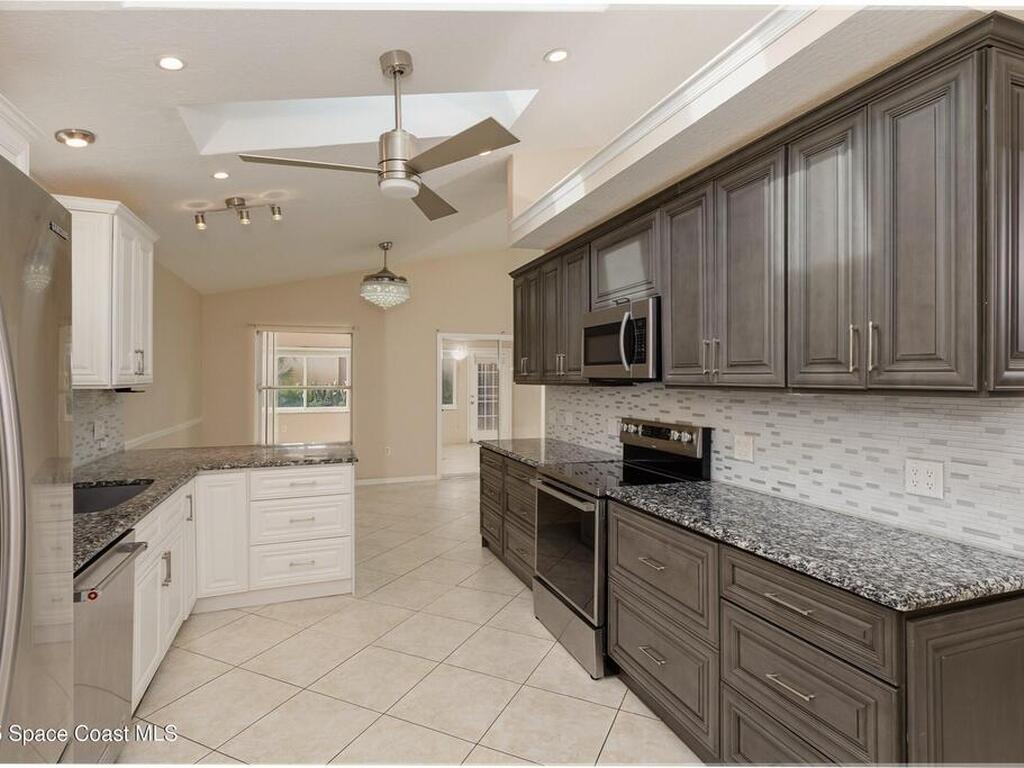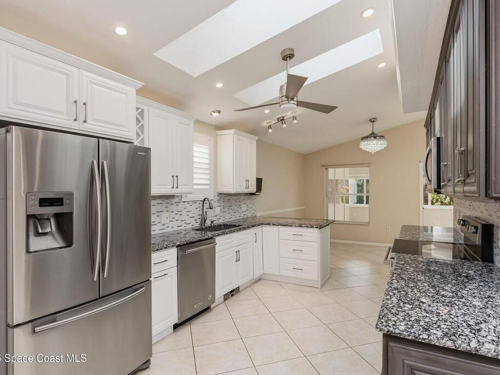 3b/2b Melbourne home w/2-car garage welcomes you into a front family room w/high ceilings that set an open, welcoming first impression. Kitchen sits just off family room & garage entry and is filled w/natural light from skylights. Designed for real use, it features soft-close drawers, pull-out shelving, built-in wine rack, a floor-level vacuum system & a bar counter that opens to the dining space -- perfect for casual meals or conversation while cooking. Enclosed patio extends the living space & includes floor-to-ceiling storage along one wall, ideal for hobbies or extra organization. Primary suite is privately located off family room w/patio access, step-in shower, large walk-in closet & view of fully fenced backyard. Two spare bedrooms share a full bath w/tub/shower combo & one offers a built-in Murphy bed. Out back, a patio creates space for grilling, relaxing or soaking up the sun. Ceiling fans throughout add comfort. Schedule your showing & see how this home fits your next chapter