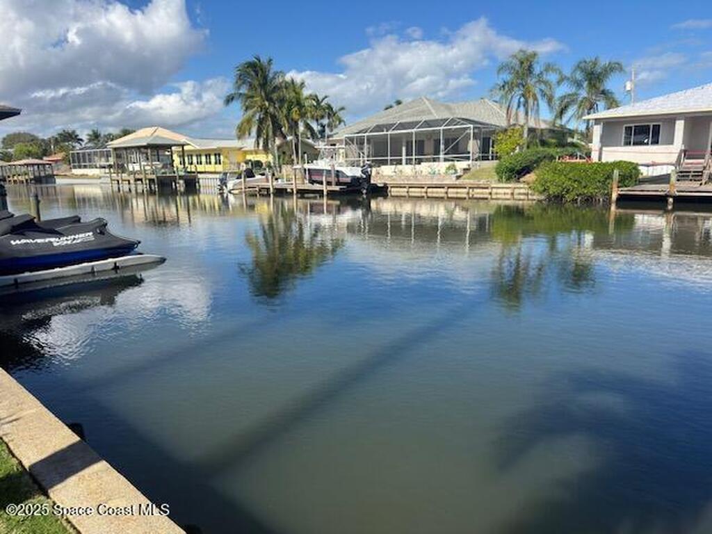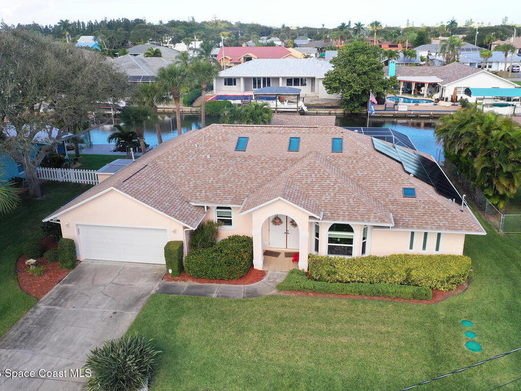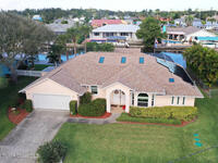 Stunning Sunnyland Beach waterfront home is located in much sought after Melbourne Beach. As you enter the home you will appreciate the high vaulted ceilings and views of sparkling screened in pool and waterway. Skylights in Primary Bedroom and Living Room. Open concept floorplan has kitchen with breakfast bar all opening up to spacious family room with fireplace and dining area. Big sliders and windows let all of the light pour in. Bring your boat to the covered dock and lift with area to fish and store kayaks. Spacious 2 car garage. Beach access has shower to rinse off and stairs to the sand.