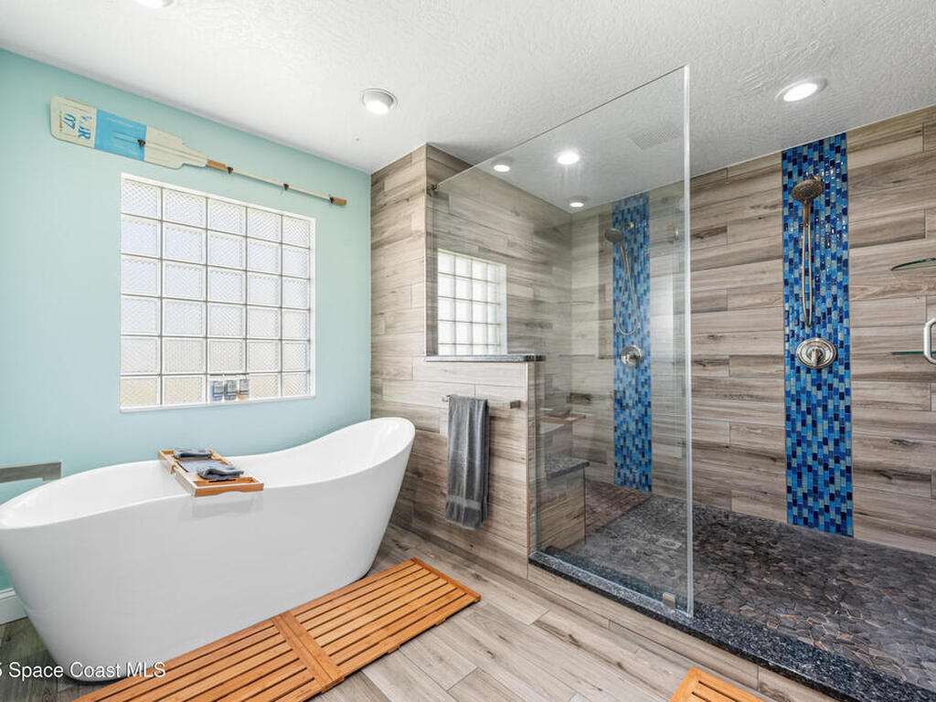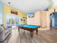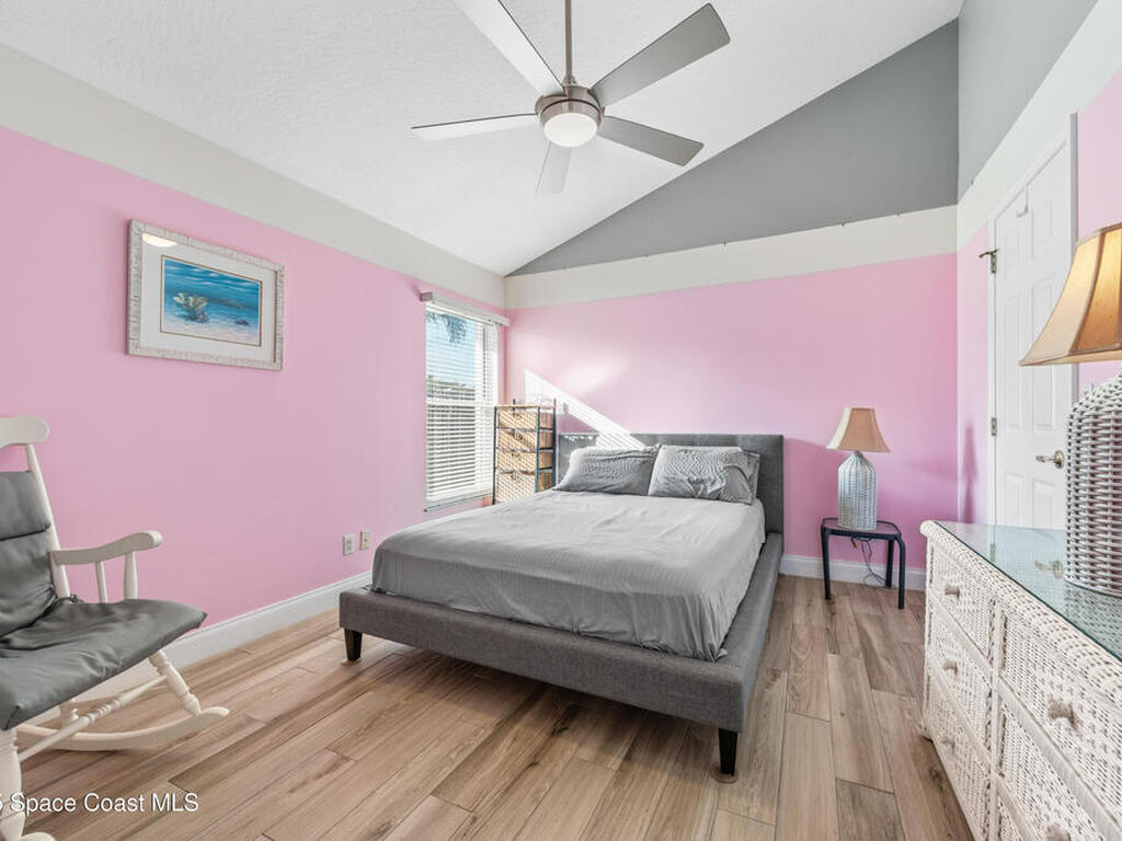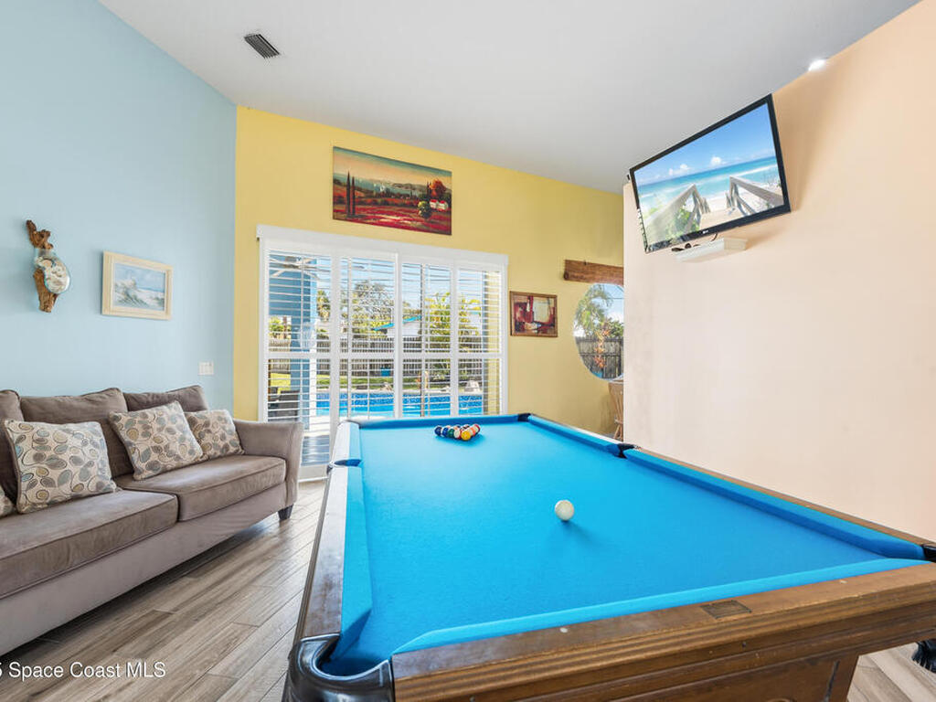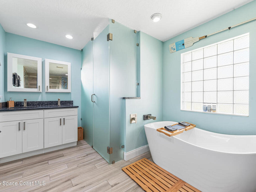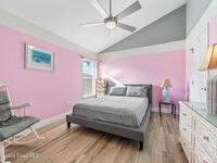 Tucked away at the end of a quiet cul-de-sac in the heart of Indialantic, 452 Veracruz Blvd offers rare privacy just steps from the beach. Set on a .32-acre lot, the oversized fenced backyard provides room for boat storage with permitted rear road right-of-way, while the Beach Street public beach access puts sunrise walks and surf sessions in quick reach. Major updates remove the guesswork, including a 2019 roof, a fully resurfaced and retiled pool completed in 2016, Pentair variable speed pool pump in 2024 and two HVAC systems installed in 2020, each with a 10-year warranty. Inside, gorgeous wood-look tile flooring and vaulted ceilings throughout create a bright, open feel. The floor plan features three bedrooms, dedicated office, an upstairs bonus room that can easily function as an additional bedroom, and two full bathrooms. The primary suite is a true retreat with a spa-style bath featuring a soaking tub, oversized walk-in shower, dual sinks, and a chic frosted-glass water closet.