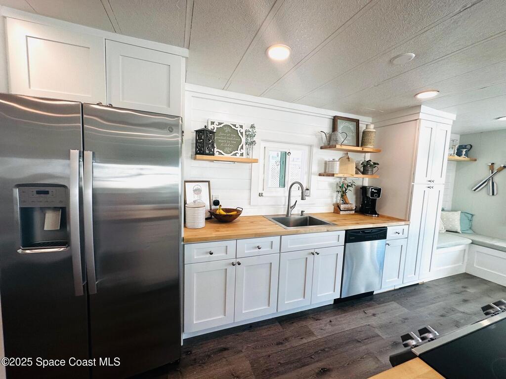 Be the first to tour and make an offer on this beautifully furnished coastal-designed modular home featuring 2 bedrooms and 2 bathrooms. Thoughtfully upgraded with new hurricane-impact windows / slider and a newly installed chain-link fence perfect for added privacy or your furry family members. The stunning open-concept gourmet kitchen showcases butcher block countertops and flows seamlessly into the living space, ideal for everyday living or entertaining. This move-in-ready home is a true must-see and is expected to sell quickly. Schedule your showing today.