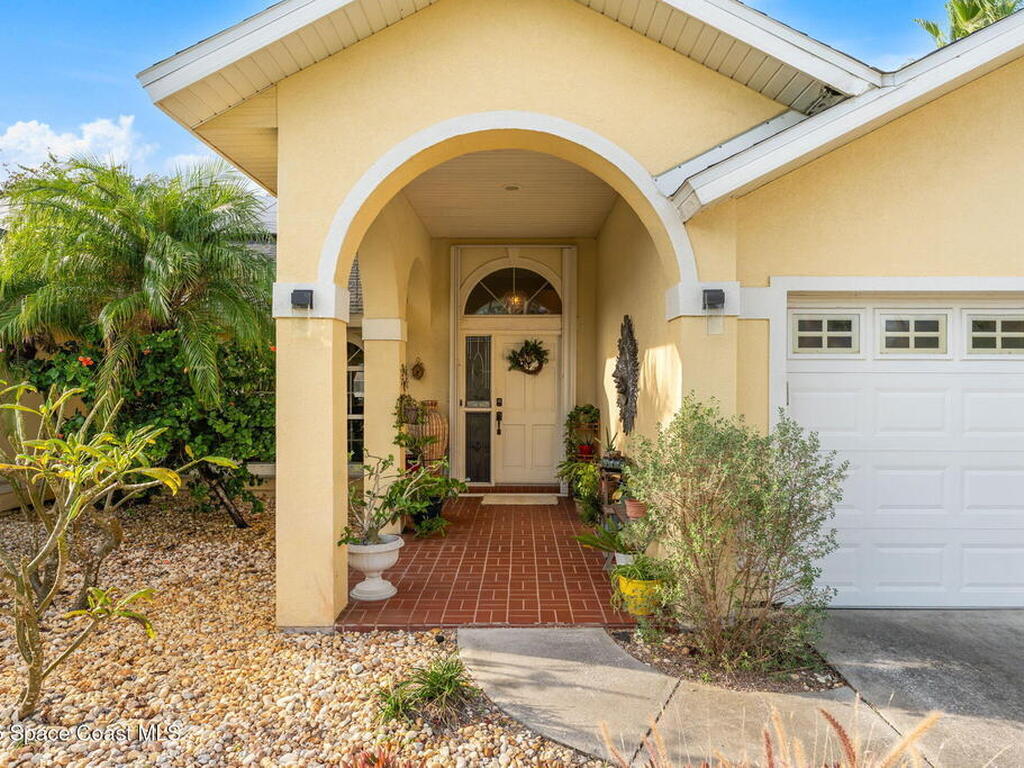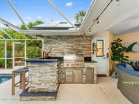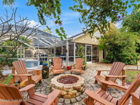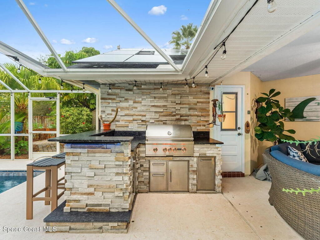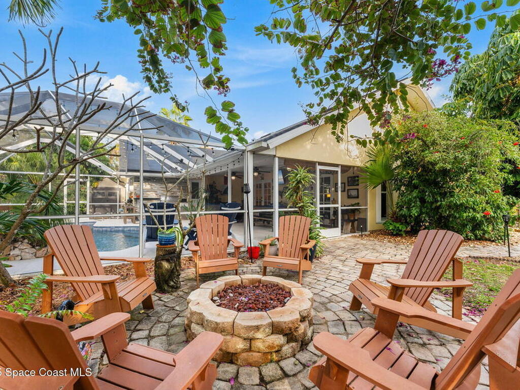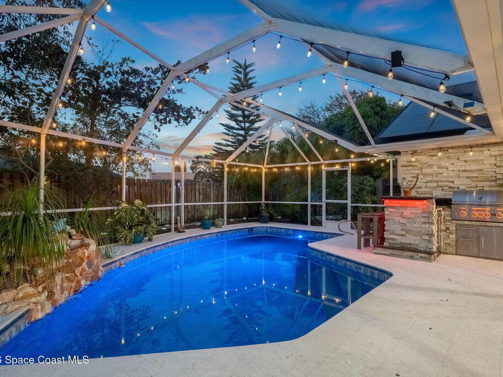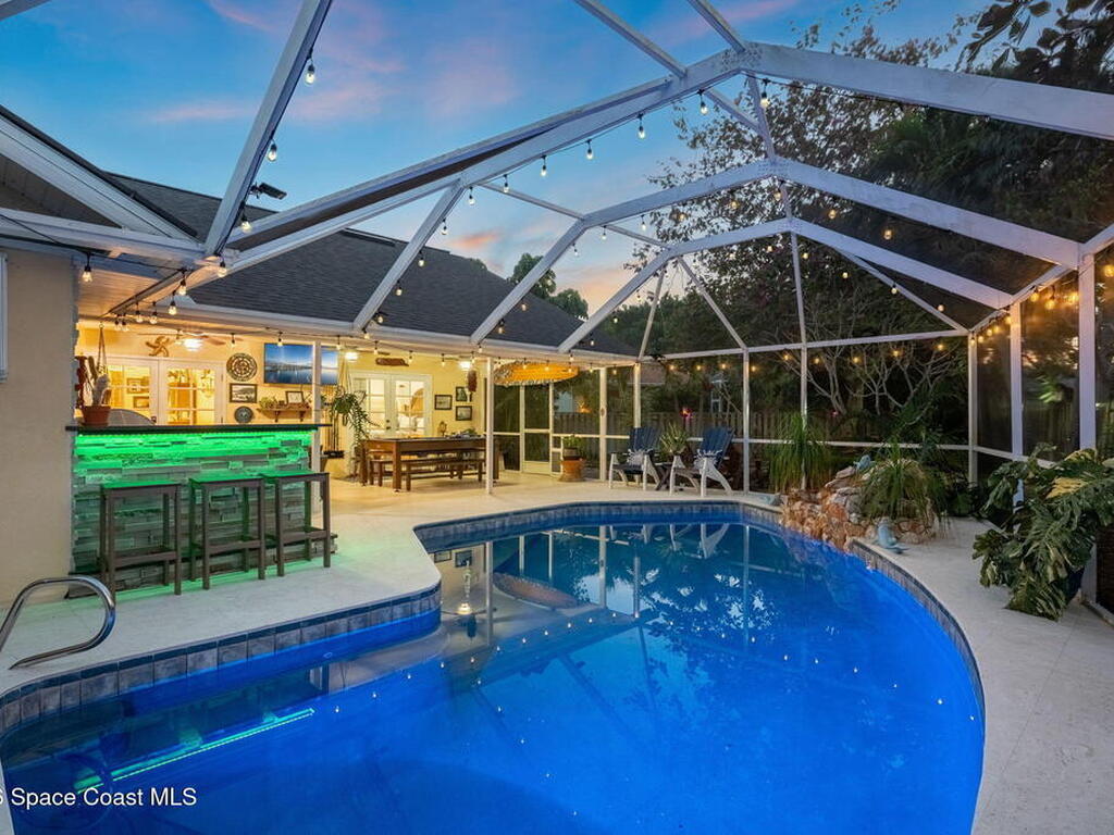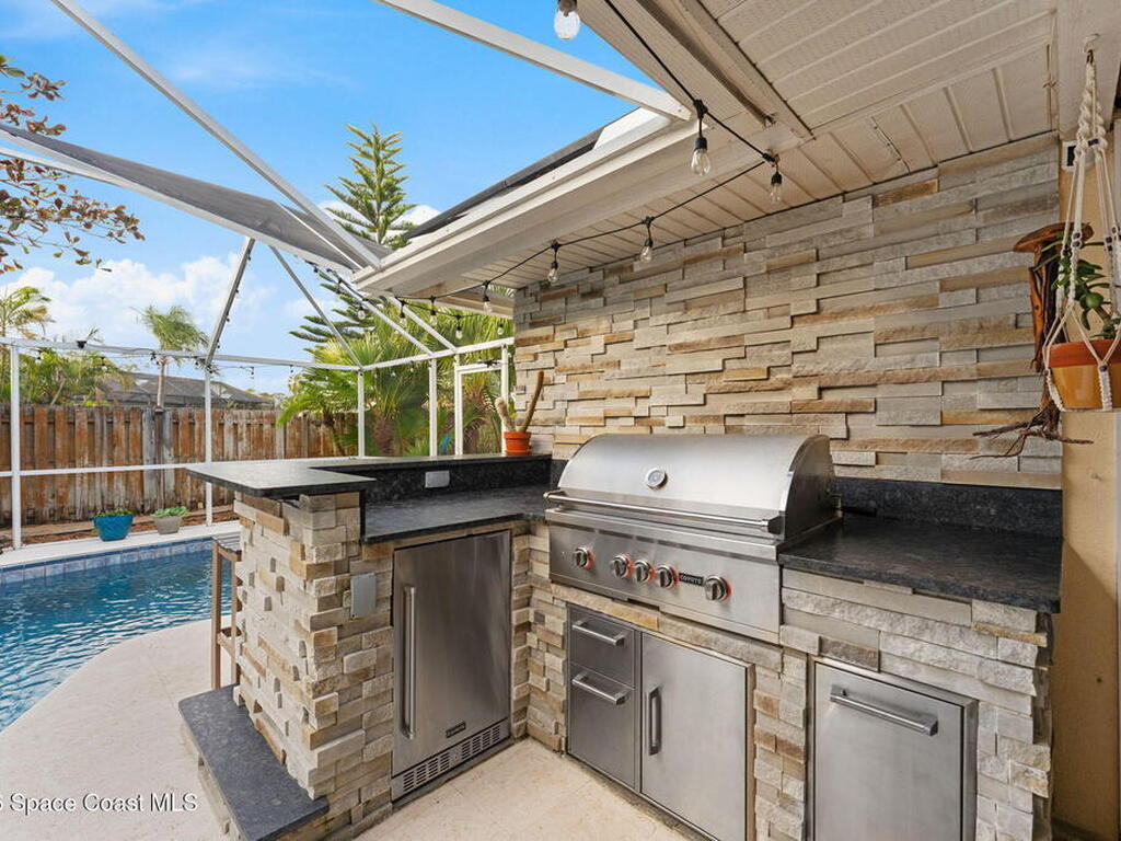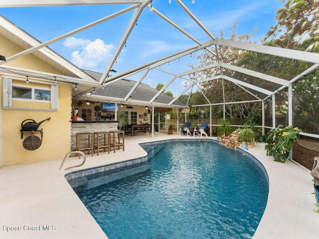 Welcome to Martesia, one of Indian Harbour Beach's most desirable communities, known for its scenic jogging trails, tennis and pickle courts, playground, gazebo, and proximity to the shoreline. This unique contemporary home features over six figures in custom designer upgrades. Past your 2-car garage you'll find the front door under the awning, and inside you will discover your formal dining to the left, and your living room to the right. Both ways open up to your chef's kitchen with solid wood cabinetry, 6-range gas stovetop with hood, double ovens, smart fridge, and natural stone island with wine fridge for entertaining. Your primary suite offers two walk-in closets, seperate vanities, walk-in shower, and large soaking tub. Enjoy the outdoors with the covered lanai, summer kitchen, pool, outdoor firepit garden beds, and mature jasmine tree. Roof 2023, Water Heater 2022, HVAC 2015 (Fan Replaced), and Category 5 Atlantic Hurricane Protection shutters and screens.