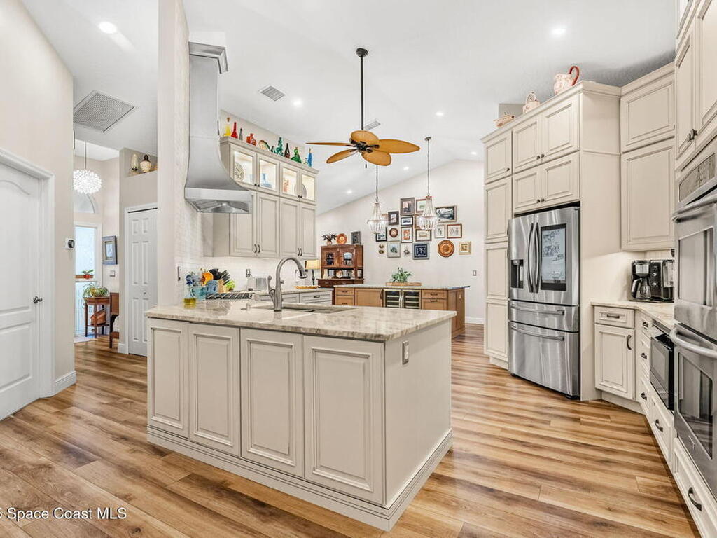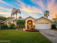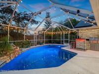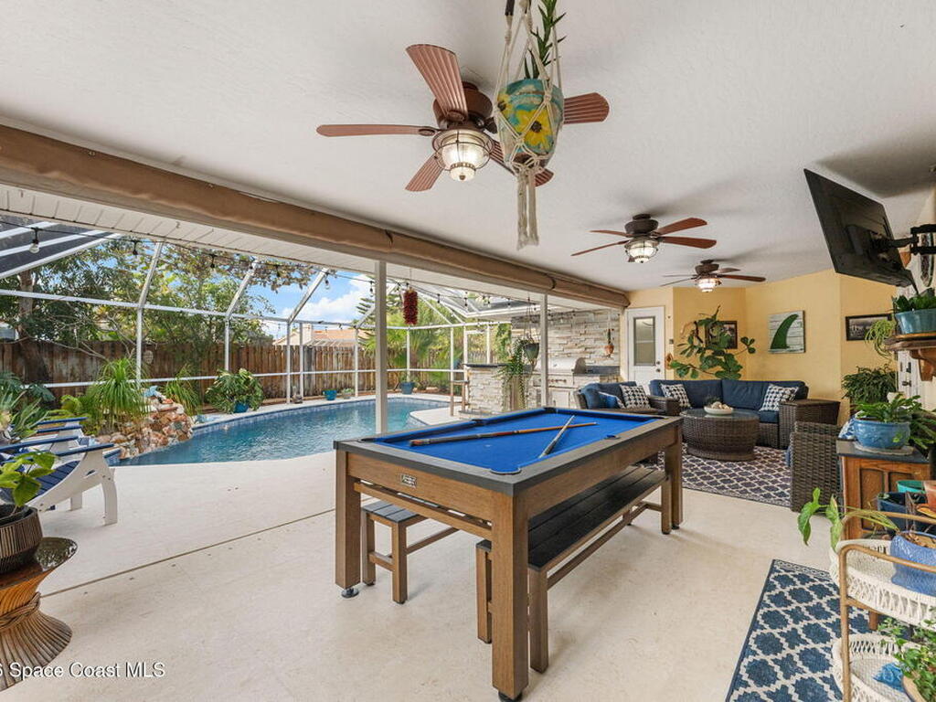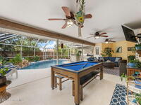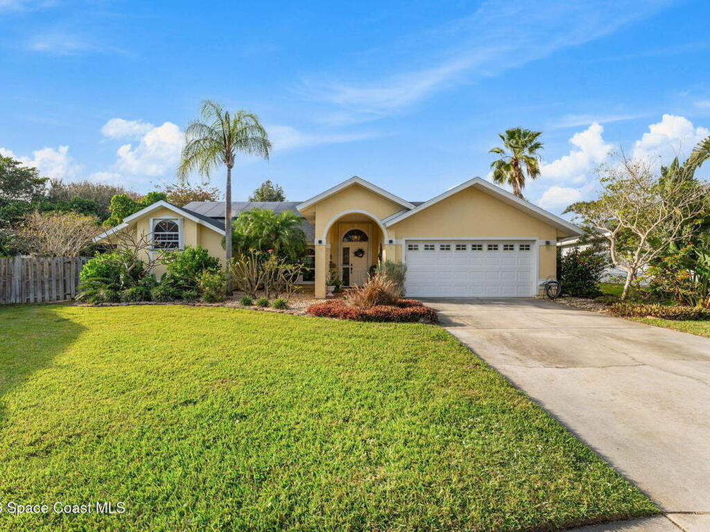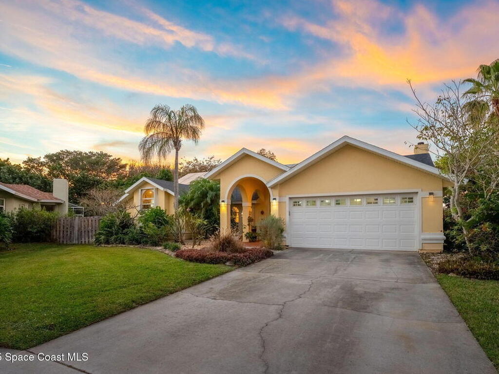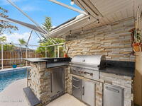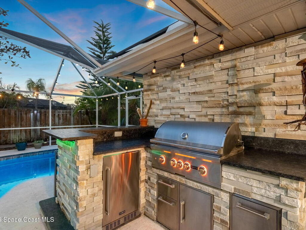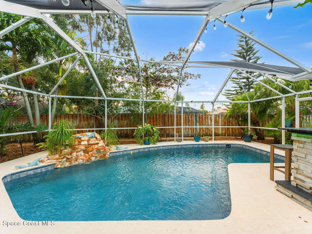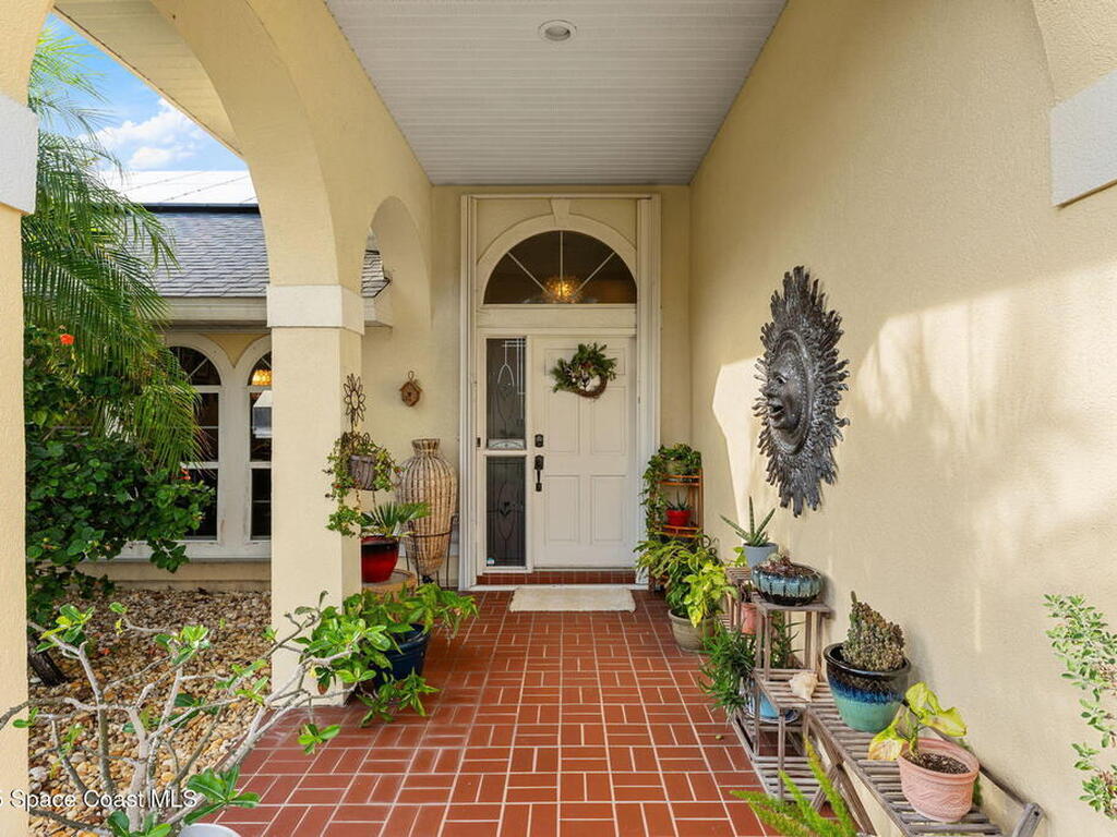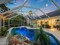 Welcome to Martesia, one of Indian Harbour Beach's most desirable communities, known for its scenic jogging trails, tennis and pickle courts, playground, gazebo, and proximity to the shoreline. This unique contemporary home features over six figures in custom designer upgrades. Past your 2-car garage you'll find the front door under the awning, and inside you will discover your formal dining to the left, and your living room to the right. Both ways open up to your chef's kitchen with solid wood cabinetry, 6-range gas stovetop with hood, double ovens, smart fridge, and natural stone island with wine fridge for entertaining. Your primary suite offers two walk-in closets, seperate vanities, walk-in shower, and large soaking tub. Enjoy the outdoors with the covered lanai, summer kitchen, pool, outdoor firepit garden beds, and mature jasmine tree. Roof 2023, Water Heater 2022, HVAC 2015 (Fan Replaced), and Category 5 Atlantic Hurricane Protection shutters and screens.