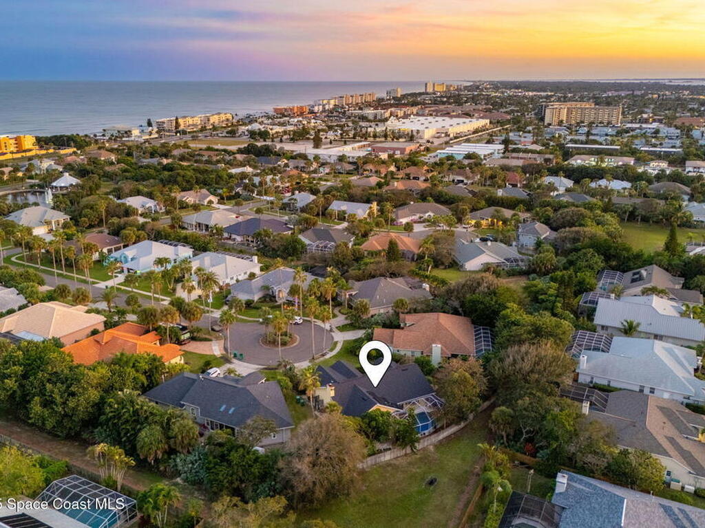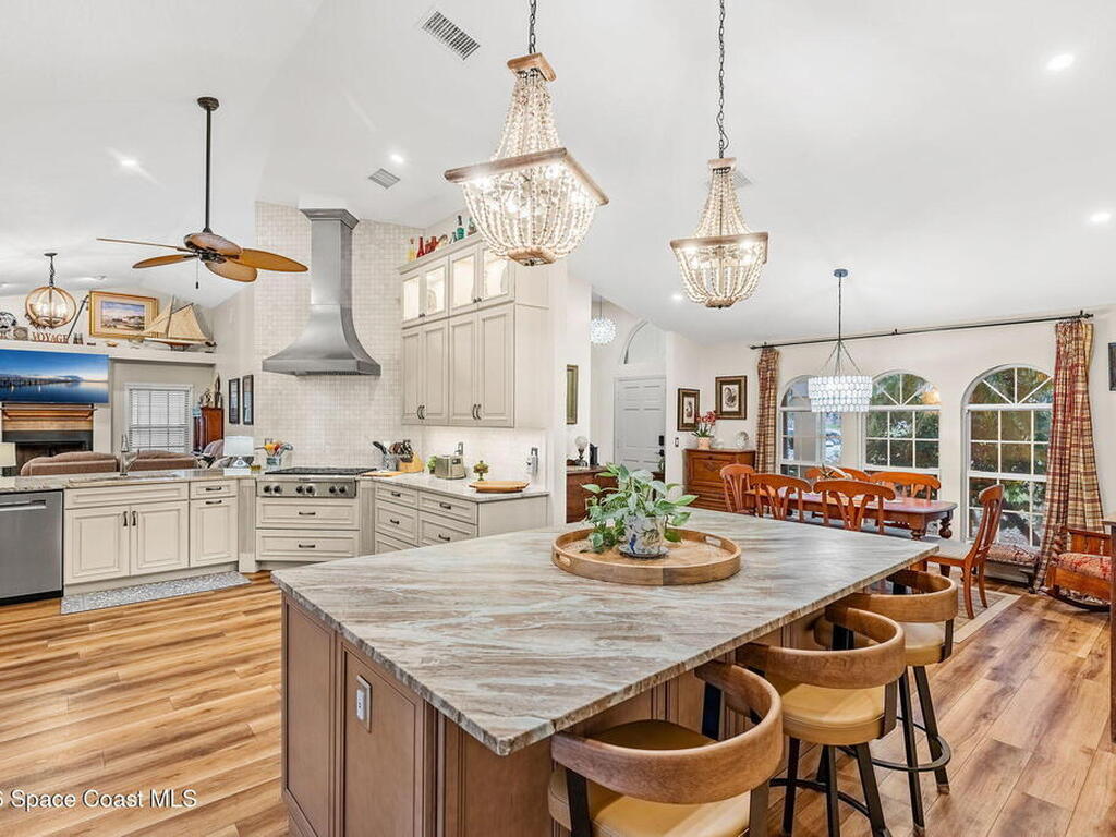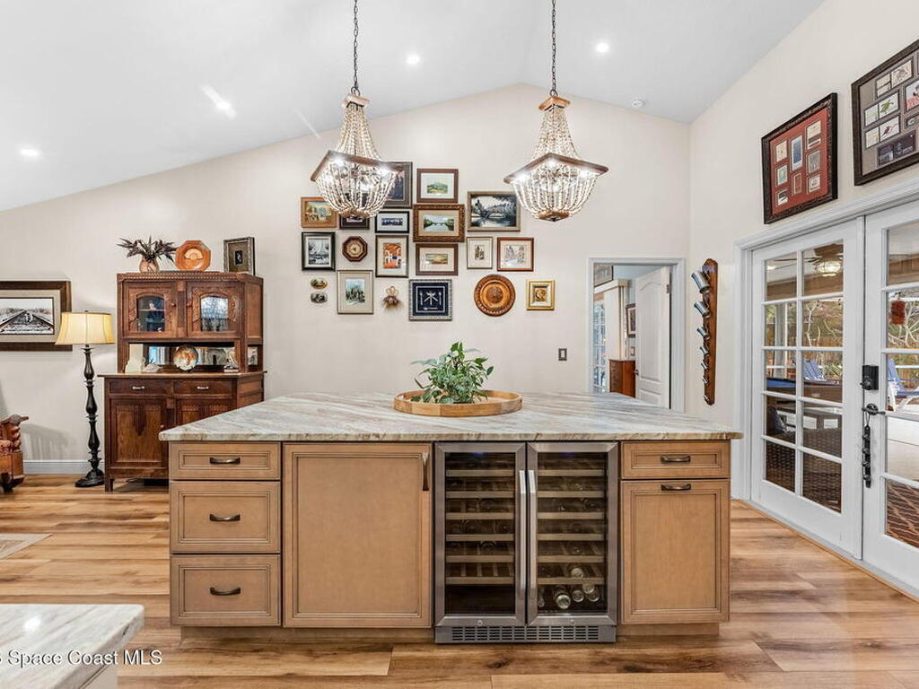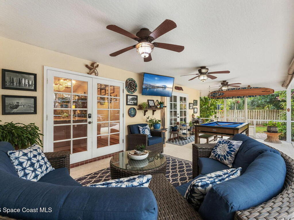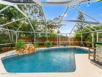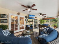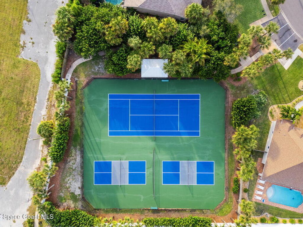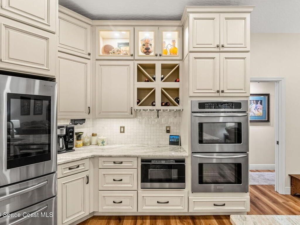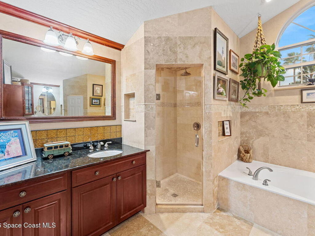 Welcome to Martesia, one of Indian Harbour Beach's most desirable communities, known for its scenic jogging trails, tennis and pickle courts, playground, gazebo, and proximity to the shoreline. This unique contemporary home features over six figures in custom designer upgrades. Past your 2-car garage you'll find the front door under the awning, and inside you will discover your formal dining to the left, and your living room to the right. Both ways open up to your chef's kitchen with solid wood cabinetry, 6-range gas stovetop with hood, double ovens, smart fridge, and natural stone island with wine fridge for entertaining. Your primary suite offers two walk-in closets, seperate vanities, walk-in shower, and large soaking tub. Enjoy the outdoors with the covered lanai, summer kitchen, pool, outdoor firepit garden beds, and mature jasmine tree. Roof 2023, Water Heater 2022, HVAC 2015 (Fan Replaced), and Category 5 Atlantic Hurricane Protection shutters and screens.