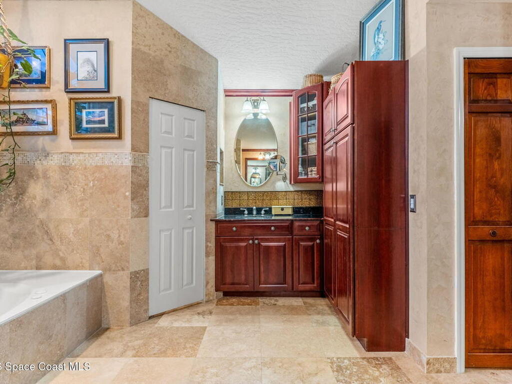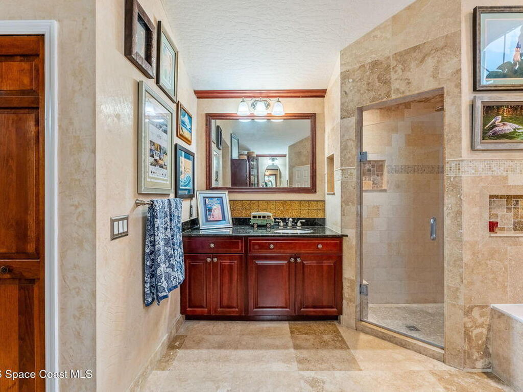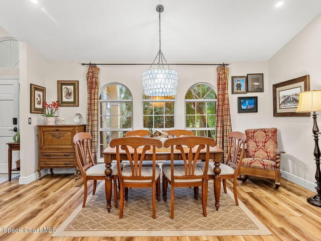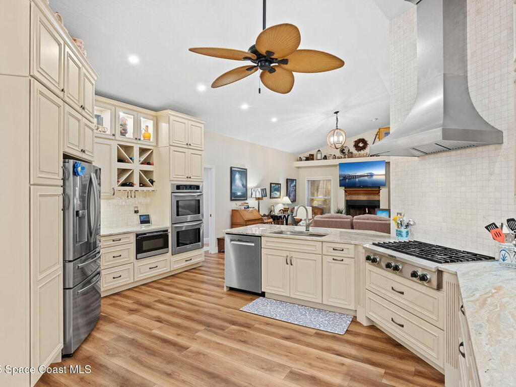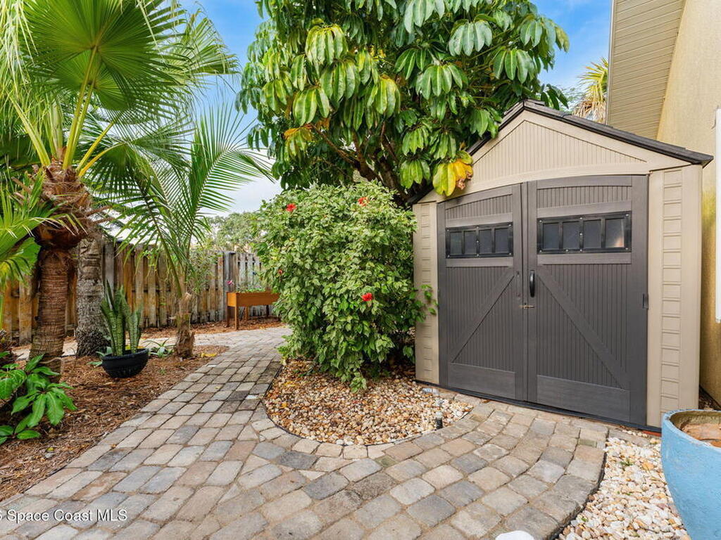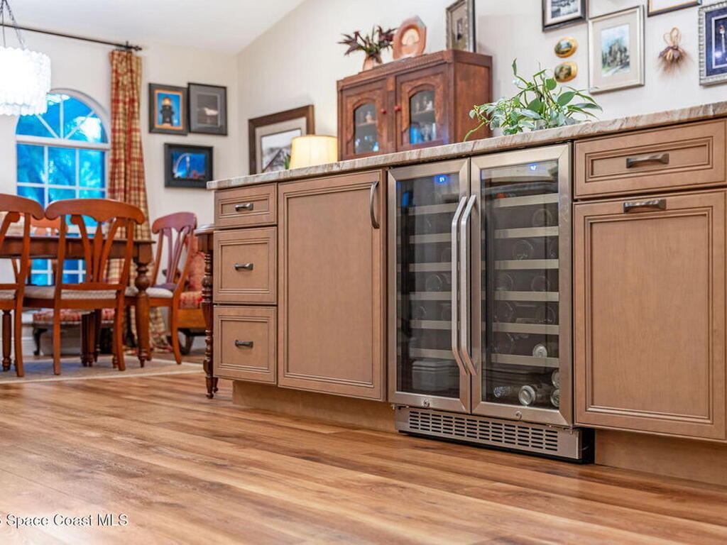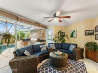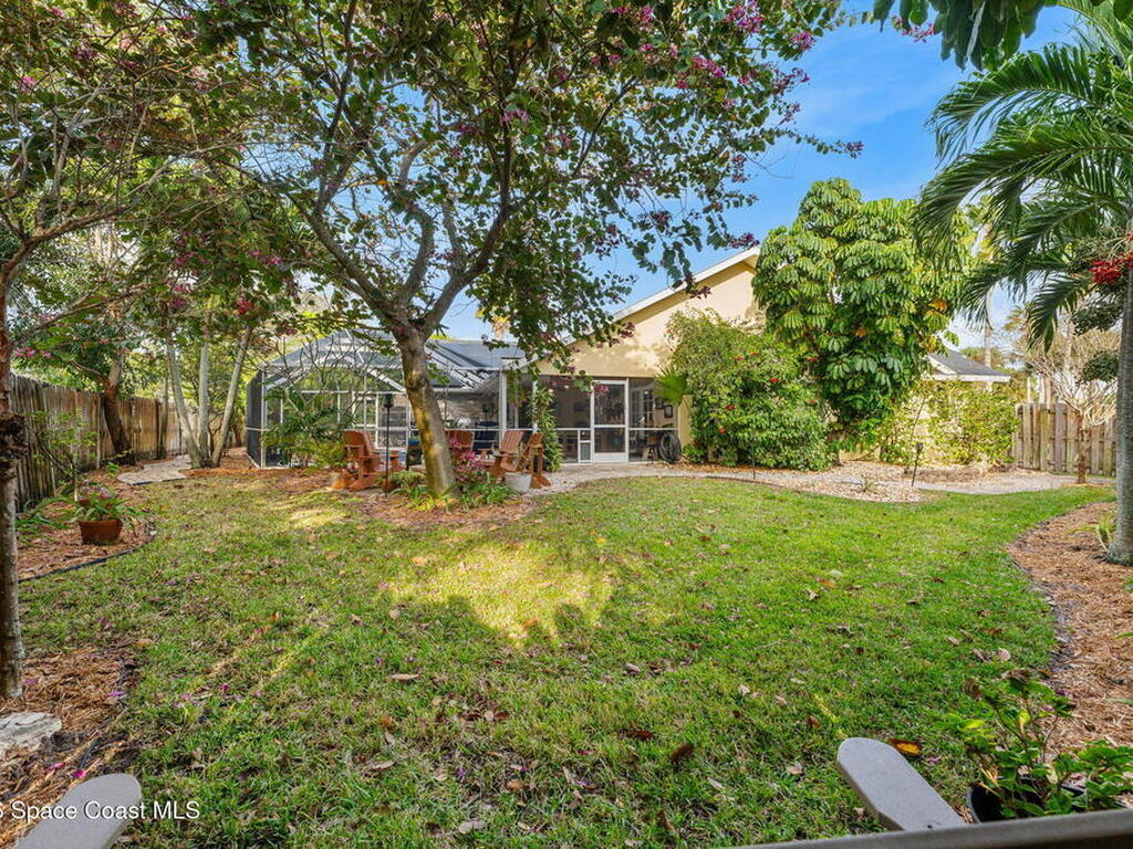 Welcome to Martesia, one of Indian Harbour Beach's most desirable communities, known for its scenic jogging trails, tennis and pickle courts, playground, gazebo, and proximity to the shoreline. This unique contemporary home features over six figures in custom designer upgrades. Past your 2-car garage you'll find the front door under the awning, and inside you will discover your formal dining to the left, and your living room to the right. Both ways open up to your chef's kitchen with solid wood cabinetry, 6-range gas stovetop with hood, double ovens, smart fridge, and natural stone island with wine fridge for entertaining. Your primary suite offers two walk-in closets, seperate vanities, walk-in shower, and large soaking tub. Enjoy the outdoors with the covered lanai, summer kitchen, pool, outdoor firepit garden beds, and mature jasmine tree. Roof 2023, Water Heater 2022, HVAC 2015 (Fan Replaced), and Category 5 Atlantic Hurricane Protection shutters and screens.