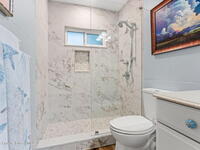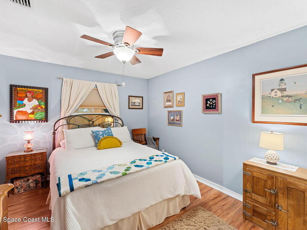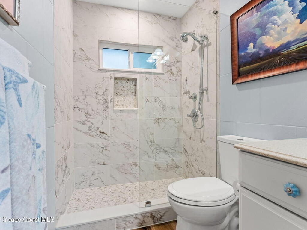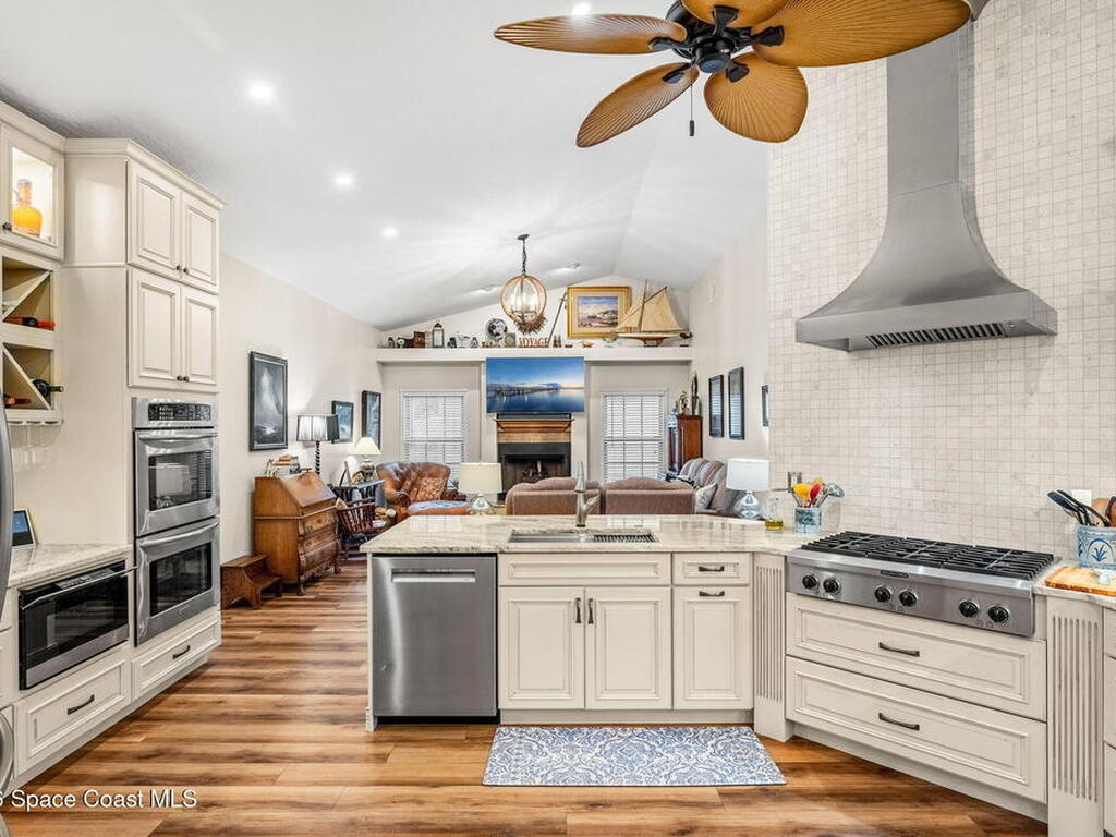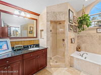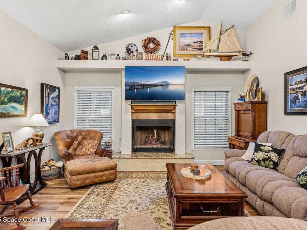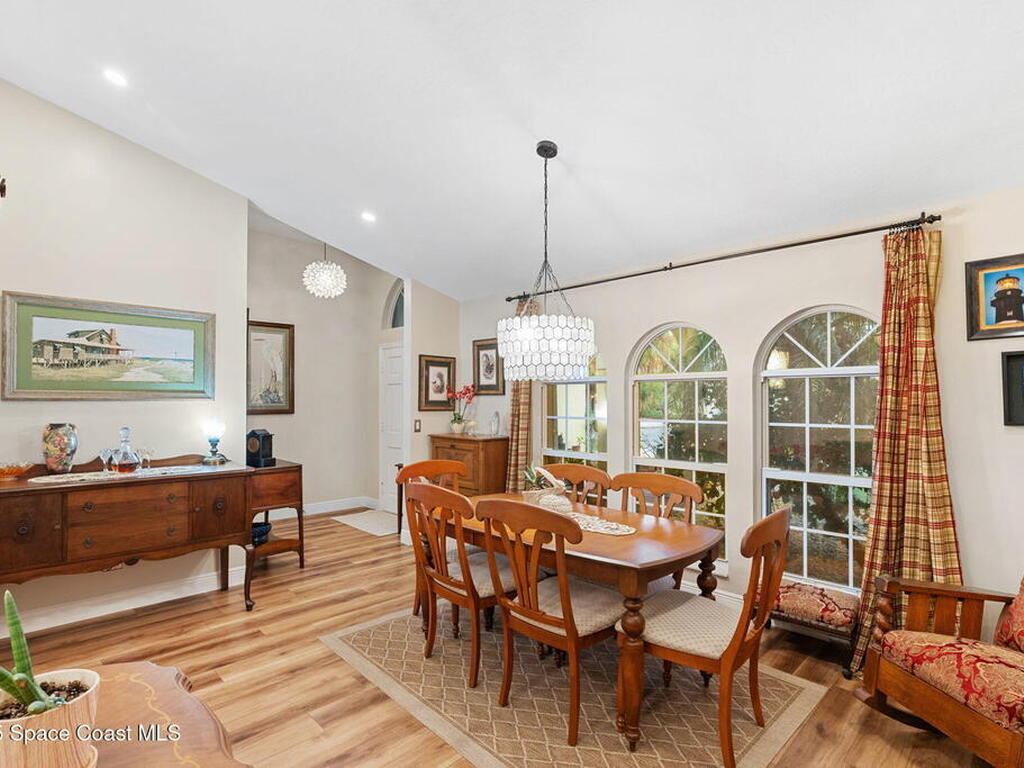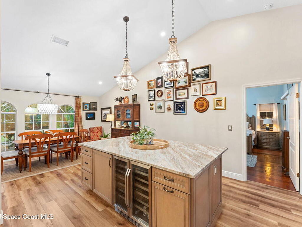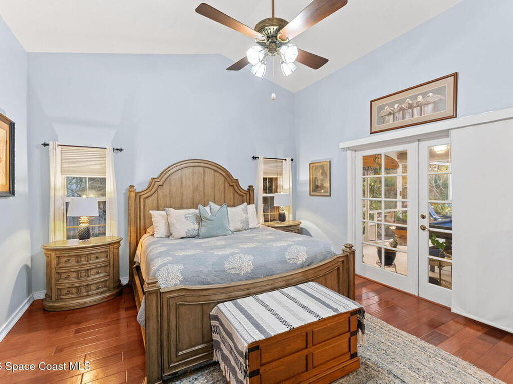 Welcome to Martesia, one of Indian Harbour Beach's most desirable communities, known for its scenic jogging trails, tennis and pickle courts, playground, gazebo, and proximity to the shoreline. This unique contemporary home features over six figures in custom designer upgrades. Past your 2-car garage you'll find the front door under the awning, and inside you will discover your formal dining to the left, and your living room to the right. Both ways open up to your chef's kitchen with solid wood cabinetry, 6-range gas stovetop with hood, double ovens, smart fridge, and natural stone island with wine fridge for entertaining. Your primary suite offers two walk-in closets, seperate vanities, walk-in shower, and large soaking tub. Enjoy the outdoors with the covered lanai, summer kitchen, pool, outdoor firepit garden beds, and mature jasmine tree. Roof 2023, Water Heater 2022, HVAC 2015 (Fan Replaced), and Category 5 Atlantic Hurricane Protection shutters and screens.