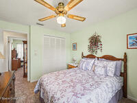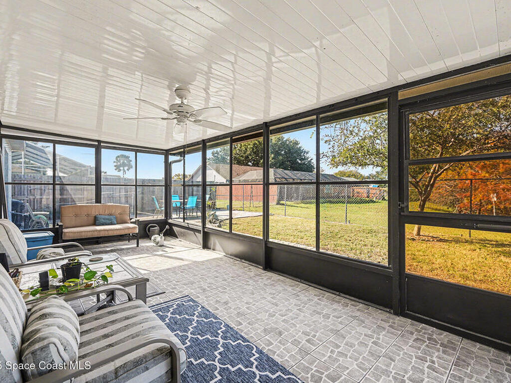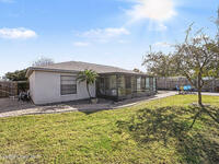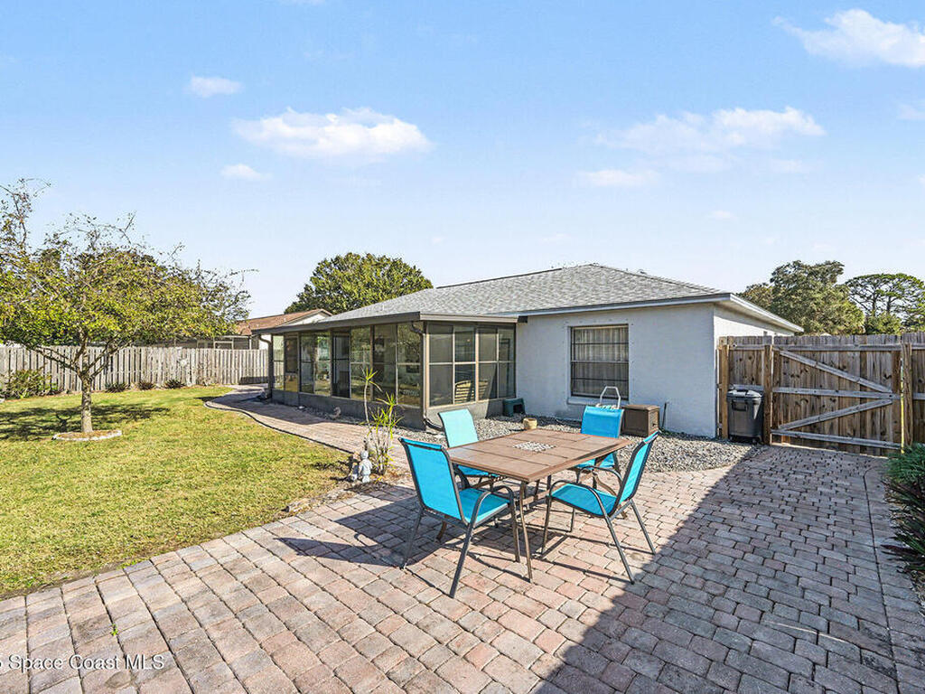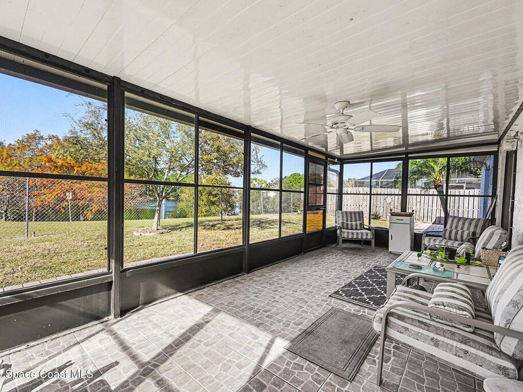 This charming 3-bedroom, 2-bath home offers 1, 436 square feet of thoughtfully designed living space that feels larger than its footprint. A desirable split-bedroom floor plan provides privacy, with the primary suite featuring a dedicated vanity area, double sinks, and a tiled shower. Two additional bedrooms and a full bath are located on the opposite side of the living area--perfect for family, guests, or a home office.Step outside to a spacious screened back porch overlooking a tranquil lake, where glass windows can be opened to enjoy cool breezes or closed for year-round comfort. The outdoor space continues with a brick-paver patio, extra parking pad, and a fenced backyard. Peaceful water views, combined with convenient access to area beaches and the Kennedy Space Center, make this home an exceptional choice. Recent updates including a 2020 roof, 2022 A/C, and 2020 water heater offer comfort and peace of mind.