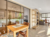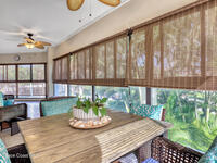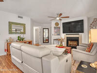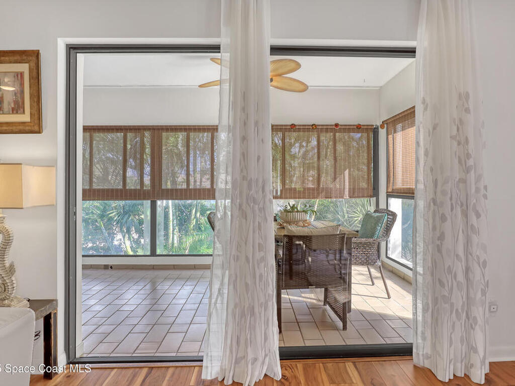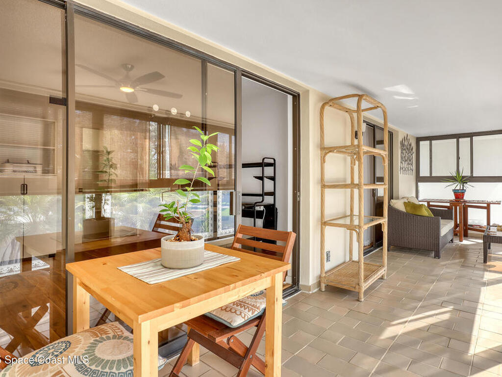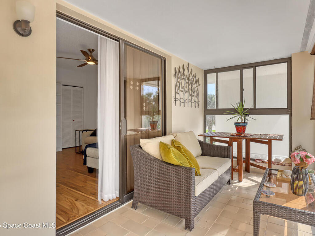 THIS IS NOT YOUR TYPICAL BARRIER ISLAND CONDO LOCATED IN THE MUCH-SOUGHT-AFTER AQUARINA BEACH & COUNTRY CLUB OCEAN-TO RIVER BEACH RESORT COMMUNITY! FULLY FURNISHED with 3 bedrooms, 2 & a half baths, large living room with wood-burning FP, spacious primary suite, walk-in closets, wet bar & wrap-around glassed-in porches offering stunning tropical views from every room. This unit is full of upgrades! New LVP flooring, updated kitchen cabinets with new quartz countertops & new appliances. New paid for roof & community pool! Thoughtfully appointed bohemian-chic decor & modern furniture with everything you need to live your BEST FLORIDA LIFE right here-right down to 3 high-end tvs & orbi wireless mesh network. An extra-long detached garage provides storage for all of your beach toys including the negotiable golf cart. Community amenities include Golf & Tennis clubs with limited play included, Beach Club with private beach access, fitness center, boat launch & fishing dock, restaurant.