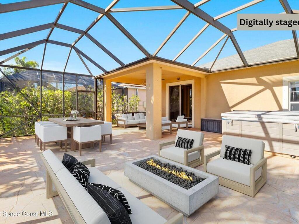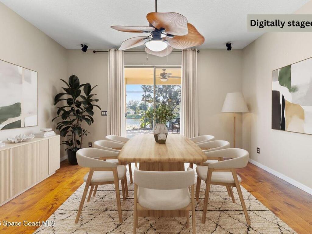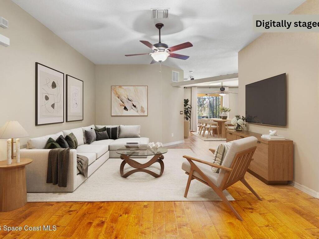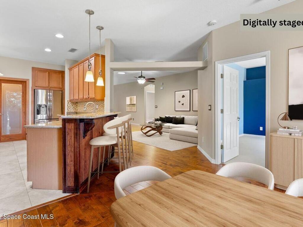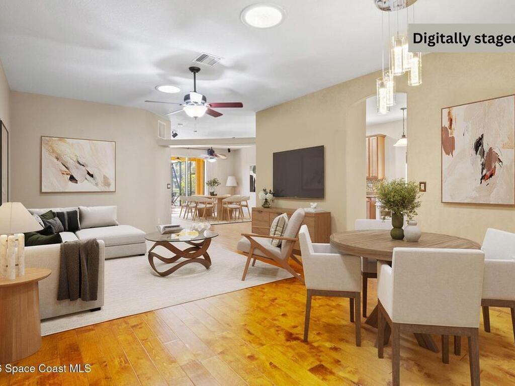 Immaculate lakefront home in highly desirable West Viera. An open-concept design w/ vaulted ceilings & gleaming wood floors in the living, dining, & front bdrm. The spacious great room flows into a large casual dining area, perfect for entertaining. The chef's kitchen features tall cabinets, SS appliances, generous counter space, a breakfast bar, a movable island, & a walk-in pantry. The owner's suite offers his & her closets, elegant vanity w/ extra storage, granite counters, & a glass-enclosed shower. Two other bdrms share the guest bath, also w/ granite counters. Sliding doors lead to the large screened porch w/ serene water views & no rear neighbors. A sprinkler system keeps the front & back lawns lush year-round. The roof was replaced in 2020. Located in one of Brevard's most desirable neighborhoods, this home is minutes from A+ schools, shopping, dining, golf, & parks. Residents have access to a fantastic community pool, clubhouse, & sports courts, including tennis & basketball