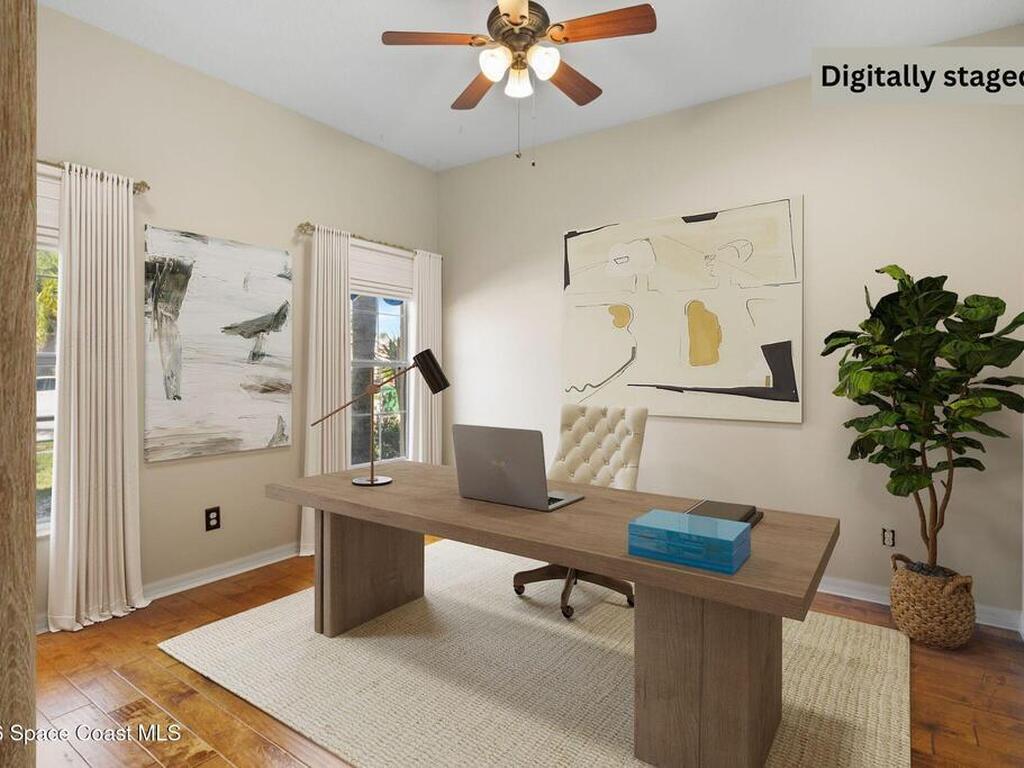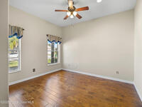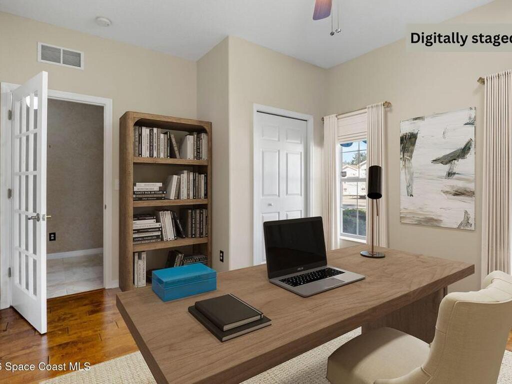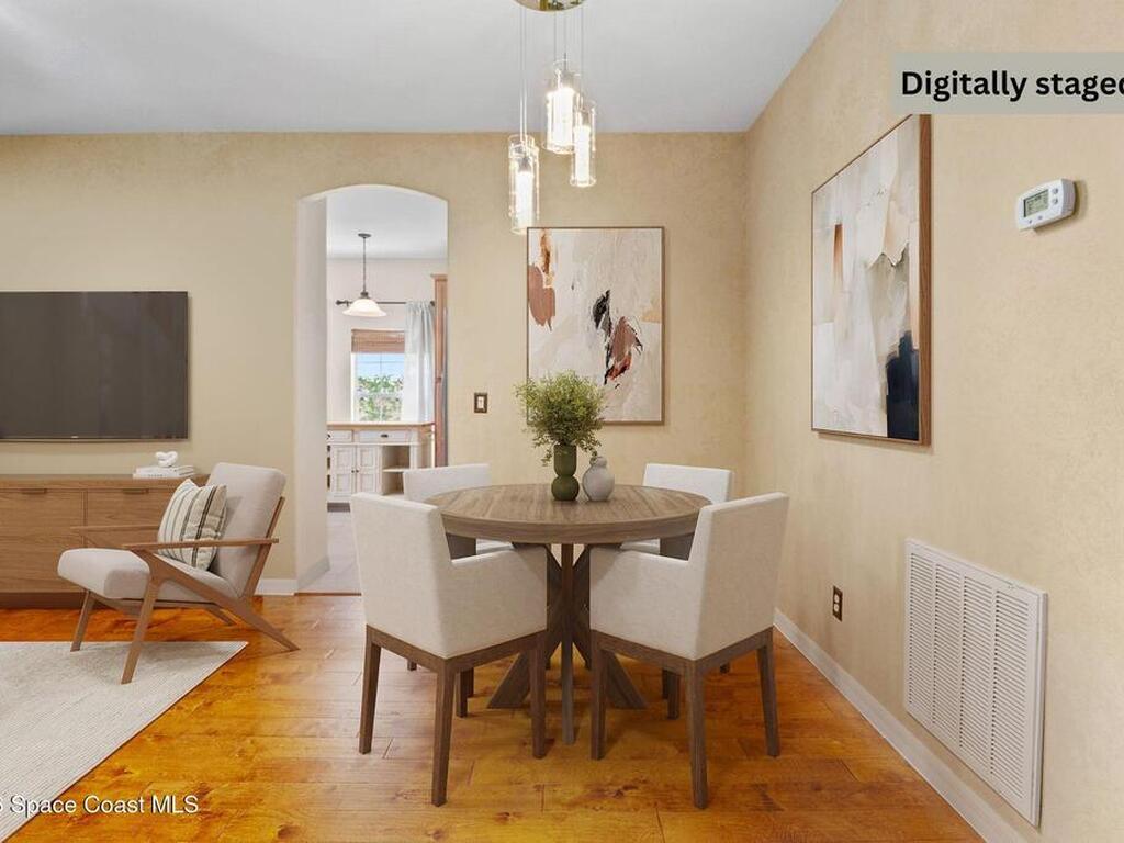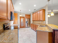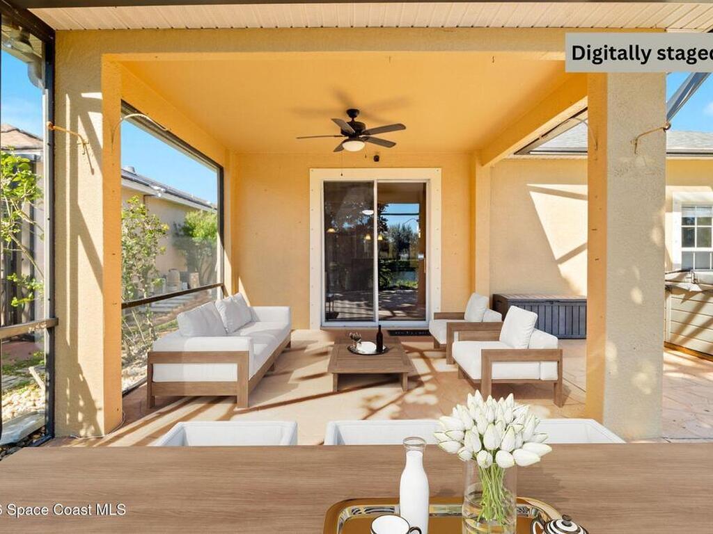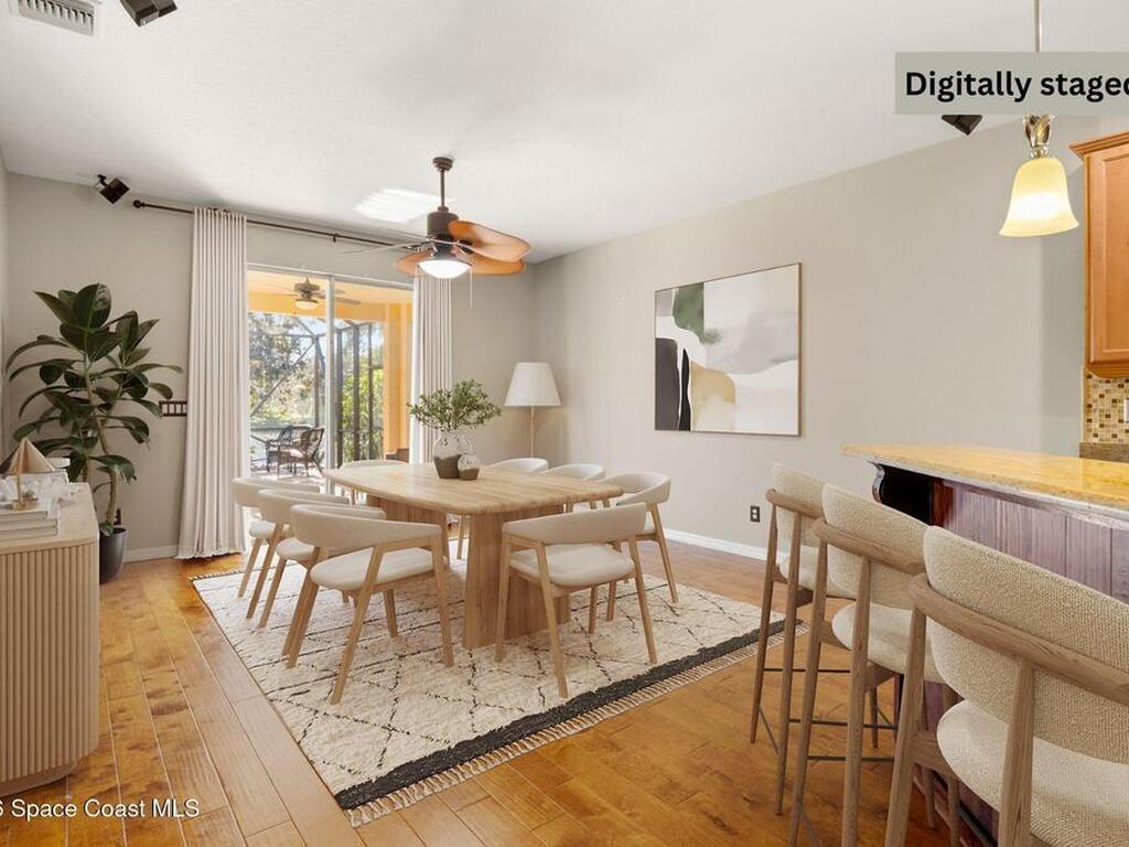Immaculate lakefront home in highly desirable West Viera. An open-concept design w/ vaulted ceilings & gleaming wood floors in the living, dining, & front bdrm. The spacious great room flows into a large casual dining area, perfect for entertaining. The chef's kitchen features tall cabinets, SS appliances, generous counter space, a breakfast bar, a movable island, & a walk-in pantry. The owner's suite offers his & her closets, elegant vanity w/ extra storage, granite counters, & a glass-enclosed shower. Two other bdrms share the guest bath, also w/ granite counters. Sliding doors lead to the large screened porch w/ serene water views & no rear neighbors. A sprinkler system keeps the front & back lawns lush year-round. The roof was replaced in 2020. Located in one of Brevard's most desirable neighborhoods, this home is minutes from A+ schools, shopping, dining, golf, & parks. Residents have access to a fantastic community pool, clubhouse, & sports courts, including tennis & basketball