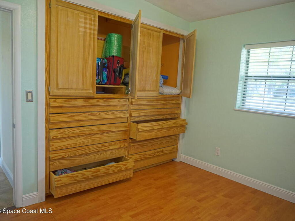 Welcome to your new Melbourne home with no deed restrictions or HOA fees. This 3 bedroom, 2 bathroom home sits on a large .36 acre fenced in lot, with multiple mature trees for shady relief from the FL sun. The front yard can hold plenty of vehicles on it's double driveway, and the backyard has both an attached tool room and a detached 8x10 shed. Inside this home you'll notice tons of additional built in storage throughout, along with 3 handy murphy beds. Thousands of dollars of items are also included with this home purchase, such as a stackable washer and dryer, 8kw generator, surround sound speaker system, ring doorbell and a tool shed full of bonus items including a chainsaw, leaf blower, step ladders, etc. The roof is only 5 years old, the electric panel has been updated, double pane windows installed, and hurricane shutters all around. This home is well located, just minutes from downtown Melbourne, the beaches, Northrop Grumman and the mall, and not far from Patrick Base.