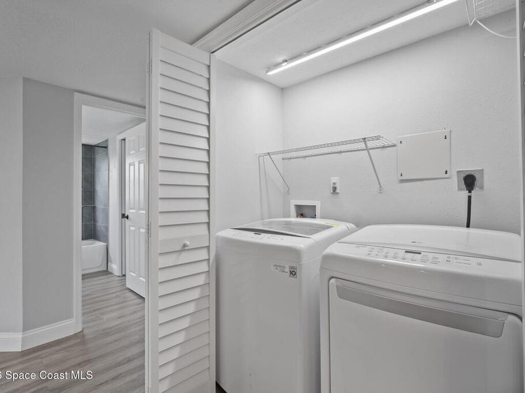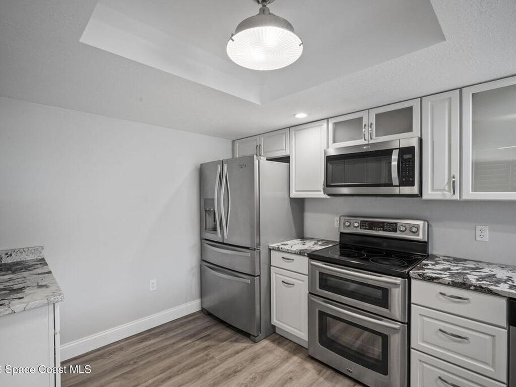 An absolutely beautiful beachside condo in the heart of S. Cocoa Beach. This turn key condo blends beach living with convenience. Enjoy a rare bonus with PRIVATE GARAGE and easy access to resort-style amenities, including clubhouse, tennis courts, 3 pools, and even private trailer/RV storage. Just a short walk to downtown Cocoa Beach for dining and entertainment. Or launch you boat/kayak next door at Ramp Road. Inside the condo is bright and airy with matching vinyl floors throughout, tons of natural light, and hurricane shutters on all windows and patio for peace of mind. The split floor plan provides privacy, featuring a fully renovated primary suite w/ walk-in shower, soaking tub, and oversized closet. The spacious kitchen shines with high end granite counters, matching stainless appliances & pantry space. Two comfortable guest bedrooms share a completely updated second bath, making this home ideal for a full-time residence or weekend getaway!