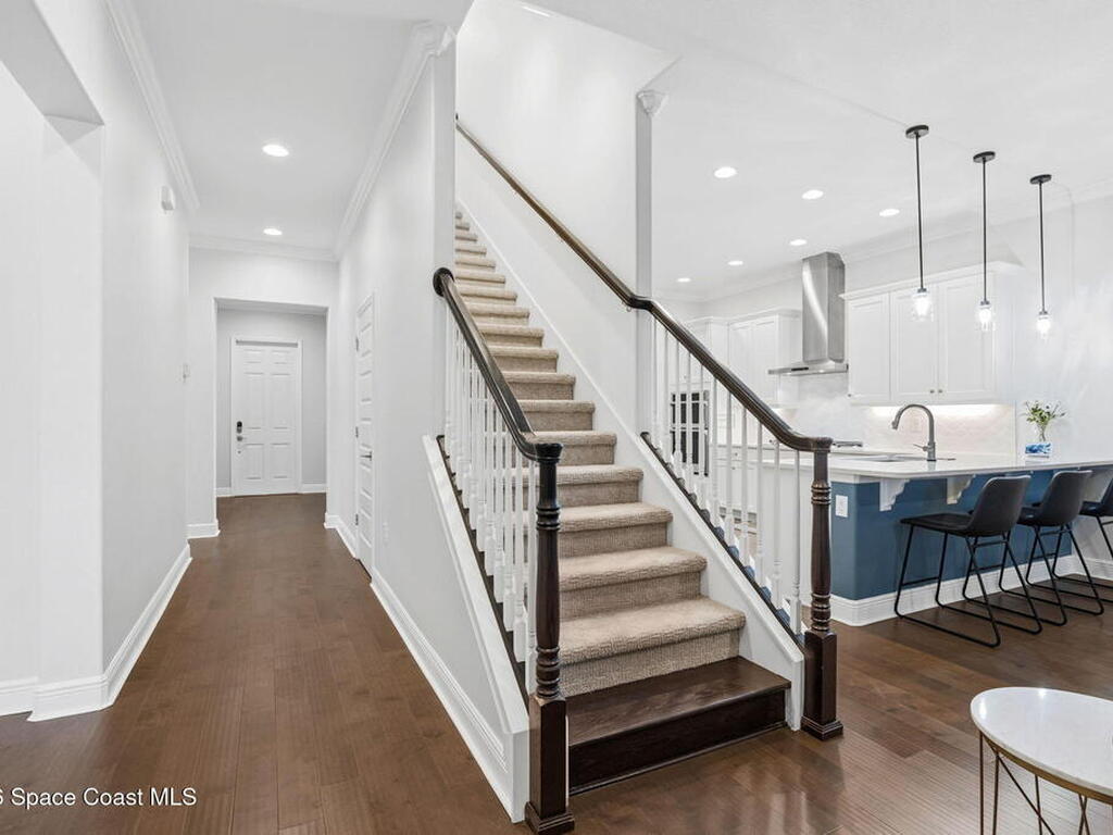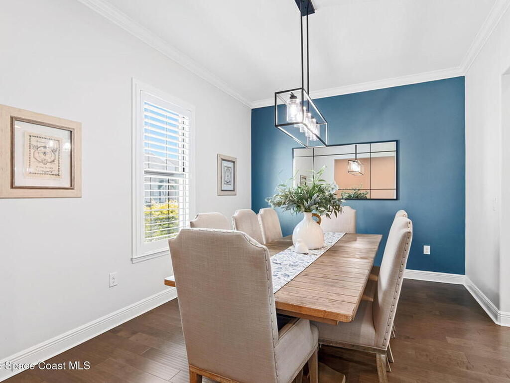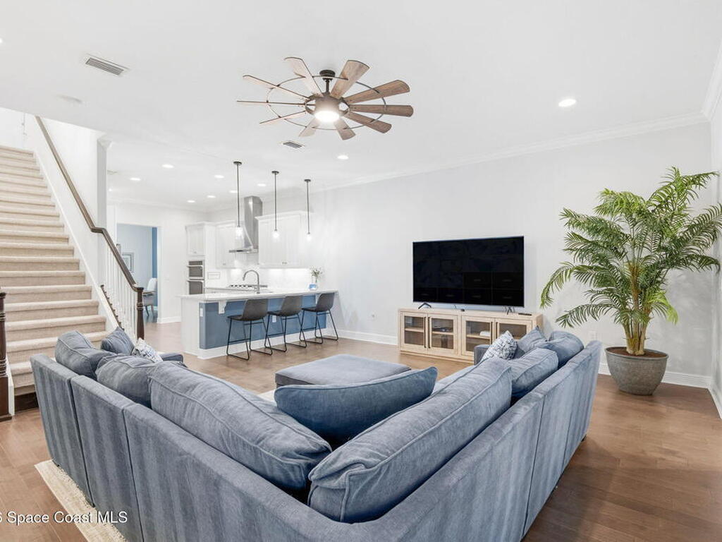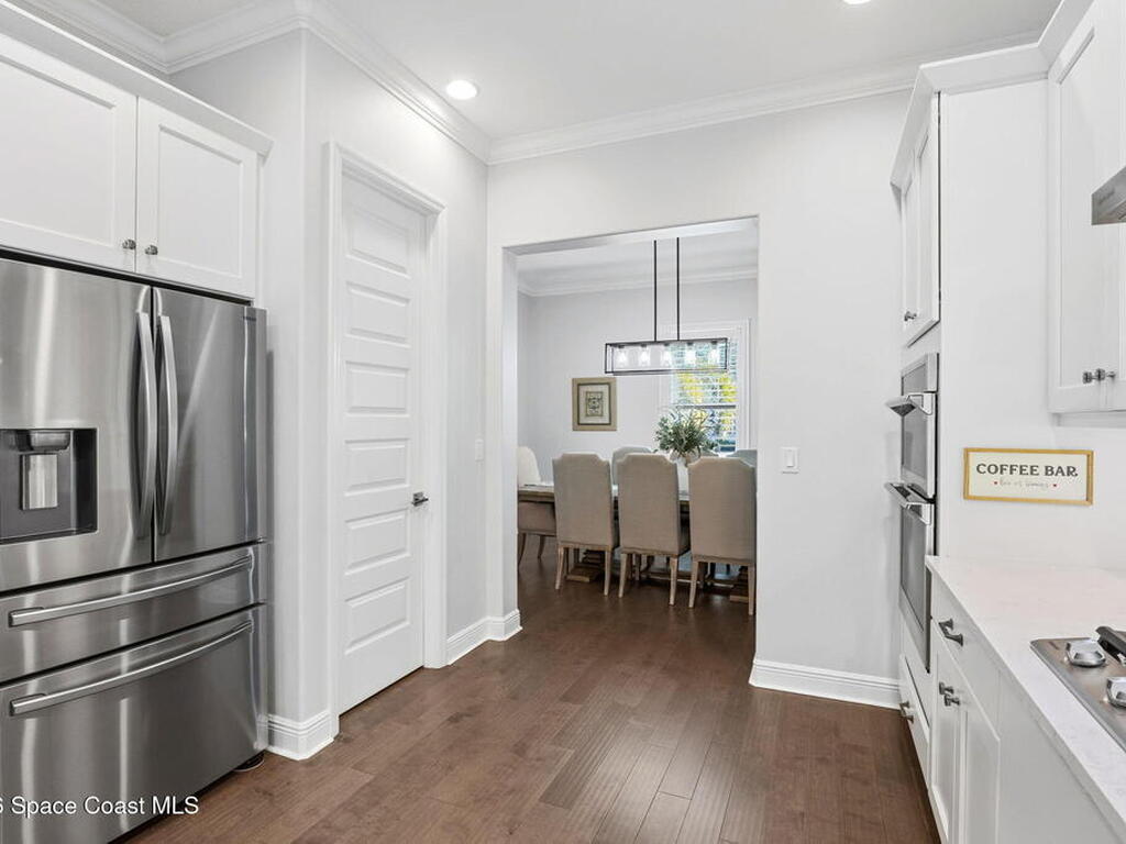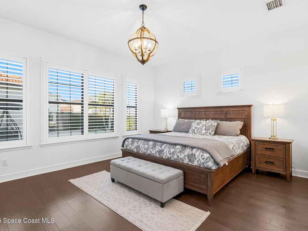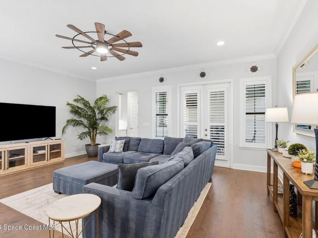 Welcome to maintenance free living in Viera. Impeccably maintained and thoughtfully upgraded, this stunning Almeria model offers 4 bedrooms, 3 full bathrooms, and approximately 2, 601 square feet of well-designed living space on a premium corner lot. One of the home's most distinctive features is its private, fenced courtyard, complete with puppy picket fencing, mature clusia privacy hedges, and a generous dog run, creating an ideal setting for pet lovers while providing exceptional privacy for relaxing or entertaining. nside, pride of ownership is immediately evident. The entire first floor showcases upgraded engineered hardwood flooring, enhanced by 8-foot doors, 10-foot ceilings, crown molding, plantation shutters, recessed lighting, and quality ceiling fans throughout. The spacious family room flows seamlessly to the screened lanai, which is already equipped with a natural gas hookup for a future summer kitchen or grill, plus plumbing in place for a sink, making outdoor