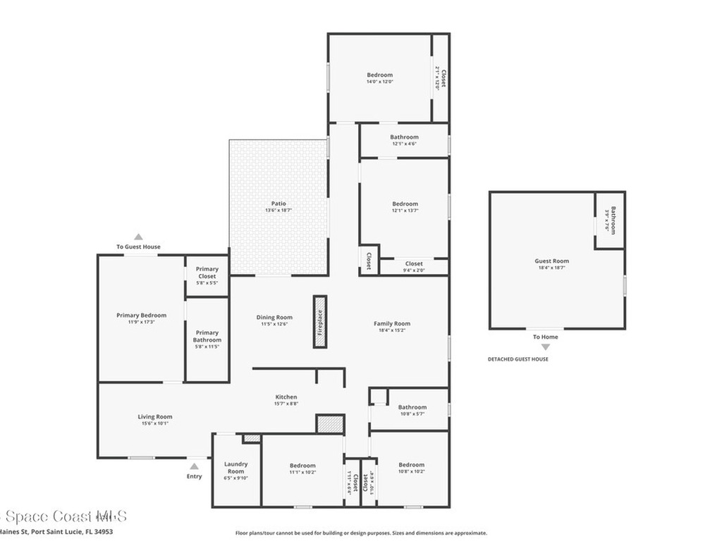 Experience refined comfort in this exceptional Port St Lucie residence crafted for flexible, elevated living. The expansive layout includes a 5 bed 3 bath main home complemented by a private 1 bed 1 bath guest house with its own entrance and private kitchen, ideal for multigenerational households, a private work from home retreat, or rental income. Light filled interiors offer generous spaces with hard flooring throughout, and are anchored by a distinctive walk around fireplace with mid century modern appeal that adds architectural character and warmth. Premium upgrades include a 2019 metal roof, impact windows and doors, newer AC systems, updated kitchen with newer appliances, upgraded ceiling fans and lighting, and a privacy fenced yard. With no HOA and a thoughtfully designed layout, this home delivers elegance, versatility, and opportunity in one remarkable offering.