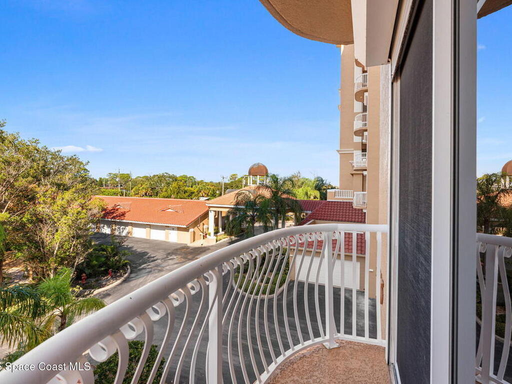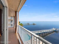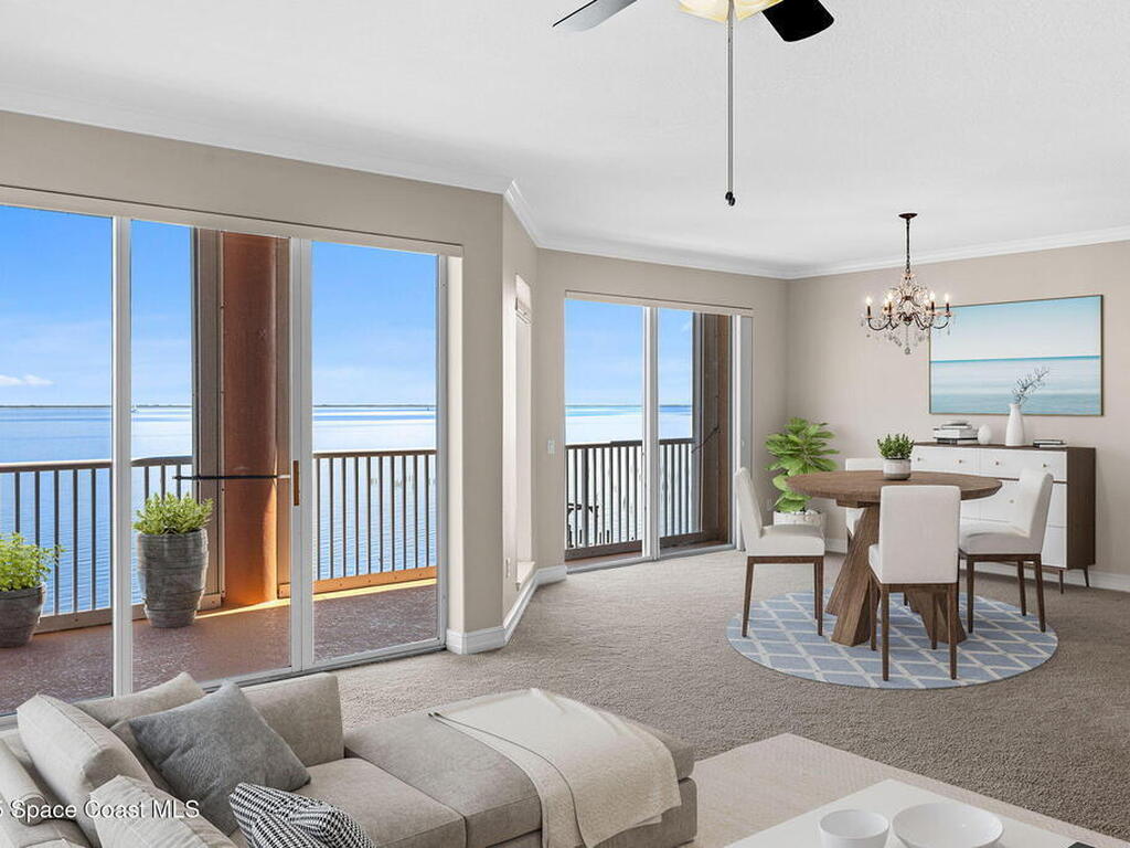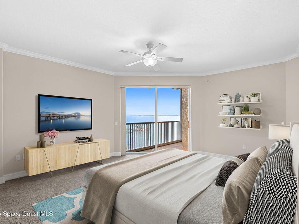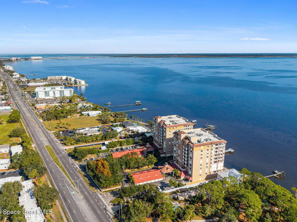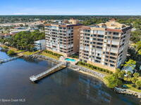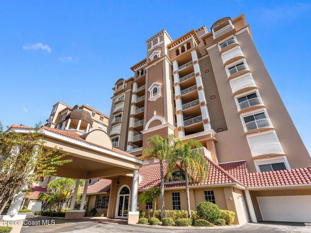 OUTSTANDING VIEWS across the Indian River with a literal front-row seat to the Kennedy Space Center--this riverfront corner unit puts every launch on full display! A brand-new roof, fresh interior paint, and a spotless, light-filled interior set the tone, while multiple sliders from the generous living and formal dining areas open to a wide balcony that captures those unbeatable water vistas. A columned formal living room creates an impressive entry moment, and the kitchen delivers with granite surfaces, breakfast bar, breakfast nook, and modern appliances. The primary suite elevates everyday living with private balcony access, two walk-in closets, a jetted tub, separate tiled shower, and dual sinks. Both guest bedrooms sit near full baths, and one even features a charming Juliet balcony facing lush palms. Added perks include washer and dryer, a gated community with interior lobby and elevators, plus a community pool, clubhouse, and dock for the complete waterfront lifestyle.