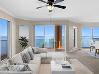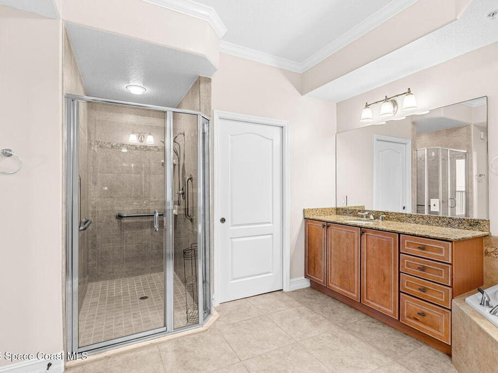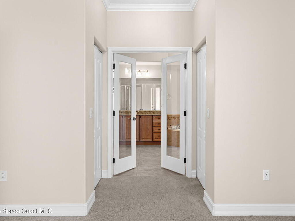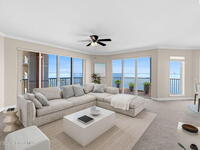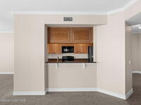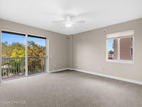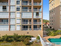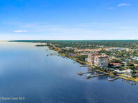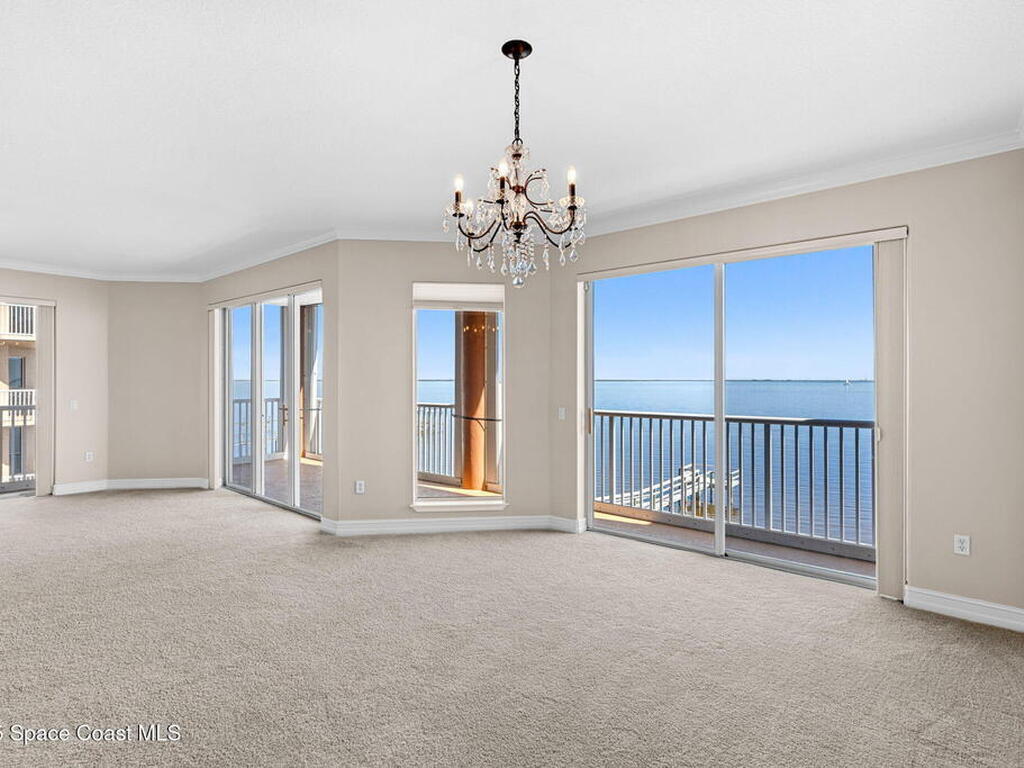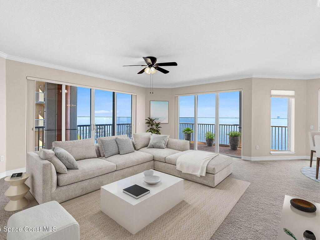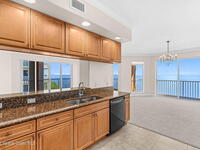 OUTSTANDING VIEWS across the Indian River with a literal front-row seat to the Kennedy Space Center--this riverfront corner unit puts every launch on full display! A brand-new roof, fresh interior paint, and a spotless, light-filled interior set the tone, while multiple sliders from the generous living and formal dining areas open to a wide balcony that captures those unbeatable water vistas. A columned formal living room creates an impressive entry moment, and the kitchen delivers with granite surfaces, breakfast bar, breakfast nook, and modern appliances. The primary suite elevates everyday living with private balcony access, two walk-in closets, a jetted tub, separate tiled shower, and dual sinks. Both guest bedrooms sit near full baths, and one even features a charming Juliet balcony facing lush palms. Added perks include washer and dryer, a gated community with interior lobby and elevators, plus a community pool, clubhouse, and dock for the complete waterfront lifestyle.