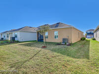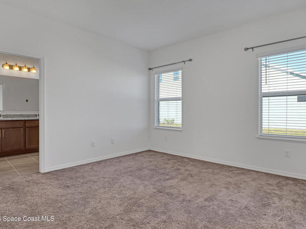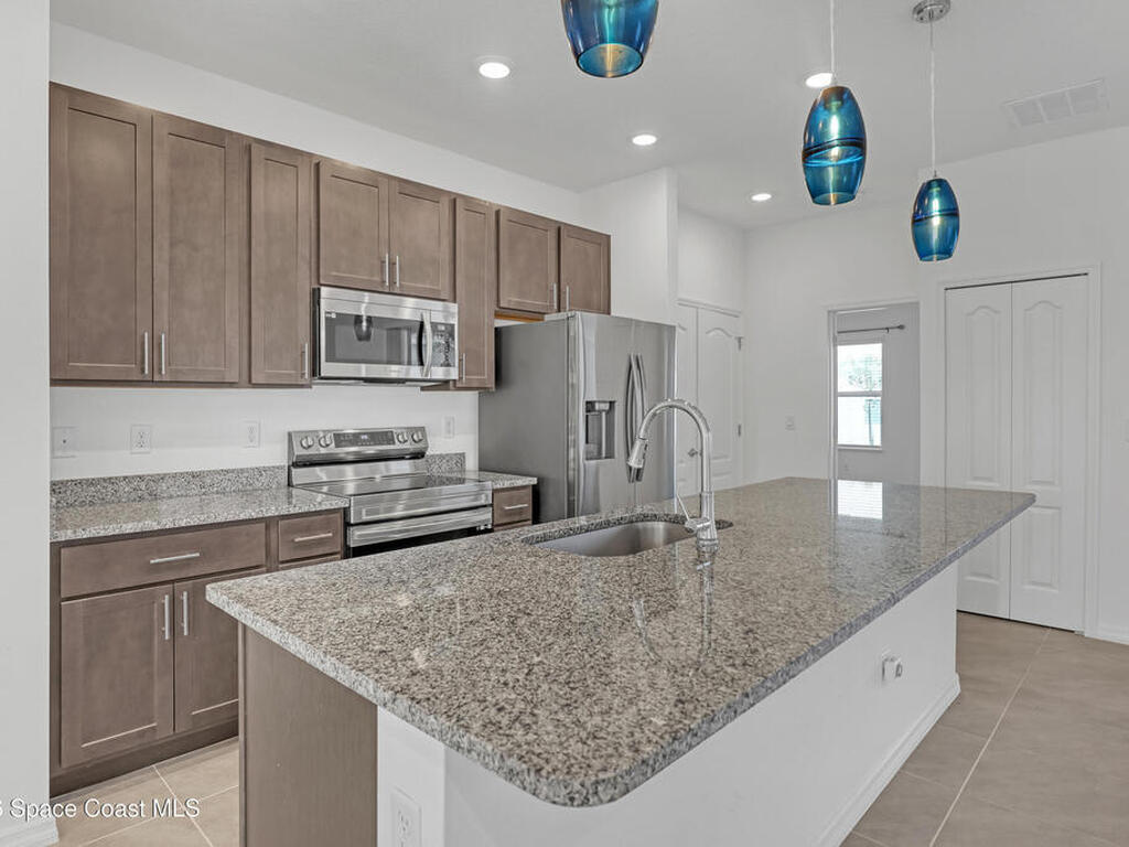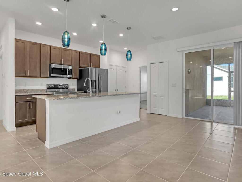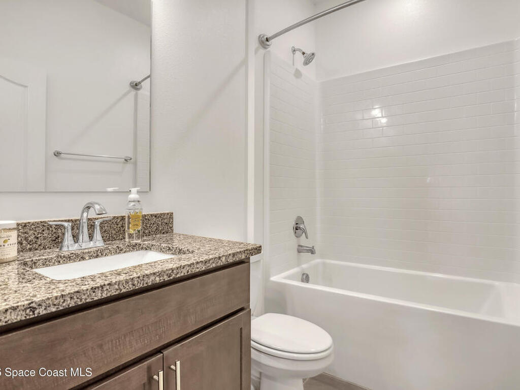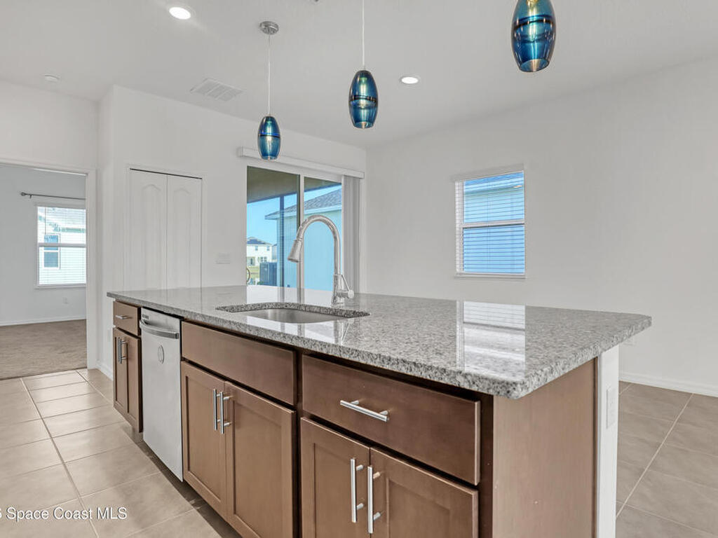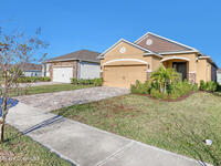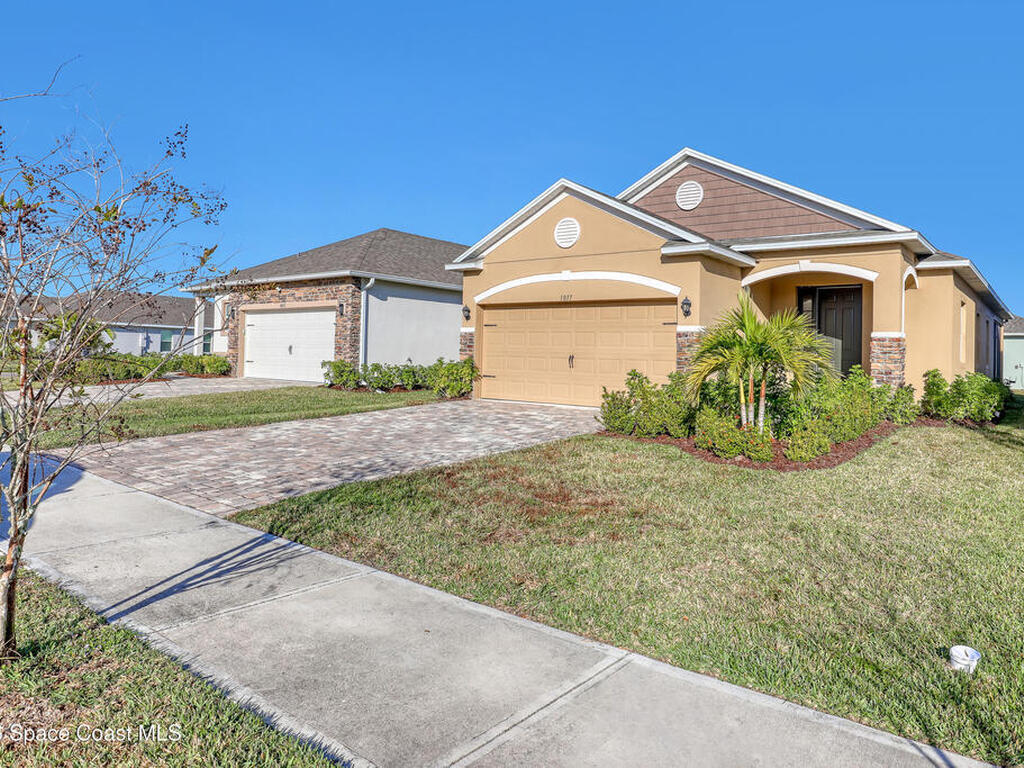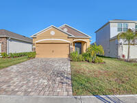 Stunning 3-bedroom, 2-bath concrete block residence built in 2023, offering serene lake views and located in the highly sought-after community of The Gardens at Waterstone. Beautifully maintained and designed for modern living, this home features gorgeous GRANITE countertops and an oversized ISLAND--perfect for culinary prep, entertaining, and everyday enjoyment. All upgraded cabinets, hardware, blinds, and STAINLESS-STEEL kitchen appliances which convey with the purchase, along with the WASHER and DRYER.The open-concept floor plan offers SPLIT bedrooms for added privacy. The lovely primary suite is a true retreat, complete with a walk-in closet and a double-vanity en-suite featuring a stunning walk-in shower. Two comfortable guest bedrooms provide flexibility for family, visitors, or a home office, while the guest bathroom includes a spacious tub and tasteful finishes. Have peace of mind with hurricane shutters and a complete irrigation system.Step outside to the screened-in