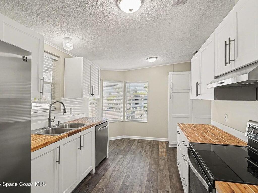 Enjoy low-maintenance Florida living in gated, 55+ Holiday Park--where you own the land. This beautifully updated 2-bedroom, 2-bath home features a complete 2025 renovation with extended bedroom closets, all new flooring, fresh interior finishes, and a brand-new kitchen with soft-close cabinetry, butcher block countertops, and a higher end appliance package. Major system upgrades include all new plumbing, new screening, full hurricane protection, a 2018 water heater, and a 2021 HVAC system. The layout offers a welcoming sunroom, spacious living area, indoor laundry, and a comfortable primary suite with en-suite bath. Situated on a desirable corner lot, the homesite feels exceptionally large and open. Community fees include lawn care, internet/cable, gated security, and access to pools, activities, and amenities, all conveniently located near shopping, dining, and medical facilities.
