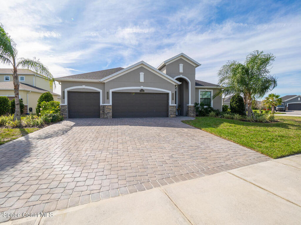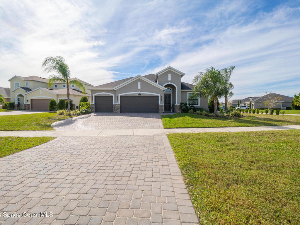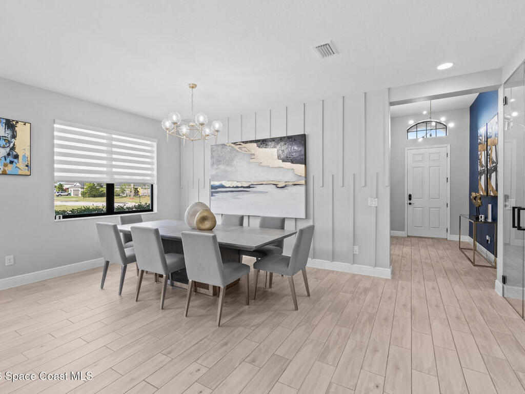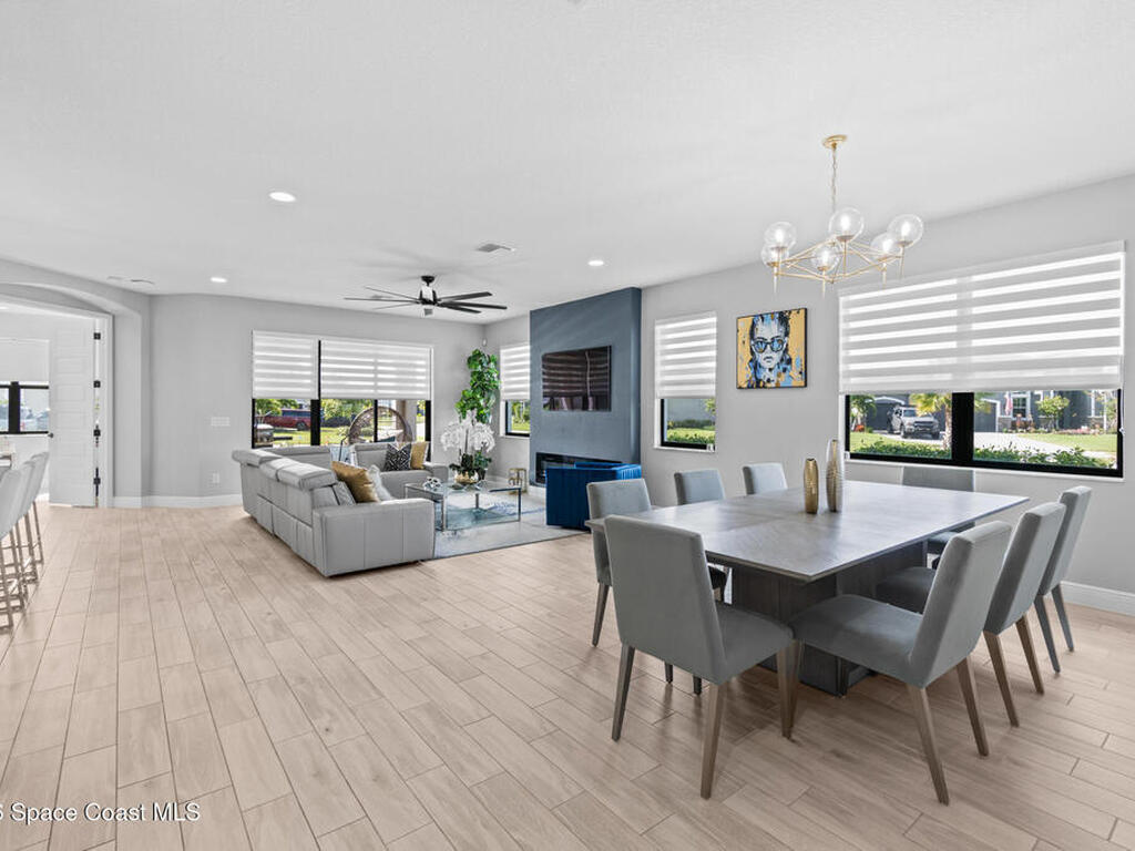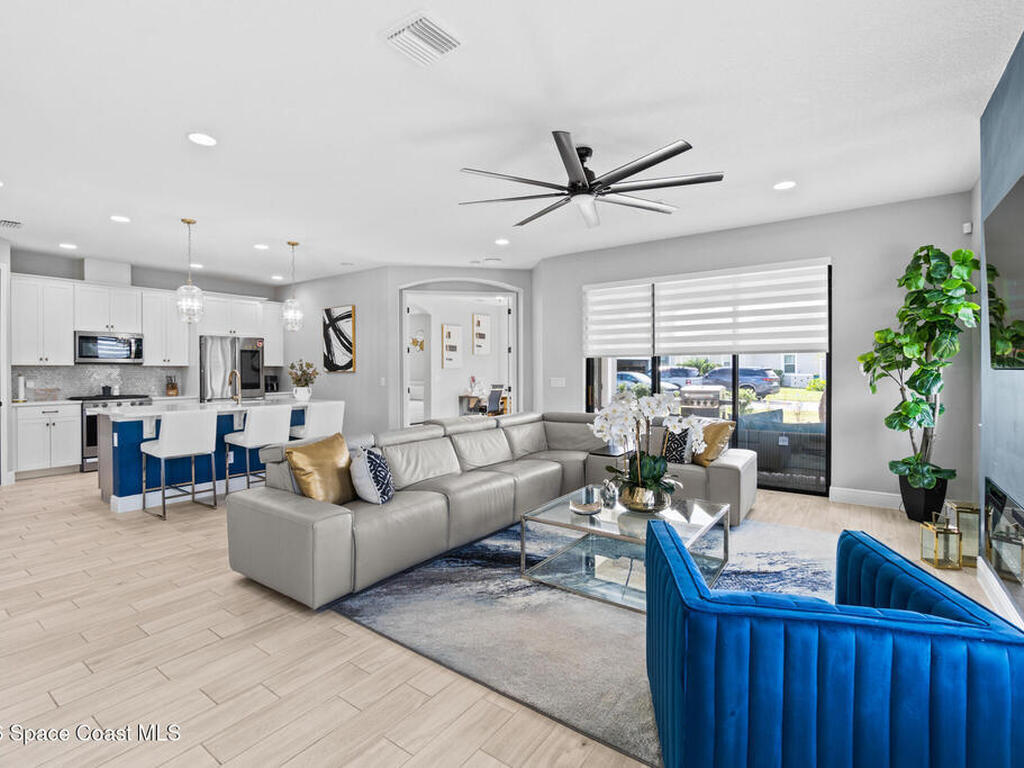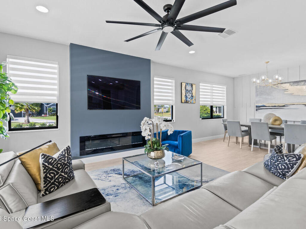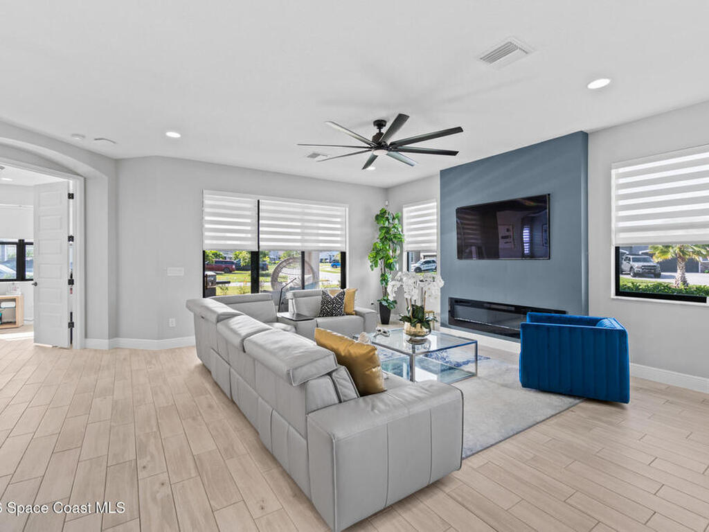 Welcome to 7776 Millbrook, a stunning home located in the heart of the planned community of Viera, Florida, where thoughtful design meets everyday comfort. This spacious property features 4 bedrooms plus a private office within the primary suite, 3.5 bathrooms, and a 3-car garage, all designed to offer luxury, flexibility, and functionality.Upon entry, you're greeted by an elegant, oversized foyer highlighted by wide tile planks with a natural wood finish. Throughout the home, enjoy custom high-end lighting, designer accent walls, and zebra shutters with 100% blackout capability. Storage is exceptional, with closets throughout and a dedicated glass wine wall adding both practicality and charm.The kitchen serves as the heart of the home, offering a large island, high-end Samsung appliances, stylish backsplash details, and sleek finishes, making it perfect for entertaining or everyday living. The adjacent living area is anchored by a fireplace, adding warmth, character, and a