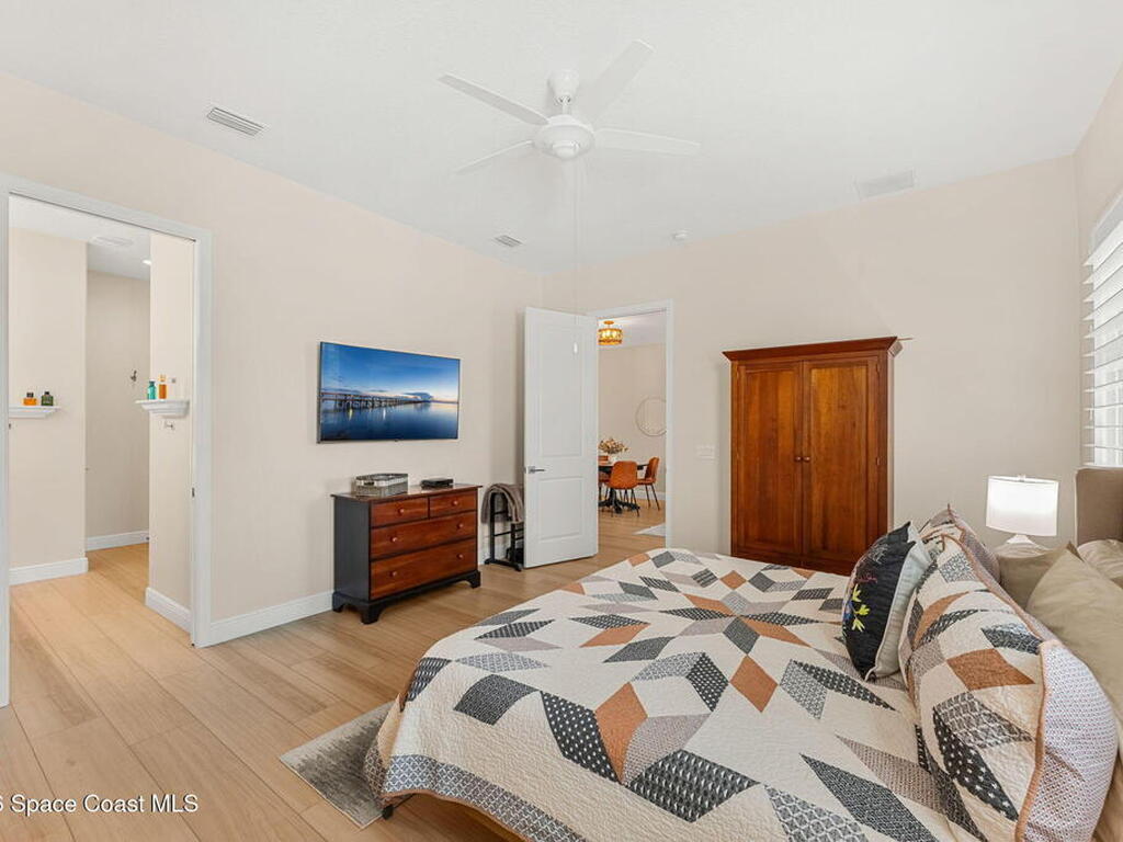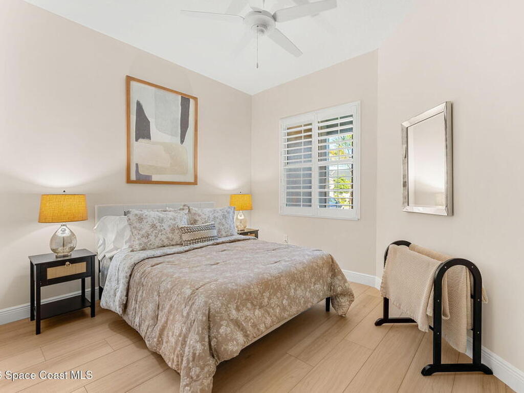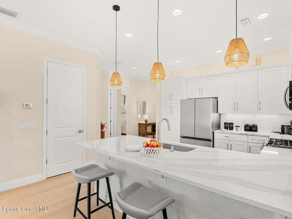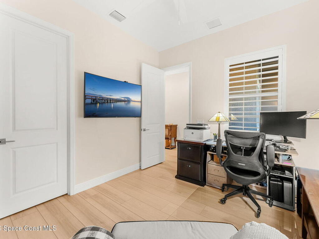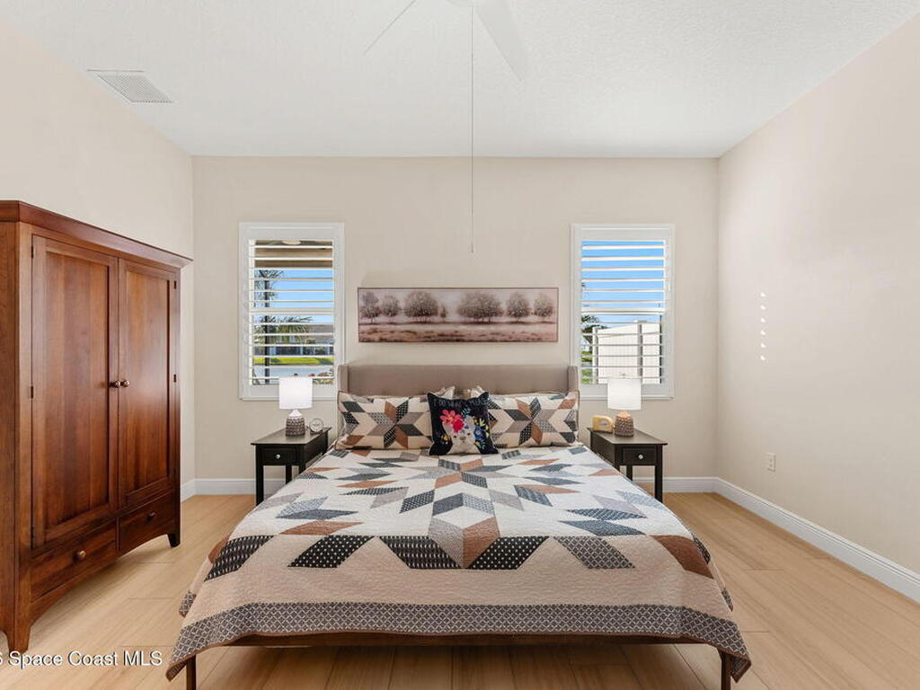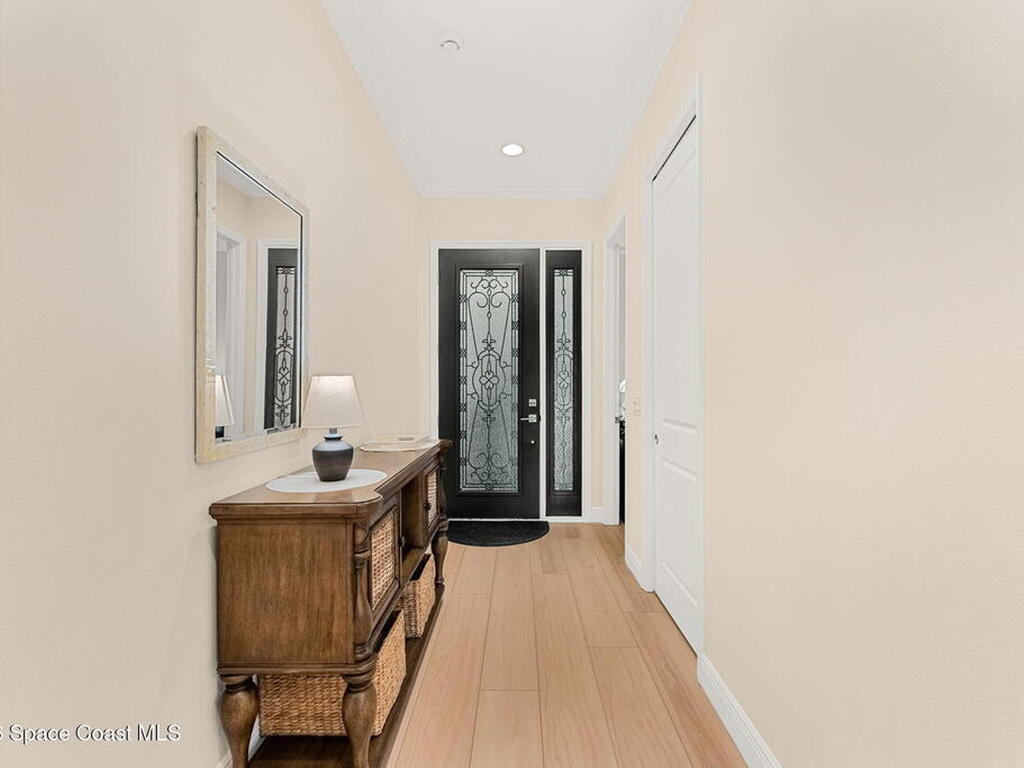 If you've been dreaming of the Viera lifestyle without the typical Viera price tag, this is the one. Built in 2024 and thoughtfully upgraded from top to bottom, this 3 bedroom, 2 bath home offers the ease of townhouse living with the feel of a custom residence. From the moment you step inside, you'll notice the difference. Luxury vinyl plank flooring, upgraded cabinetry, premium countertops, designer tile details and custom touches throughout create a space that feels polished, comfortable and completely move in ready. The owners have gone beyond the builder basics with a whole home water softener, custom closets, window treatments, upgraded fixtures and a beautifully finished primary bath with a frameless glass shower. (See upgrade list attached) Step outside and enjoy peaceful pond views from the screened lanai, unwind on the extended paver patio, and take advantage of the built in natural gas grill connection with additional paver space designed for easy outdoor entertaining.