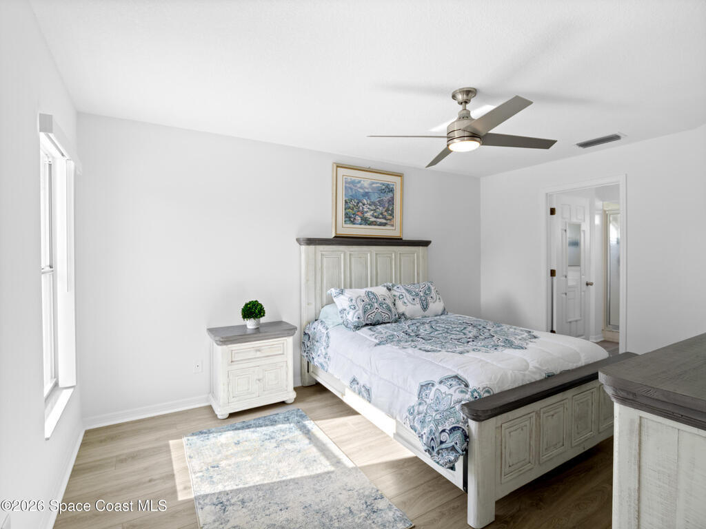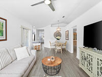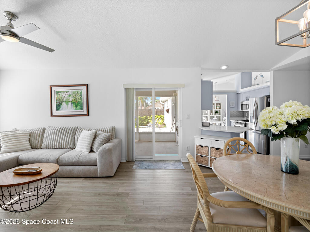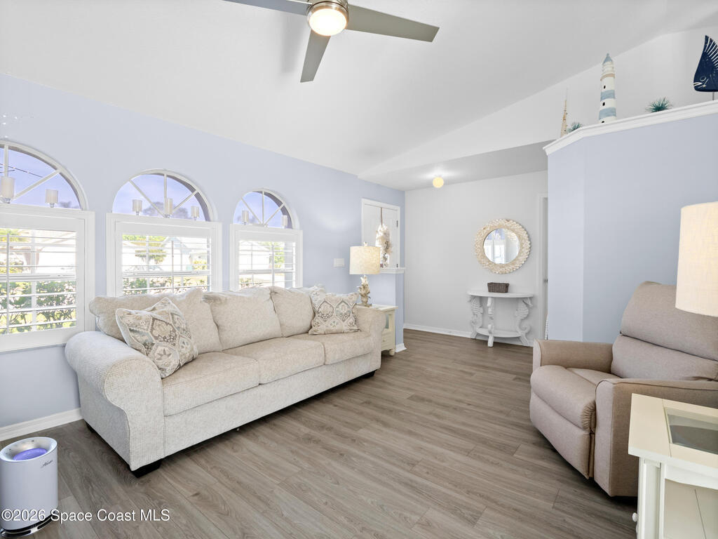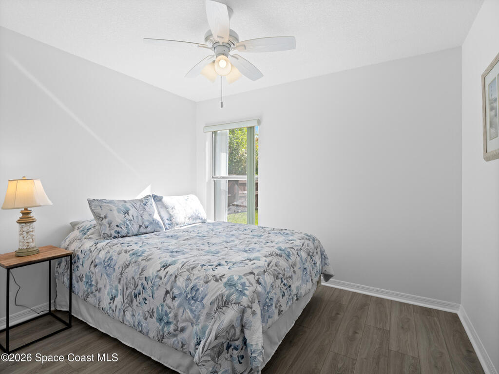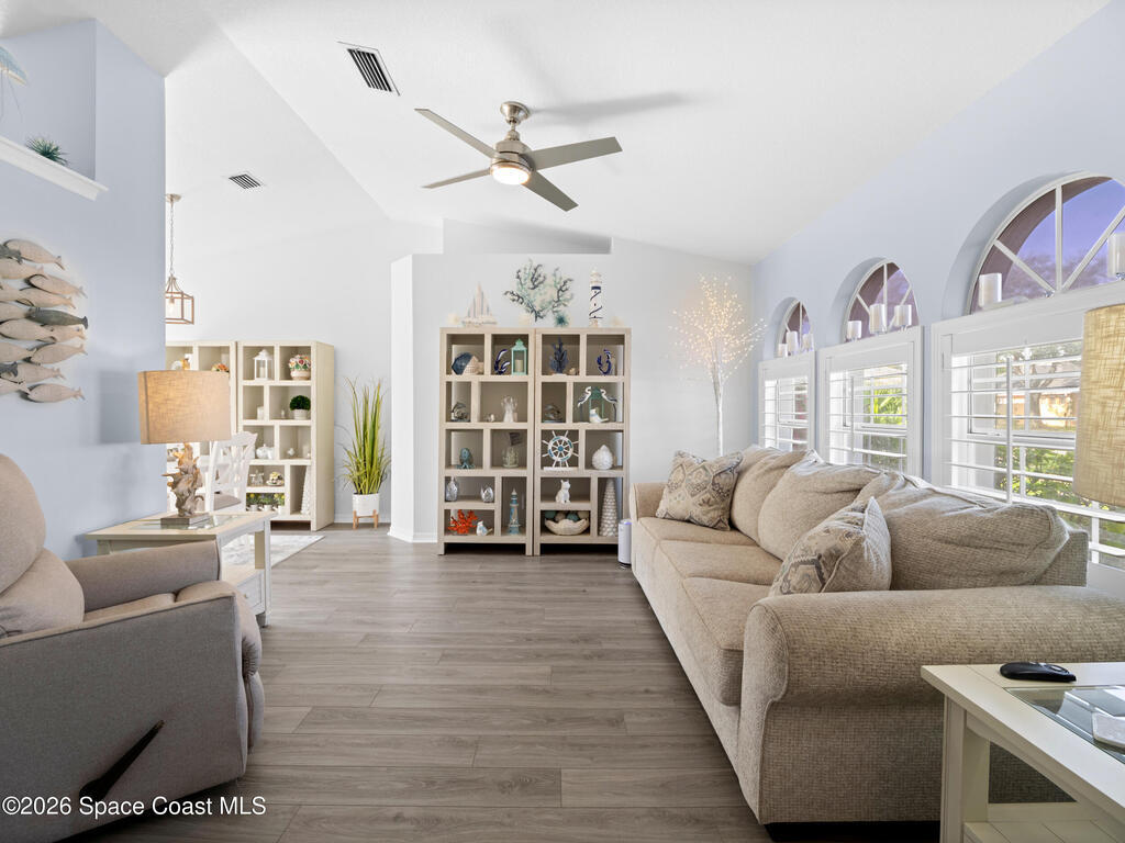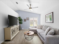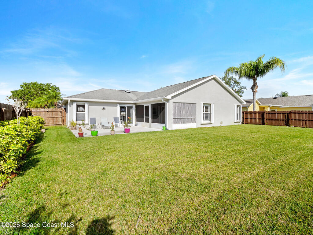 Nestled on a corner lot in a quiet cul de sac, this charming 3 bedroom, 2 bath home is located in a wonderful neighborhood & offers a thoughtfully designed split bedroom floor plan. Newer vinyl plank flooring flows throughout, creating a clean & modern feel.The kitchen boasts newer stainless steel appliances & quartz countertops. The spacious screened lanai & patio overlook a huge fenced -in backyard - perfect for relaxing & entertaining. Plenty of room to add a pool. Additional highlights include a newer paver driveway & newer garage door too. Both interior & exterior painted less than 4 years ago.Conveniently located near restaurants, shopping, schools, the King Center, Eastern Florida College & 10 minutes till toes in the sand.