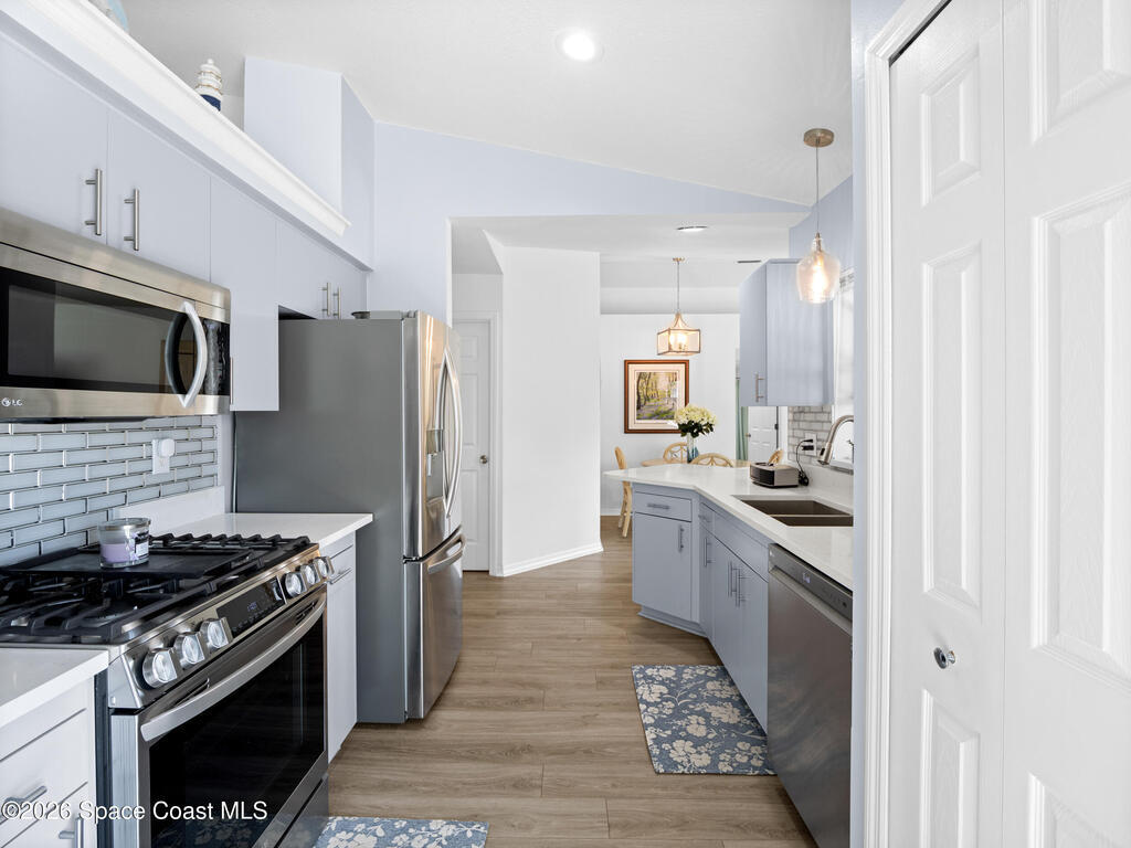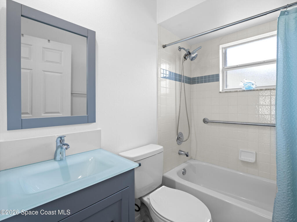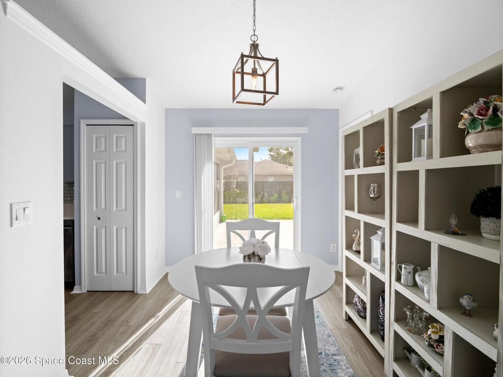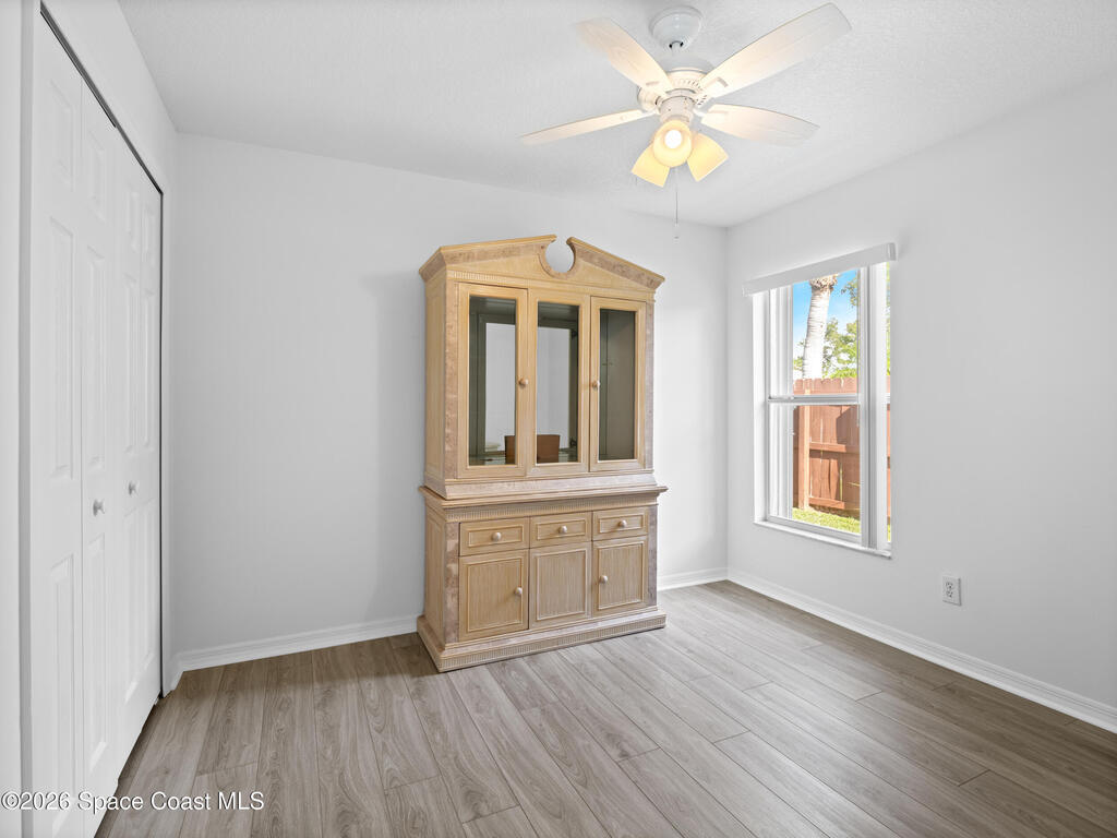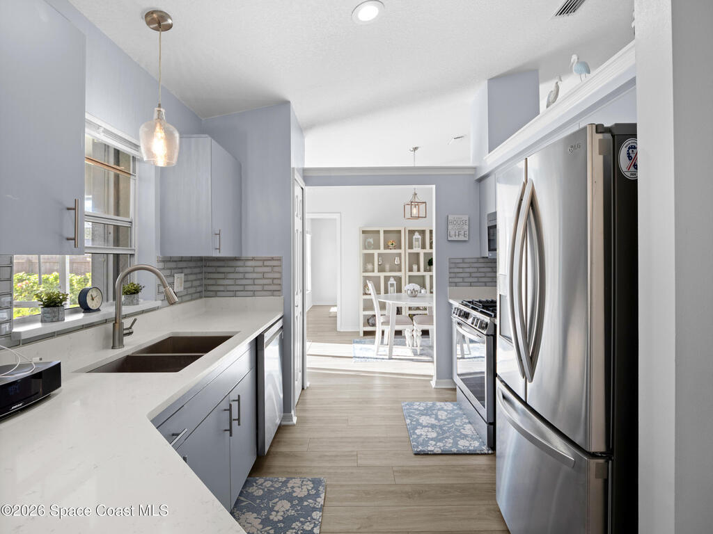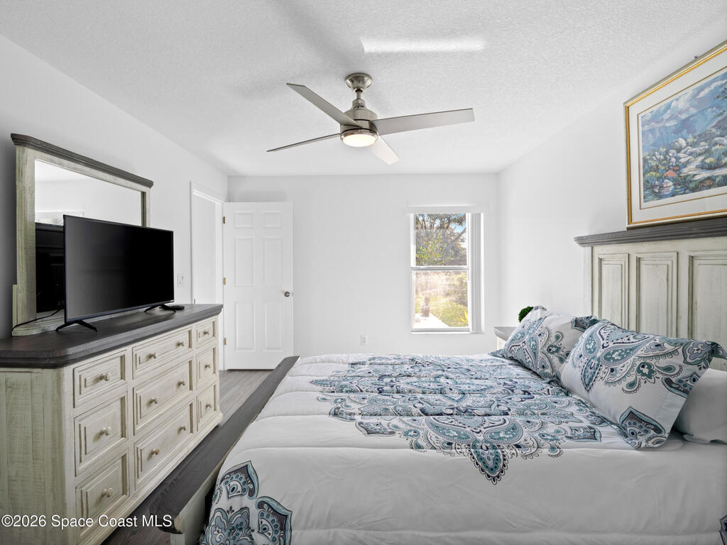 Nestled on a corner lot in a quiet cul de sac, this charming 3 bedroom, 2 bath home is located in a wonderful neighborhood & offers a thoughtfully designed split bedroom floor plan. Newer vinyl plank flooring flows throughout, creating a clean & modern feel.The kitchen boasts newer stainless steel appliances & quartz countertops. The spacious screened lanai & patio overlook a huge fenced -in backyard - perfect for relaxing & entertaining. Plenty of room to add a pool. Additional highlights include a newer paver driveway & newer garage door too. Both interior & exterior painted less than 4 years ago.Conveniently located near restaurants, shopping, schools, the King Center, Eastern Florida College & 10 minutes till toes in the sand.
