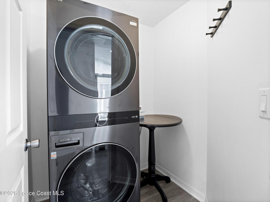 Dishwasher, Gas Range, Microwave, Refrigerator, Washer/Dryer Stacked
