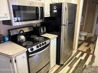 Electric Range, Microwave, Refrigerator, Washer/Dryer Stacked