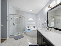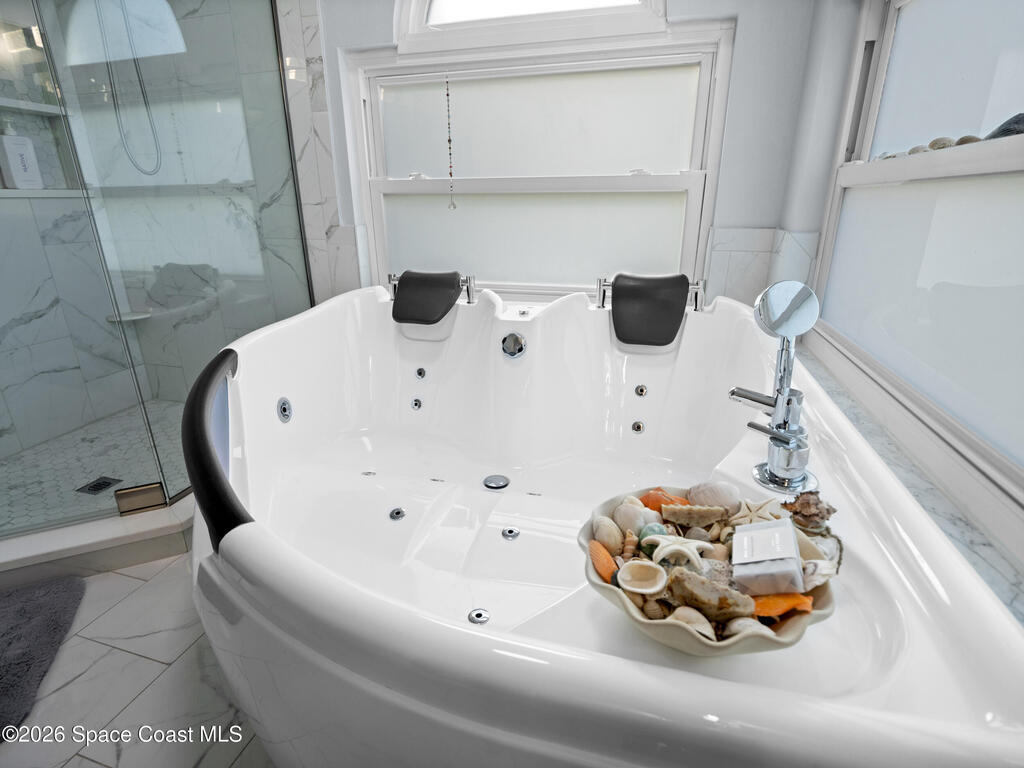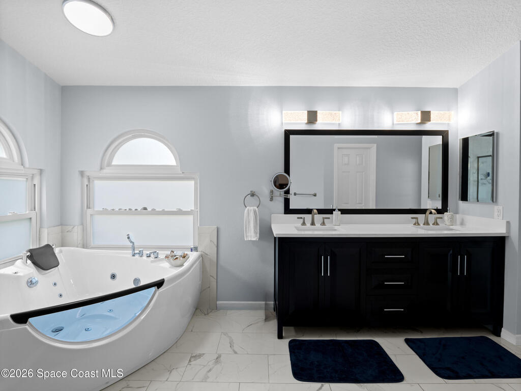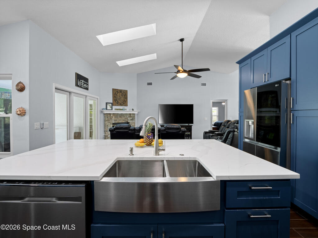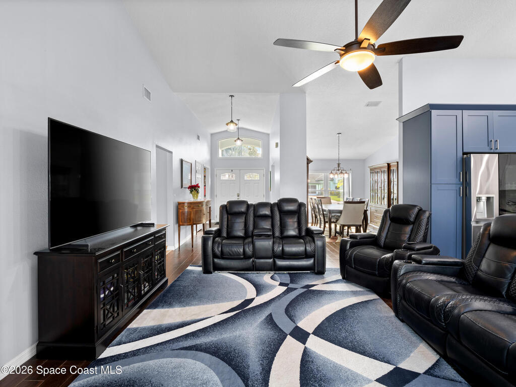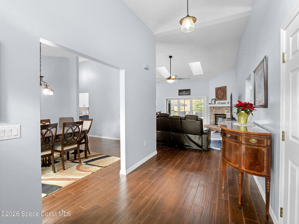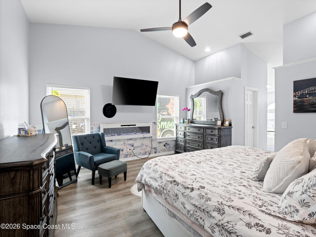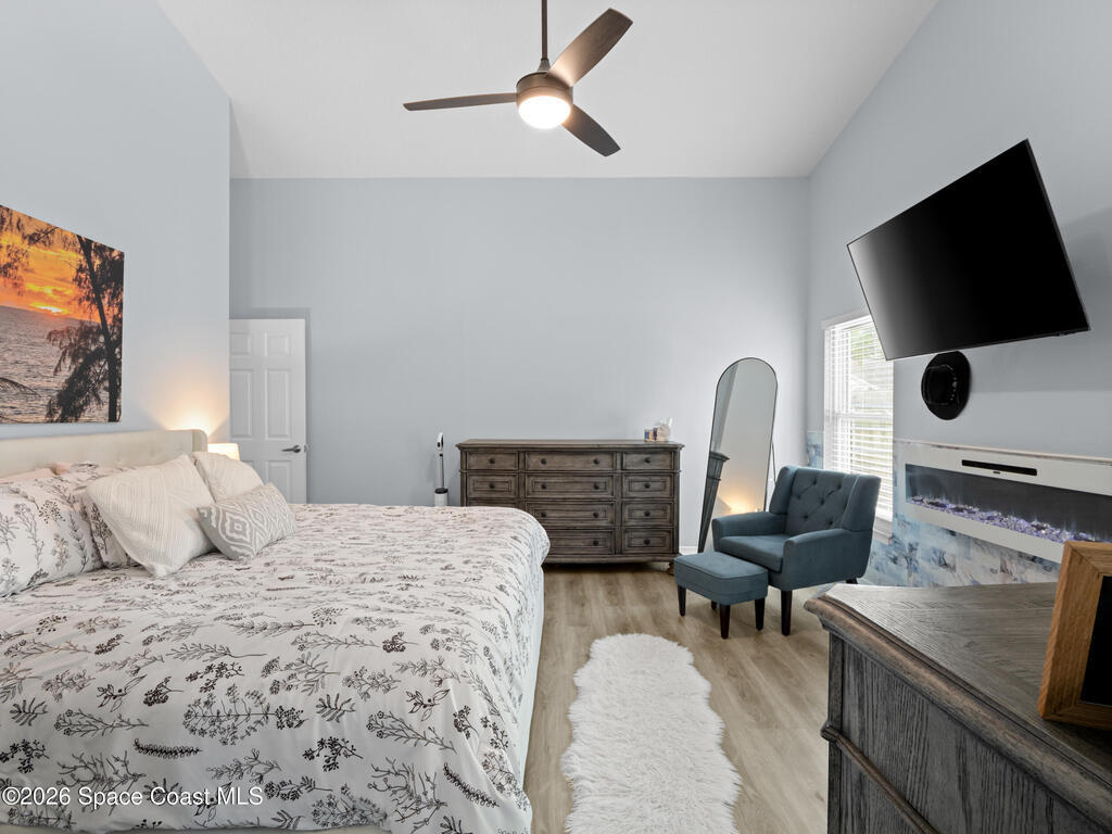 Luxury meets comfort in this RV-friendly Titusville home! Enjoy a PRIVATE SALTWATER POOL with screened lanai--perfect for warm Florida days. Impact Rated Windows and SOLAR PANELS. The split floor plan offers four bedrooms plus den, two baths, and FLOORING throughout-with no carpet. Interior and exterior paint were updated in 2024. The beautifully remodeled 2024 kitchen features 42'' two-tone solid wood cabinetry, quartz countertops, custom tile backsplash with decorative inlay, an oversized island with storage, farmhouse apron sink, and stainless appliances including a beverage fridge. Perfect for entertaining! The primary suite features an electric fireplace and spa-inspired ensuite boasting a tiled walk-in shower and two-person whirlpool jetted tub. The living room boasts a wood-burning fireplace. Outside, enjoy a fully fenced .34-acre yard with firepit, two storage sheds, plant basins, newer septic (2024). Close to I-95, US-1, 25 mins to beaches. Schedule your showings today!