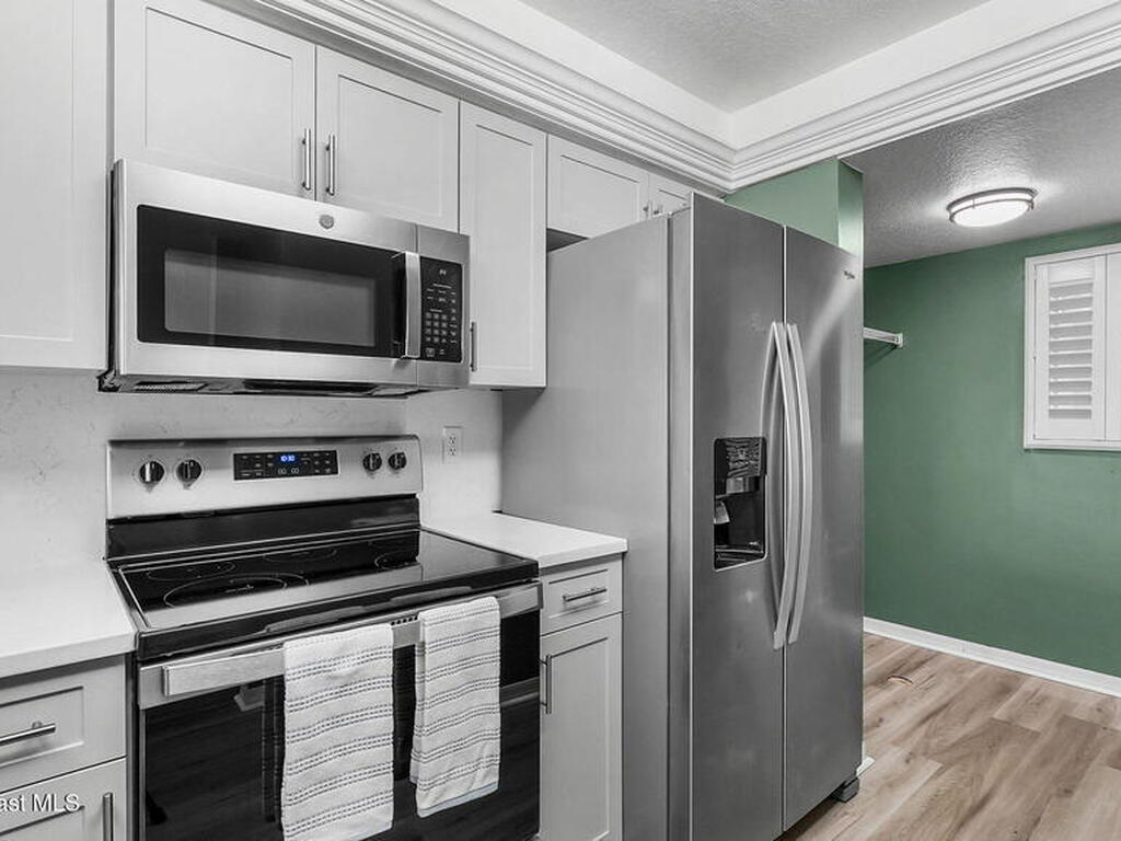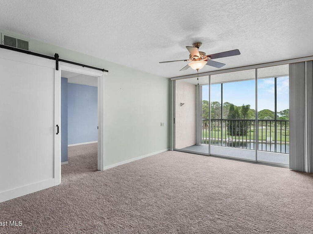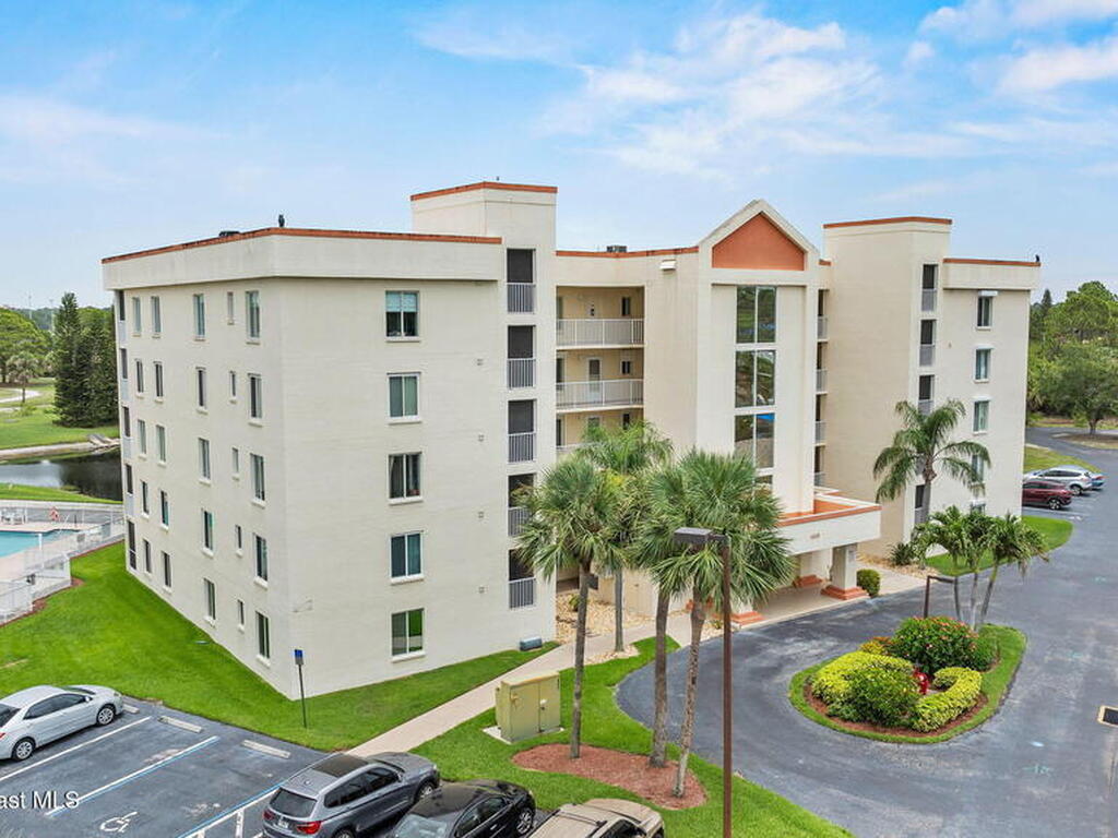 Quiet 4th-floor 2-bedroom, 2-bath condo with detached 1-car garage in the desirable 55+ Carmel Community. Bright unit features hurricane-impact windows and shutters, new flooring, quartz kitchen, stainless steel appliances, laundry hookups inside unit, nearby trash chute, and a screened balcony with peaceful pond views. Enjoy truly low-maintenance living with a most-inclusive HOA covering water, sewer, trash, cable, internet, Disney+, insurance, lawn care, pest control, and exterior maintenance. Community offers a clubhouse, pool, fitness center, library, billiards, and social activities. Milestone inspections complete and elevators updated. Convenient to Viera shopping, dining, medical facilities, trails, beaches, I-95, and less than an hour to Orlando.