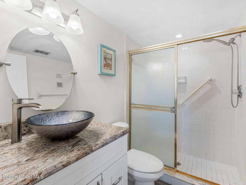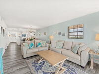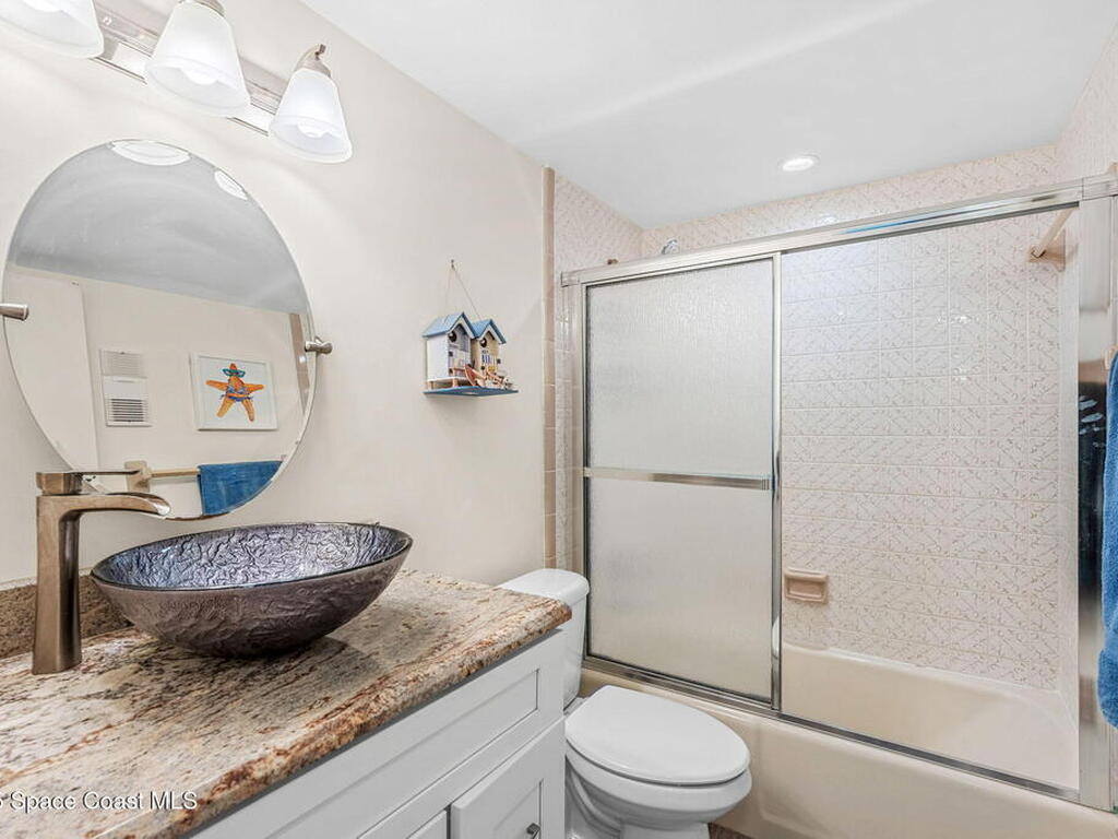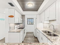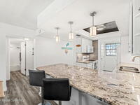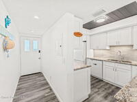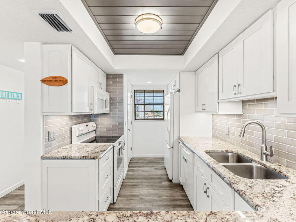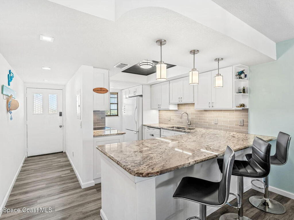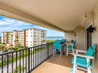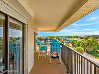 This renovated TOP FLOOR, NW CORNER UNIT offers OCEAN & RIVER VIEWS with a WRAP AROUND BALCONY! Top floor means no pesky view-obstructing structural components--just watching rocket-launches, sunshine, sea breezes & good vibes. An extra window at the corner provides plenty of natural light for that bright, beachy feel. Move right in--this furnished unit features vinyl flooring, a full copper rewire, and a 2018 kitchen remodel with white shaker, soft-close cabinetry, granite countertops and breakfast bar, and a pantry with rollout shelves. The in-unit laundry/utility room includes a newer large-capacity washer and dryer. Be storm ready with electric roll-down shutters on the sliders & corner window, and crank shutters for the front windows. Spend the day at the beach with convenient private access and finish the day with a refreshing dip in the ocean-view community pool, then walk downtown for dinner and cocktails. Recharge the next morning with a quick walk to breakfast at Whisk & Grind
