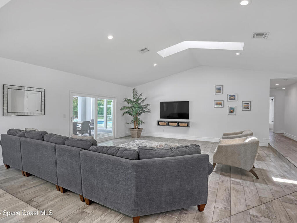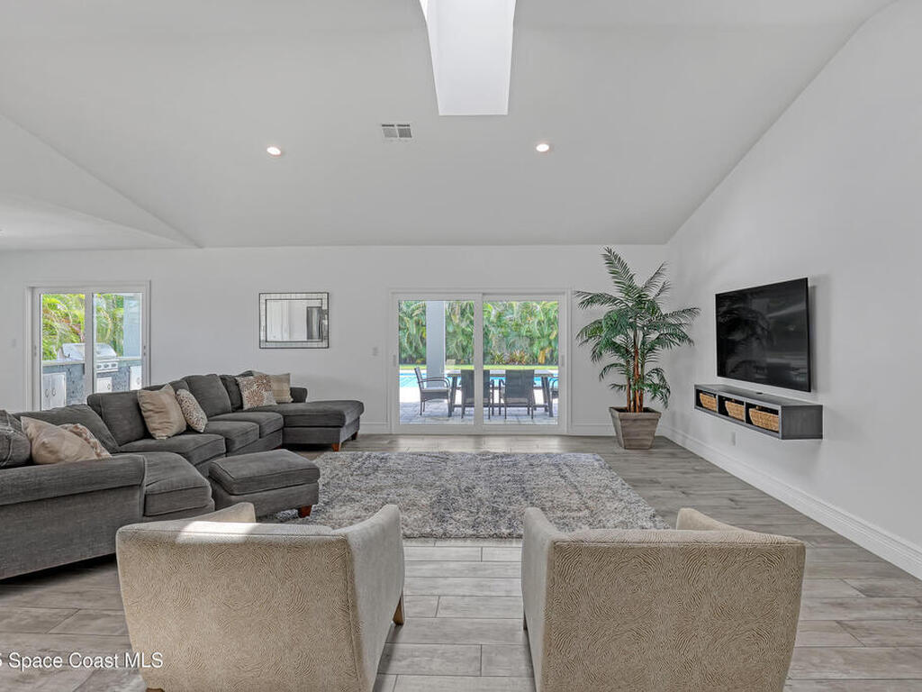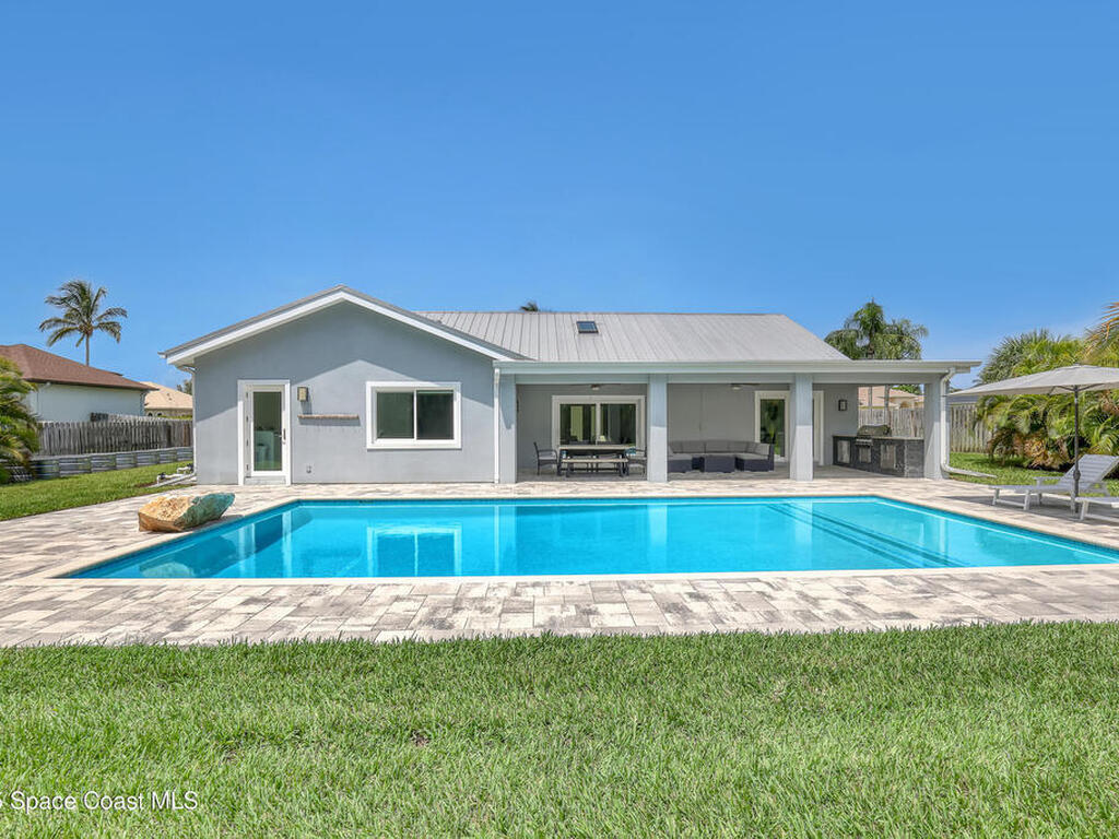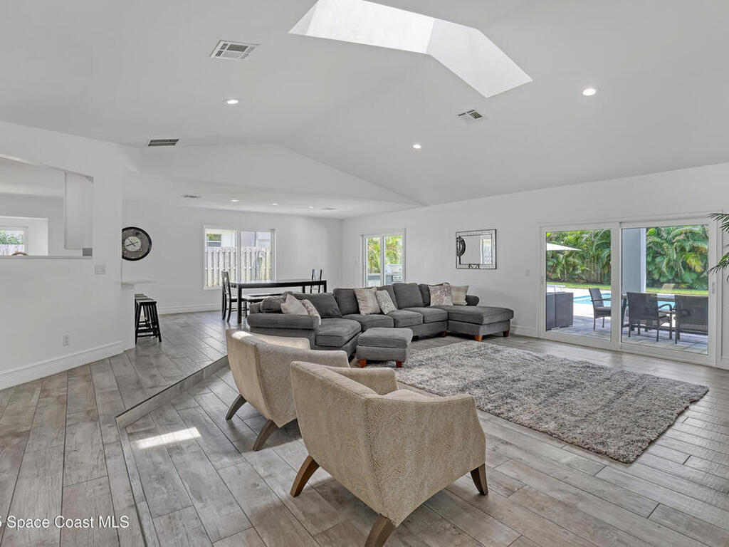 Welcome to Beachside Living at Its Best! Step into paradise with this beautifully updated 3 bdrm, 2 bath, 2 car garage home located just a short stroll from HOA deeded beach access. From the moment you enter, you'll be captivated by the spacious open floor plan featuring a light-filled living & dining area with recessed lighting, sliding glass doors, & a large skylight. The 2019 updated kitchen is a chef's dream, offering quartz countertops, soft-close drawers, 42'' cabinets, black SS appliances, pantry & breakfast bar. A cozy breakfast nook w/ built-in seating & storage adds extra charm & functionality. Retreat to the primary suite, which includes custom walk-in closet & large bonus room w/ sliding doors leading to the pool. The adjoining laundry room offers ample storage & includes washer/dryer. The luxurious primary bath features a double-sink vanity, two-person walk-in shower & a solar tube for natural light. Enjoy endless outdoor fun in the 2021 heated