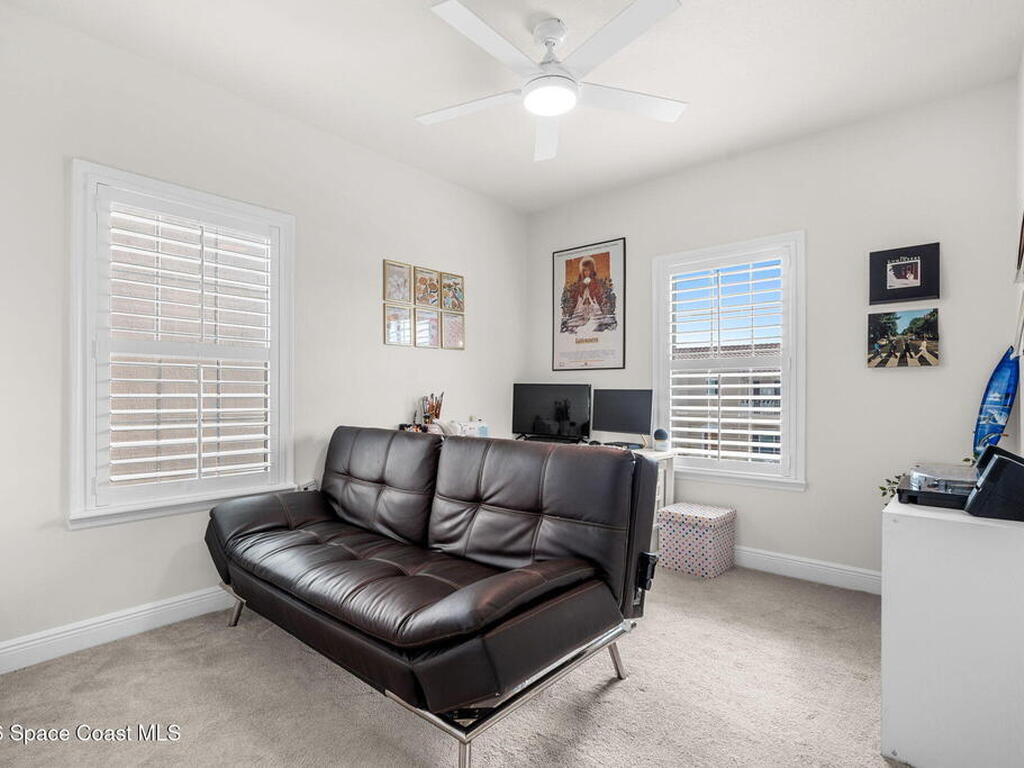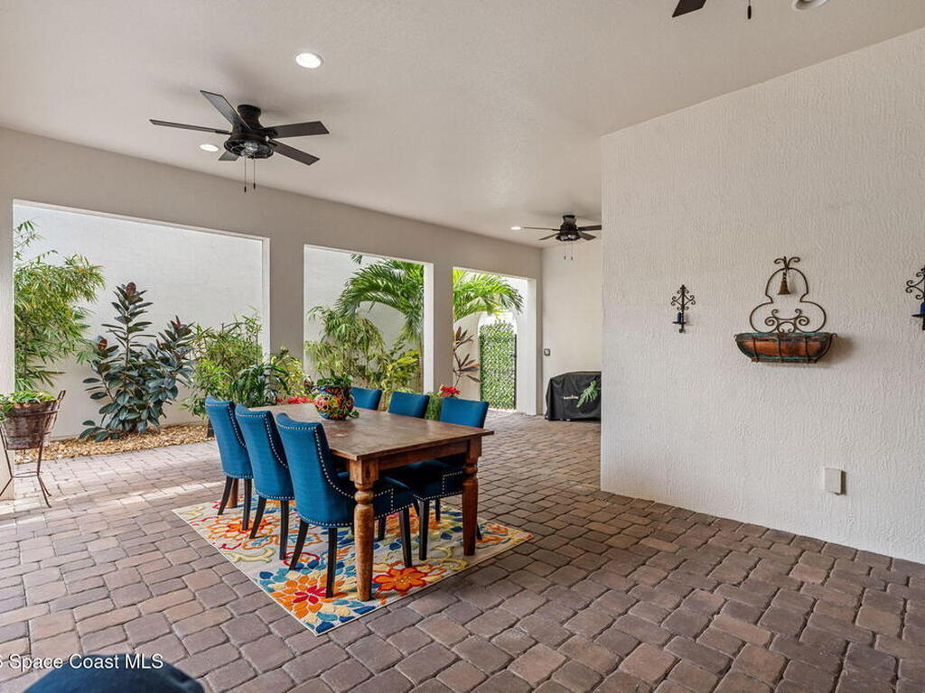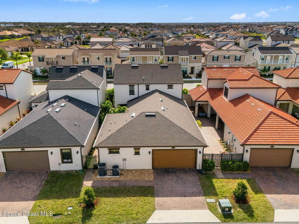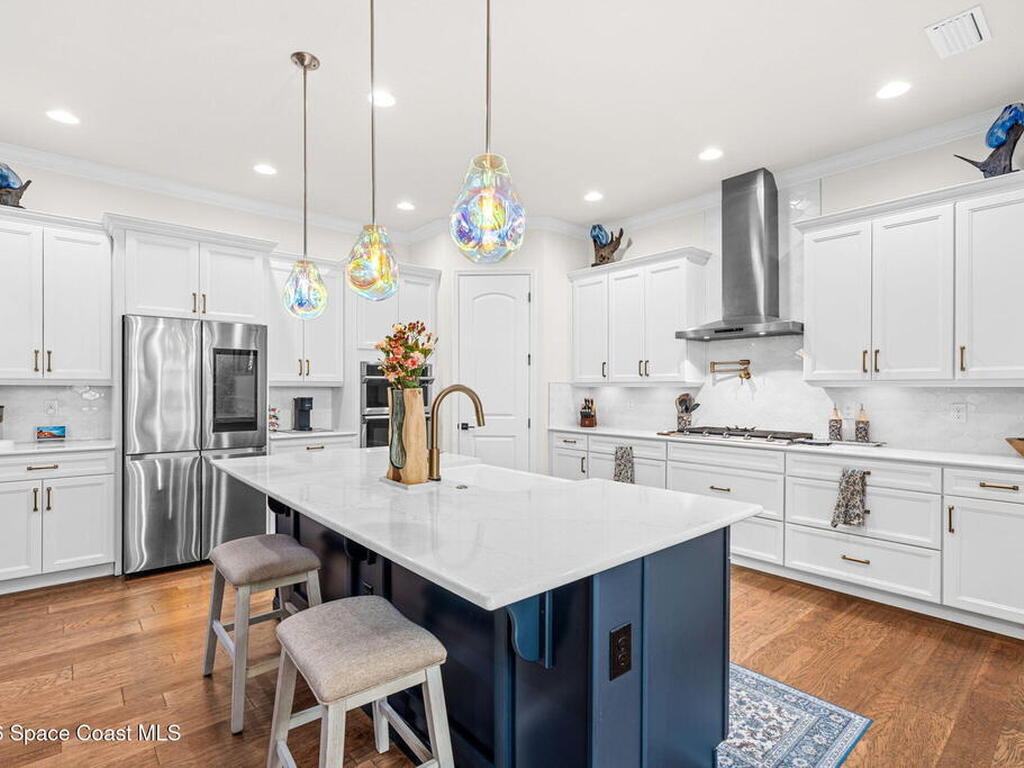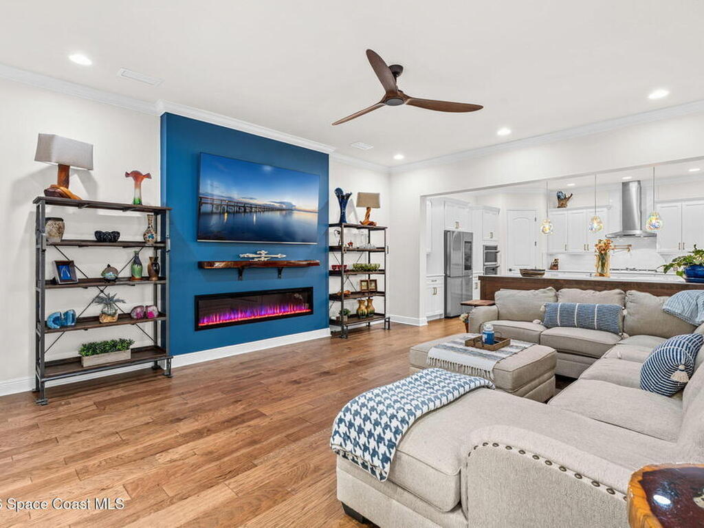 Motivated seller! Built in 2023 this Brevard County home has thousands in upgrades. This Mecina II (Castillo Series) stunner offers 4BR/4BA and 2, 950 SF of bold design, smart tech & low-maintenance living in Reeling Park. 8-ft interior doors w/ black hardware, crown molding & wood-look tile elevate the main level, anchored by a dramatic 6-ft linear electric fireplace w/ walnut/iron mantel. The gourmet kitchen steals the show w/ quartz counters, designer backsplash, custom island w/ hand-blown Hawaiian lava pendants, built-in refrigerator, wall oven/micro combo, 36'' natural gas cooktop w/ pot filler & Samsung Bespoke smart appliances. Primary suite is downstairs w/ his-&-hers showers & vanities + huge walk-in closet. Main level also features a private office + custom laundry w/ sink/storage. Courtyard, impact windows & storm shutters complete the hurricane-ready package. Amenity-rich community includes pool, pickleball, tennis, fitness center, clubhouse, jogging path, playground & more