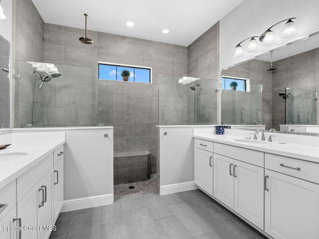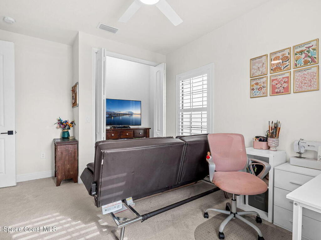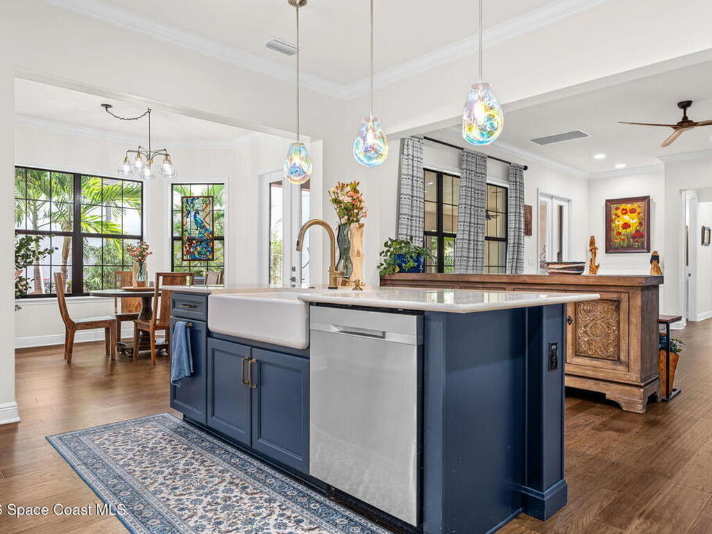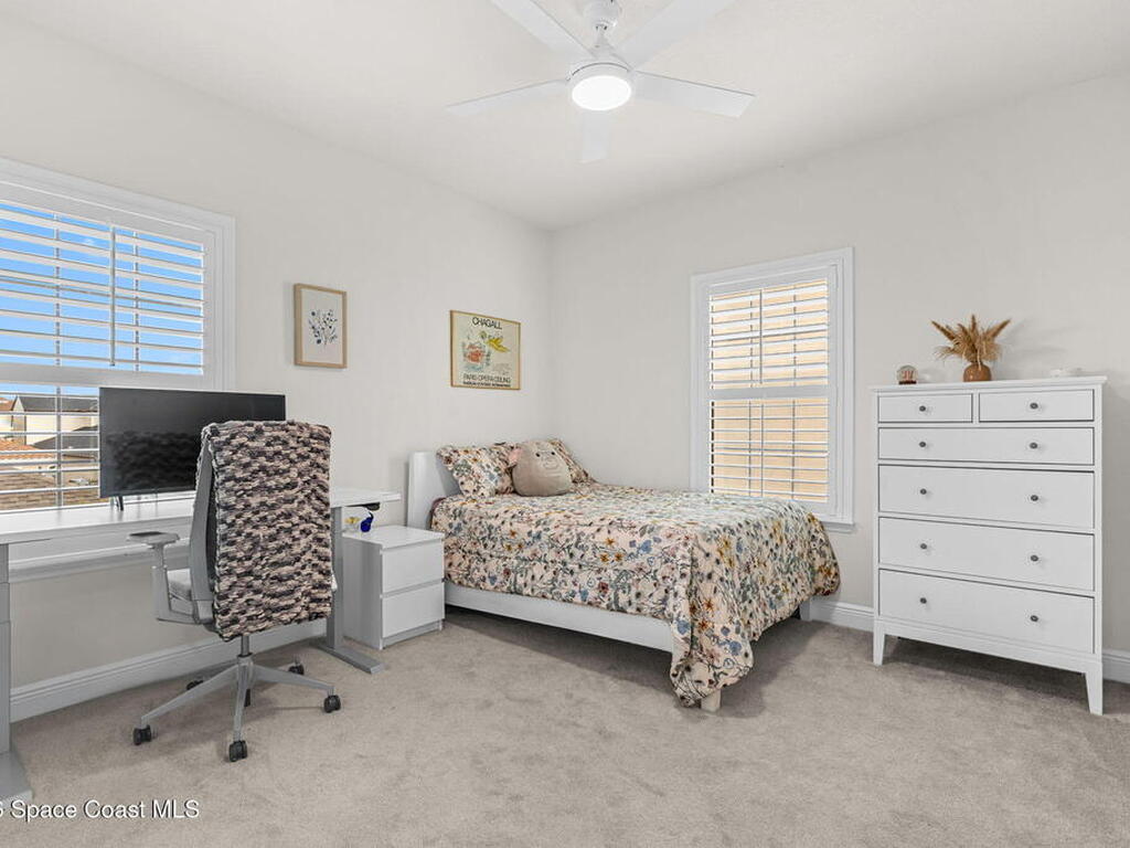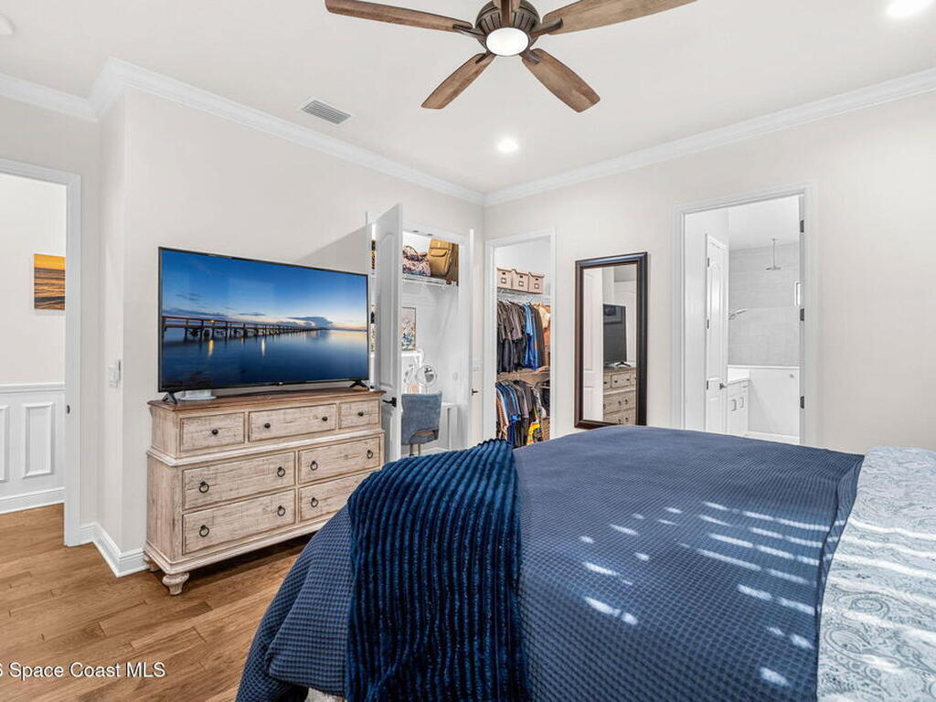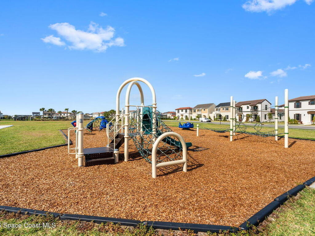 Motivated seller! Built in 2023 this Brevard County home has thousands in upgrades. This Mecina II (Castillo Series) stunner offers 4BR/4BA and 2, 950 SF of bold design, smart tech & low-maintenance living in Reeling Park. 8-ft interior doors w/ black hardware, crown molding & wood-look tile elevate the main level, anchored by a dramatic 6-ft linear electric fireplace w/ walnut/iron mantel. The gourmet kitchen steals the show w/ quartz counters, designer backsplash, custom island w/ hand-blown Hawaiian lava pendants, built-in refrigerator, wall oven/micro combo, 36'' natural gas cooktop w/ pot filler & Samsung Bespoke smart appliances. Primary suite is downstairs w/ his-&-hers showers & vanities + huge walk-in closet. Main level also features a private office + custom laundry w/ sink/storage. Courtyard, impact windows & storm shutters complete the hurricane-ready package. Amenity-rich community includes pool, pickleball, tennis, fitness center, clubhouse, jogging path, playground & more