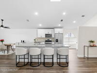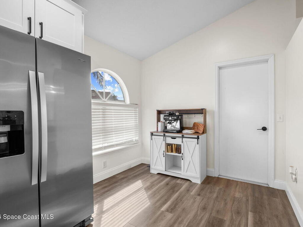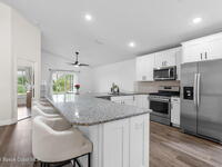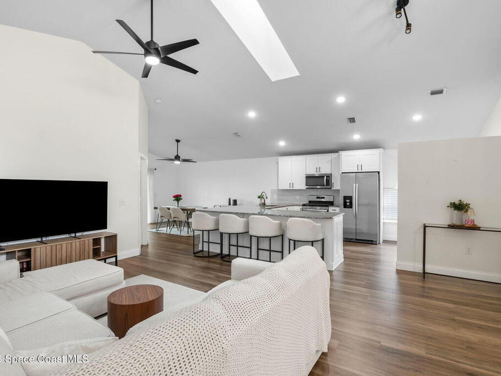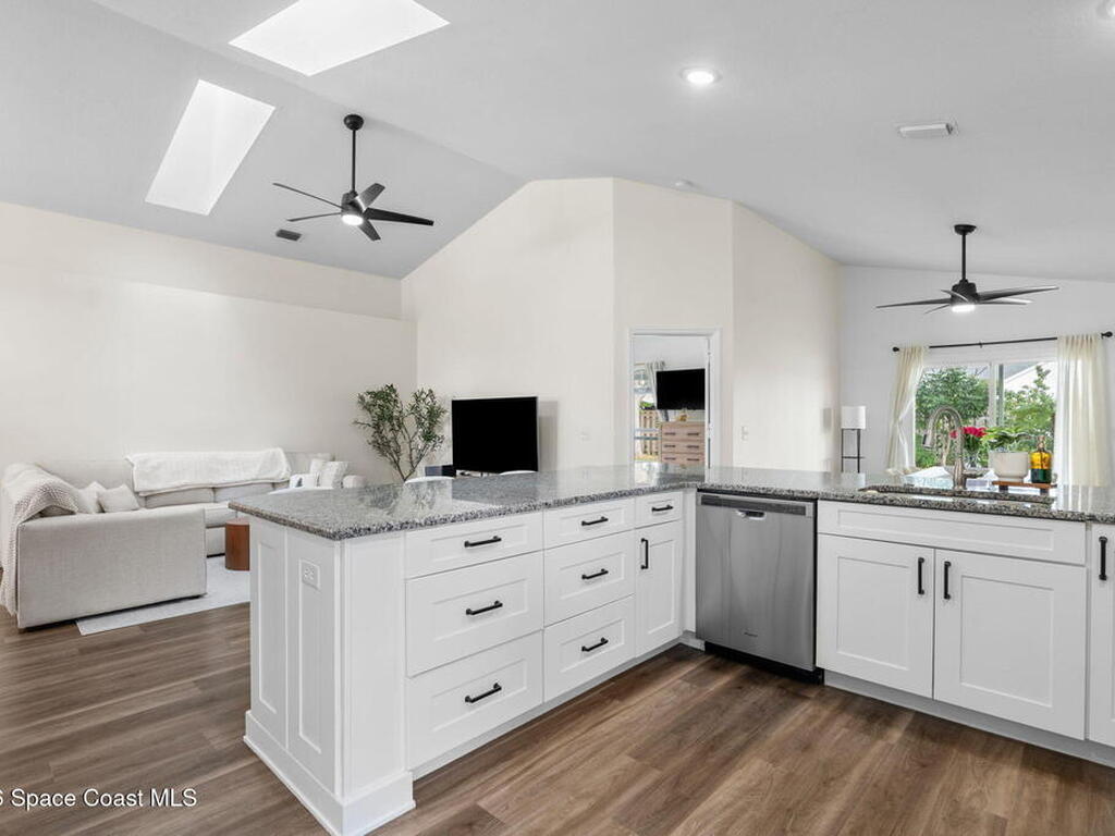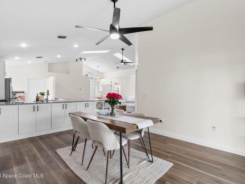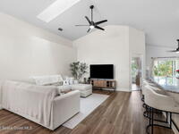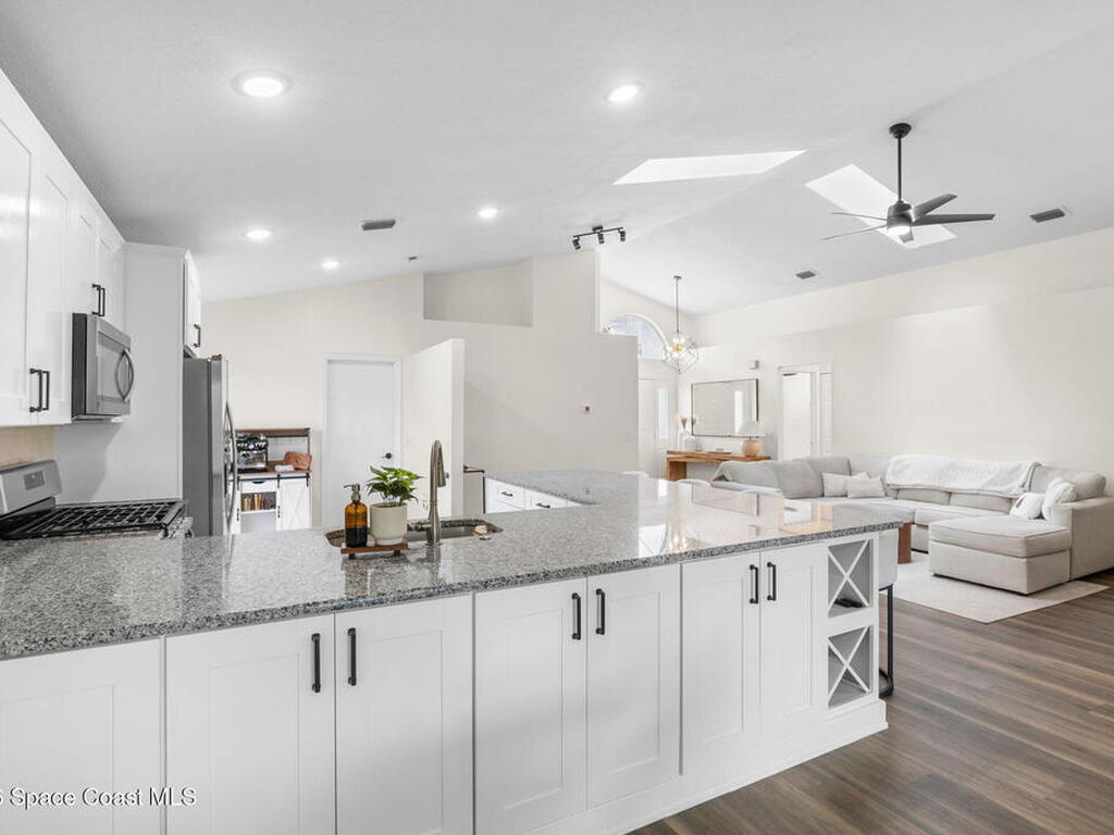 This meticulously updated Viera home delivers the perfect blend of modern design & thoughtful upgrades. Situated on a desirable cul-de-sac oversized lot with tranquil water views. Manicured curb appeal including freshly painted exterior, enhanced landscaping, new stone accents & upgraded lighting. You are welcomed by a bright, open-concept floor plan highlighted by vaulted ceilings, skylights that flood the home with natural light, and fresh paint on every wall. No carpet. Luxury vinyl flooring flows seamlessly throughout the living areas and bedrooms, creating a cohesive and low-maintenance space ideal for everyday living. The kitchen has been tastefully refreshed with painted cabinetry, updated hardware, backsplash, stainless steel appliances, a spice rack cabinet, and a large center island that anchors the space while offering ample prep and seating. New light fixtures and ceiling fans enhance both form and function. Both bathrooms have been fully remodeled with no detail