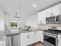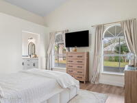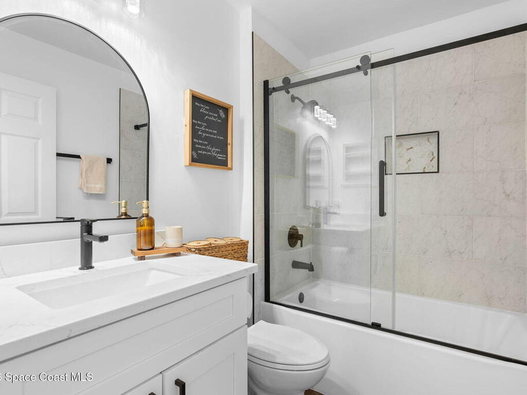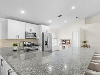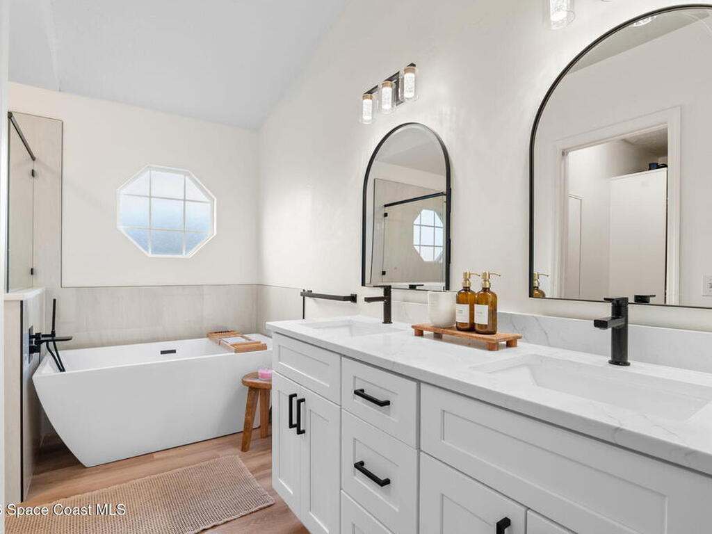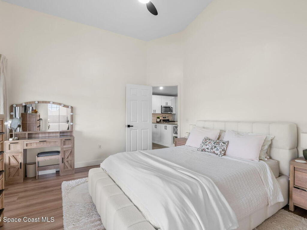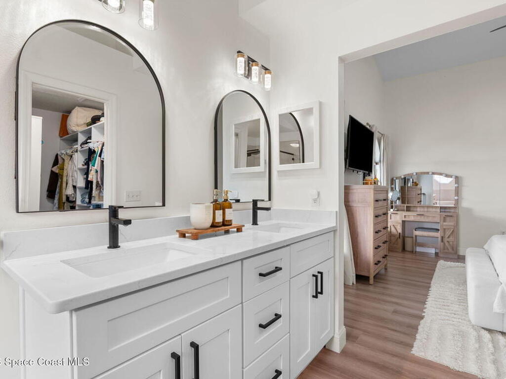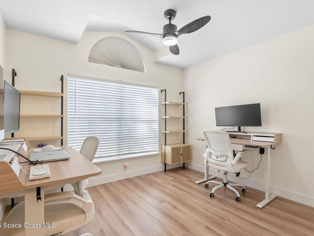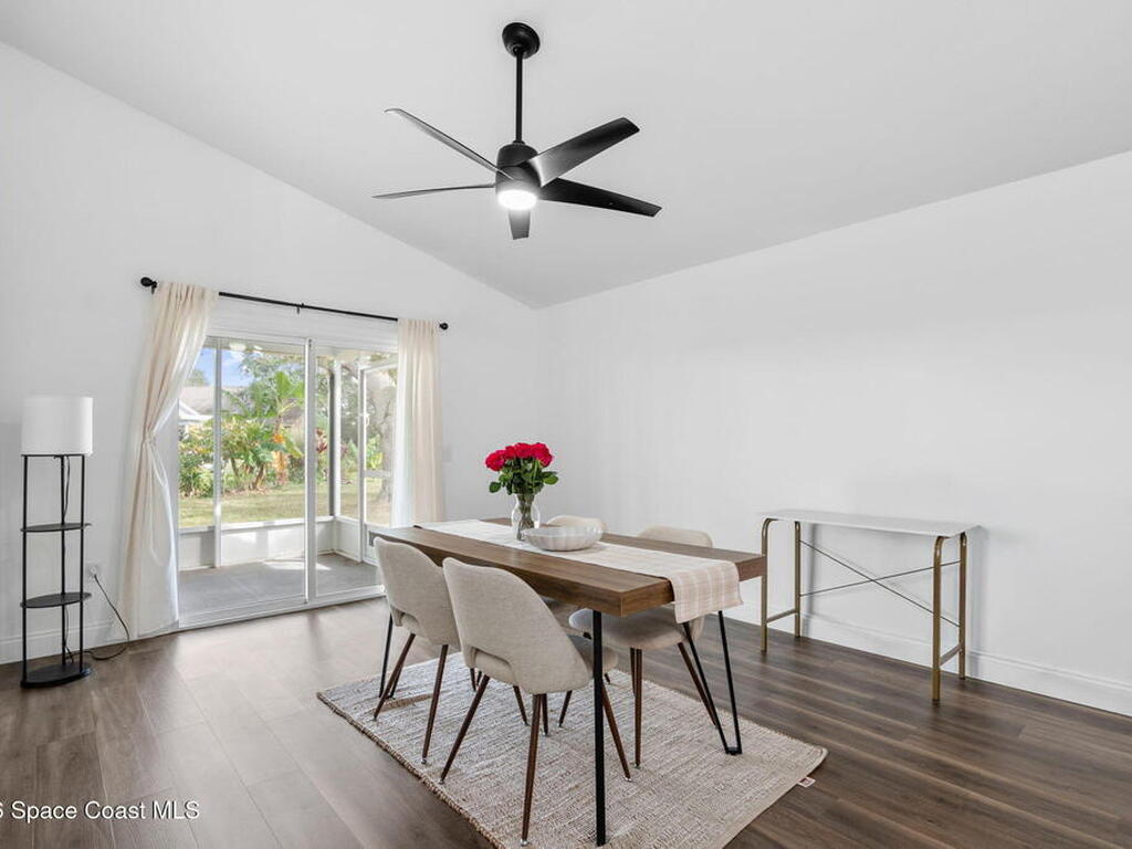 This meticulously updated Viera home delivers the perfect blend of modern design & thoughtful upgrades. Situated on a desirable cul-de-sac oversized lot with tranquil water views. Manicured curb appeal including freshly painted exterior, enhanced landscaping, new stone accents & upgraded lighting. You are welcomed by a bright, open-concept floor plan highlighted by vaulted ceilings, skylights that flood the home with natural light, and fresh paint on every wall. No carpet. Luxury vinyl flooring flows seamlessly throughout the living areas and bedrooms, creating a cohesive and low-maintenance space ideal for everyday living. The kitchen has been tastefully refreshed with painted cabinetry, updated hardware, backsplash, stainless steel appliances, a spice rack cabinet, and a large center island that anchors the space while offering ample prep and seating. New light fixtures and ceiling fans enhance both form and function. Both bathrooms have been fully remodeled with no detail