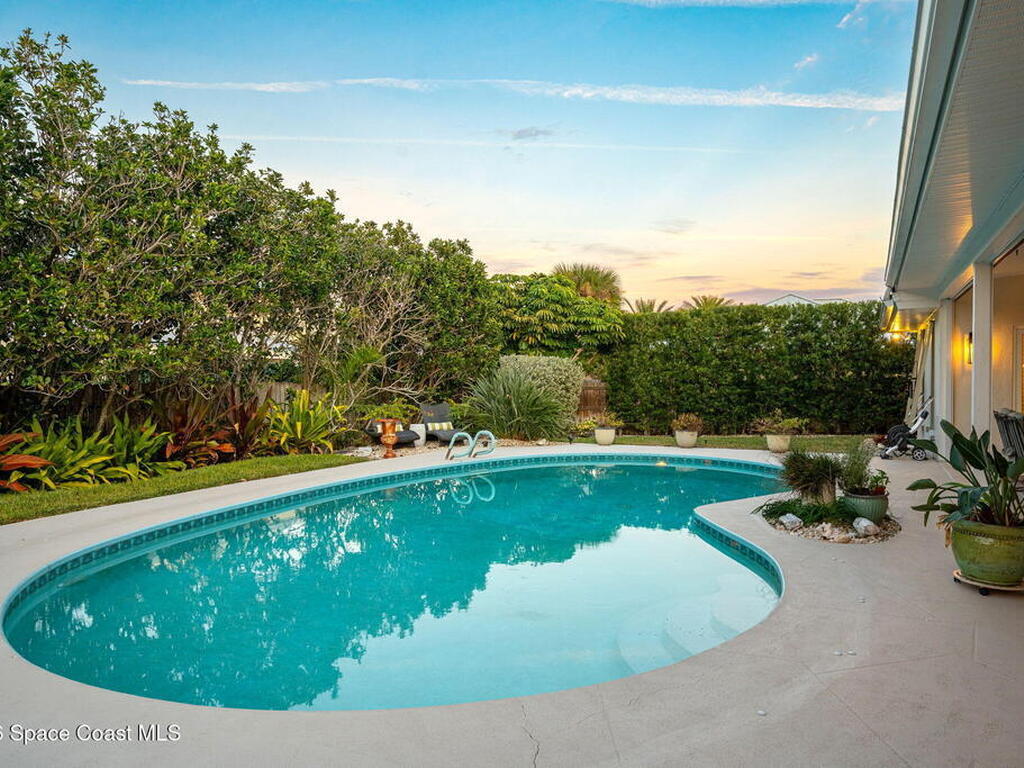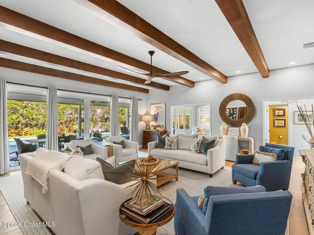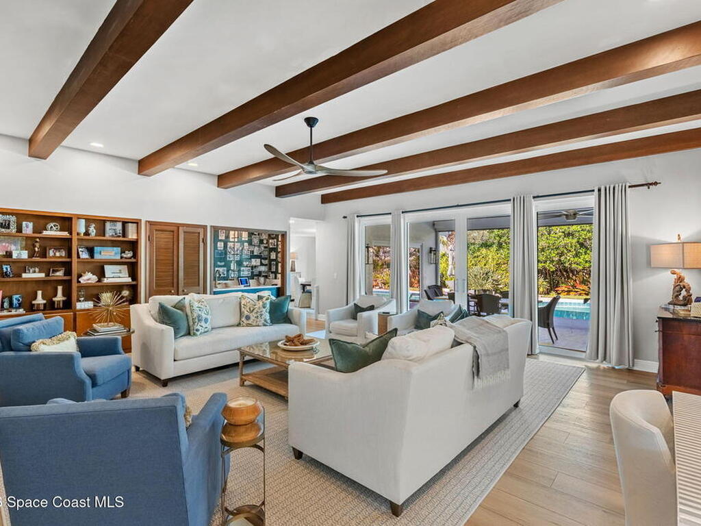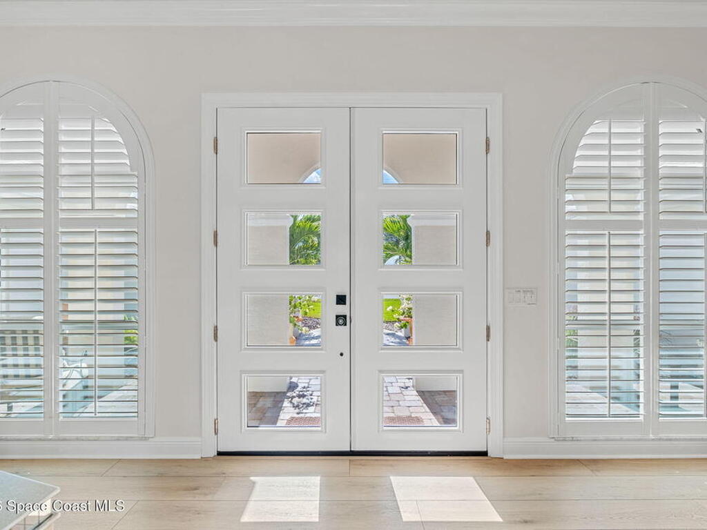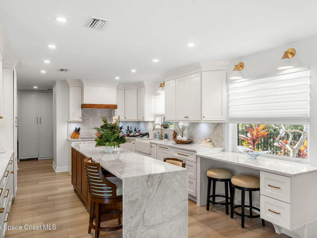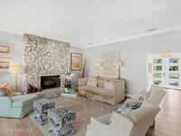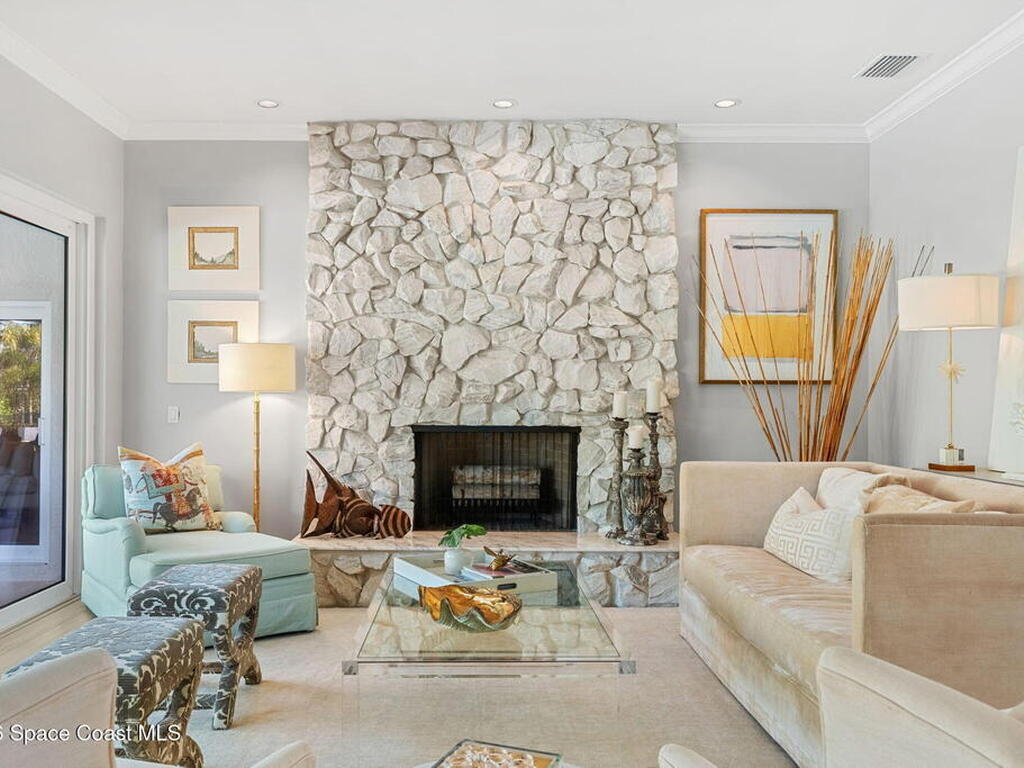 Located on the highly desirable Franklyn Street in Indialantic, this concrete block home has been thoughtfully improved with a focus on quality, durability, and everyday livability. Major upgrades include new impact-rated windows and doors, new Trane HVAC systems, and updated ductwork throughout.Set on a .42-acre lot, the property is framed by refreshed landscaping and subtle water features that create a sense of privacy without feeling closed off. Bimini shutters on select windows add a refined architectural detail, complementing the home's exterior. Inside, the home offers large, well-proportioned living spaces with new flooring, updated trim, and carefully selected lighting throughout. A fireplace anchors the main living area, adding warmth and character.The kitchen was completely rebuilt with custom cabinetry, Taj Mahal quartz countertops, Thermador appliances, a farmhouse sink, and thoughtful details that make it equally functional for daily use and entertaining.