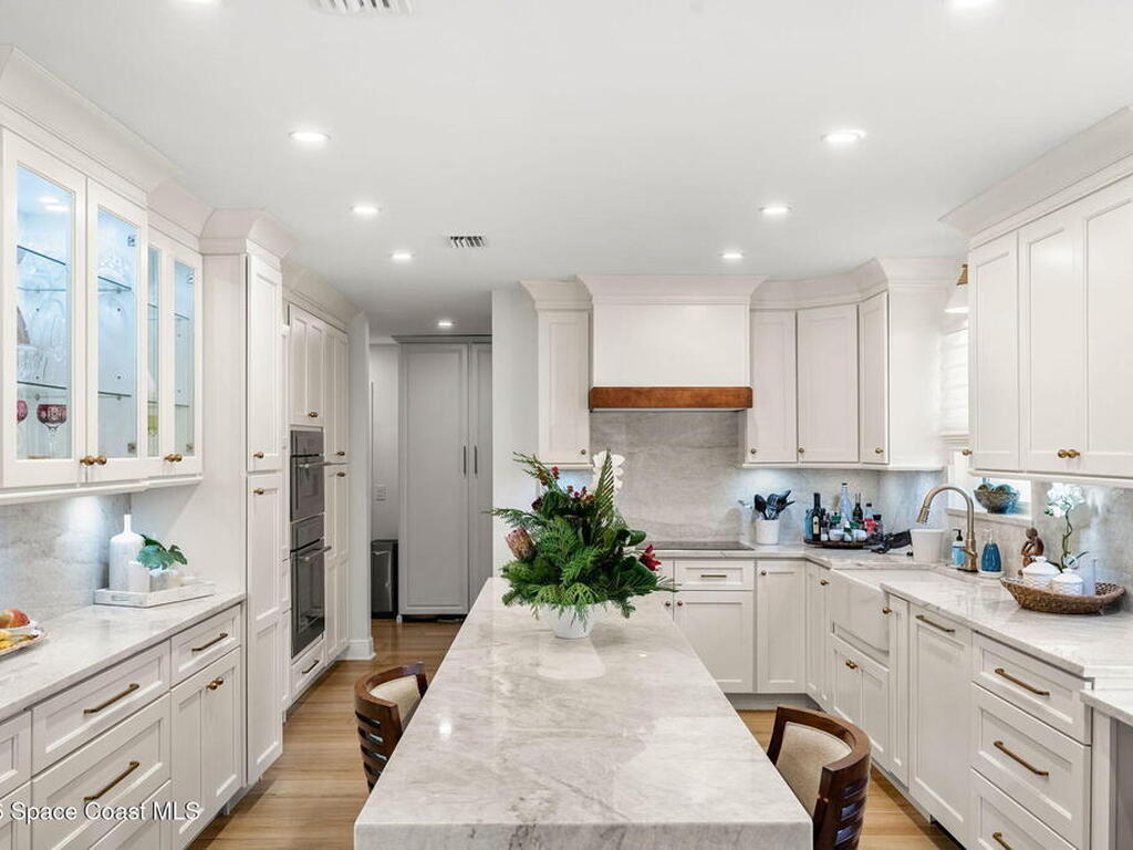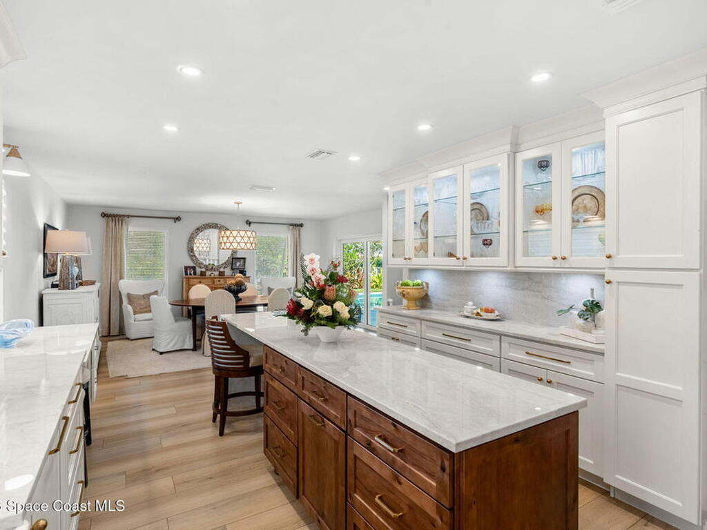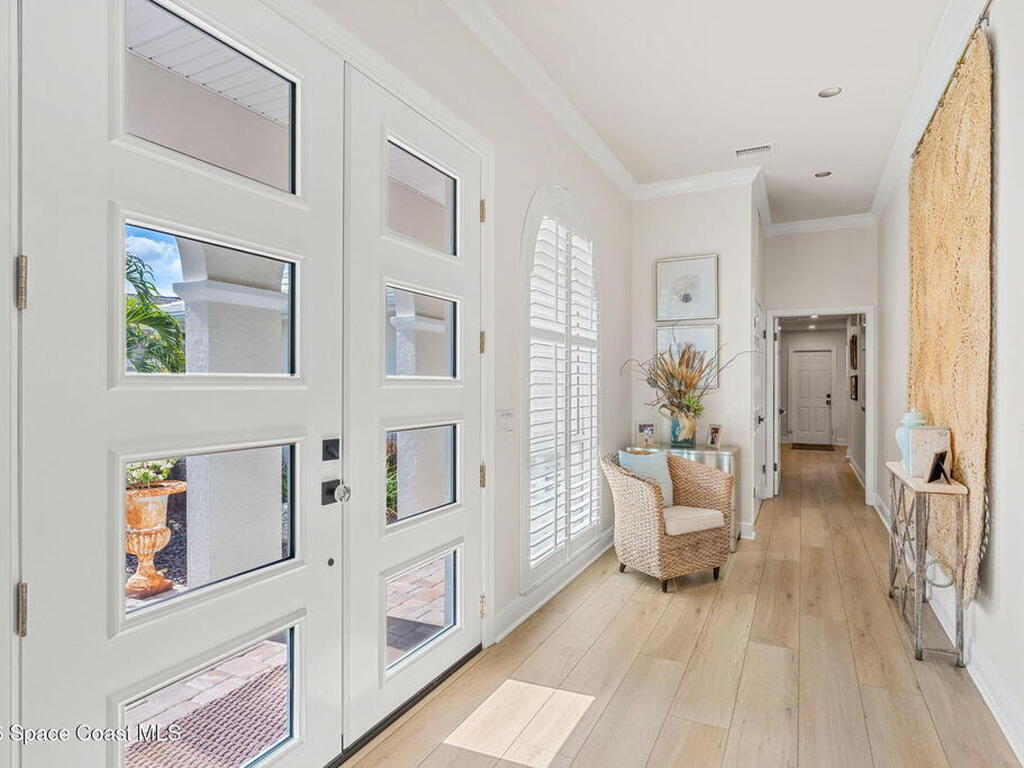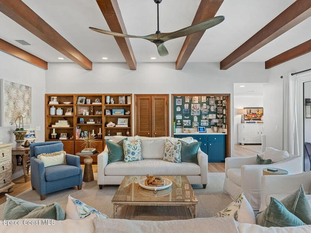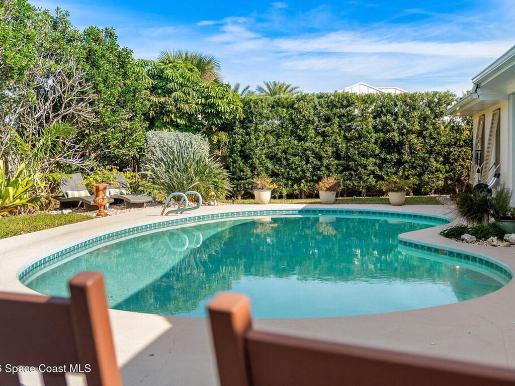 Located on the highly desirable Franklyn Street in Indialantic, this concrete block home has been thoughtfully improved with a focus on quality, durability, and everyday livability. Major upgrades include new impact-rated windows and doors, new Trane HVAC systems, and updated ductwork throughout.Set on a .42-acre lot, the property is framed by refreshed landscaping and subtle water features that create a sense of privacy without feeling closed off. Bimini shutters on select windows add a refined architectural detail, complementing the home's exterior. Inside, the home offers large, well-proportioned living spaces with new flooring, updated trim, and carefully selected lighting throughout. A fireplace anchors the main living area, adding warmth and character.The kitchen was completely rebuilt with custom cabinetry, Taj Mahal quartz countertops, Thermador appliances, a farmhouse sink, and thoughtful details that make it equally functional for daily use and entertaining.