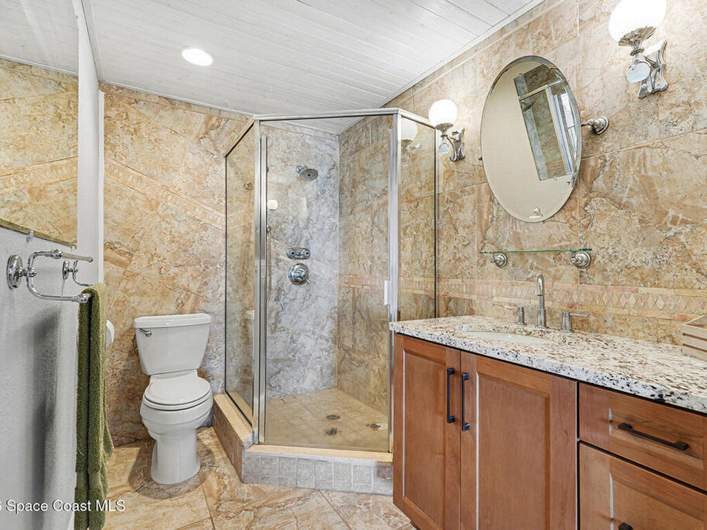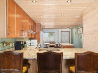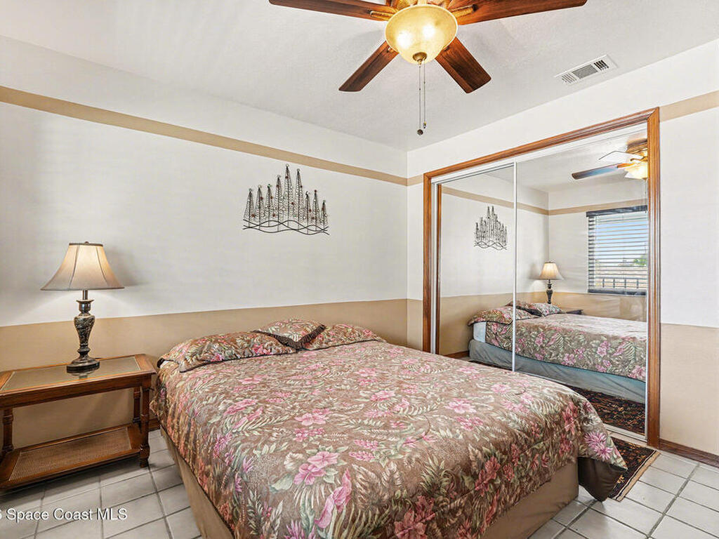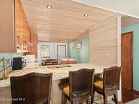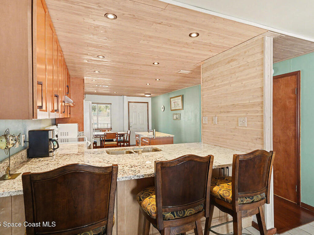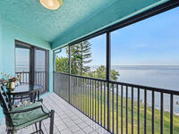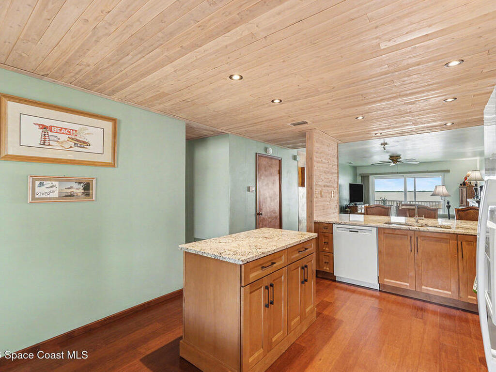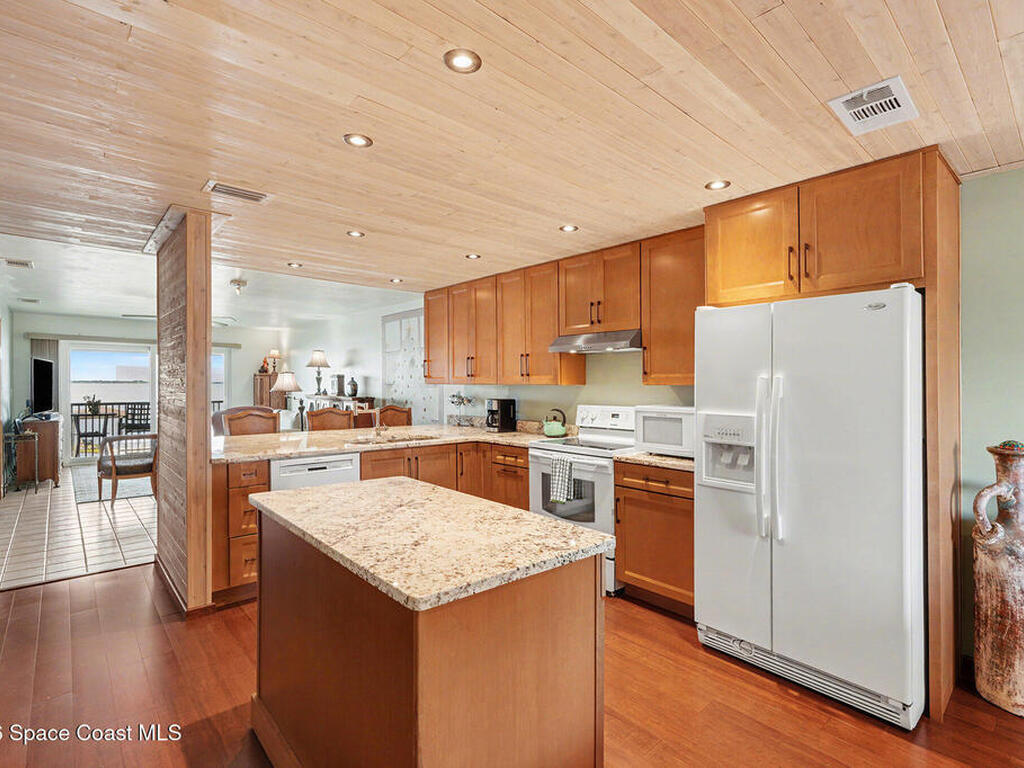 Enjoy the best of riverfront and ocean living from this comfortable, updated, and well-maintained second-floor condo. Take in expansive Banana River views from your balcony or walk just 300 yards across the street to enjoy the beach. A true nature and watersports paradise--watch dolphins and ospreys, explore the river or ocean by kayak or paddleboard, and take in spectacular sunsets over the water.The home features hurricane impact windows front and back, tile and wood flooring throughout, and a combined kitchen and dining area with custom cedar-planked ceilings, maple cabinetry, Brazilian Glacier White granite countertops, and seating for three at the breakfast bar. The living room and bedrooms include ceiling fans for added comfort. The primary suite offers a walk-in closet, attic access, and a custom bath with granite-topped maple vanity. Enjoy ocean sunrises and river sunsets--this is truly the best of Cocoa Beach living.