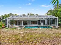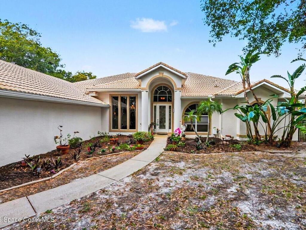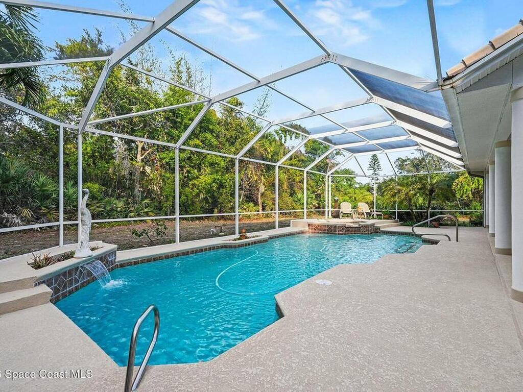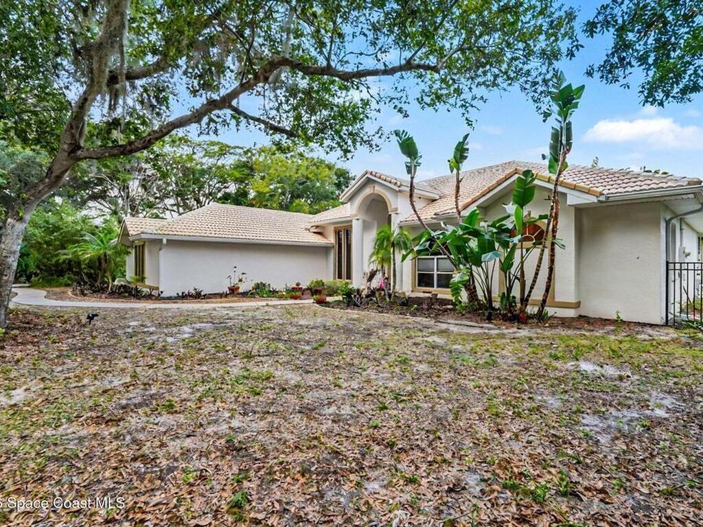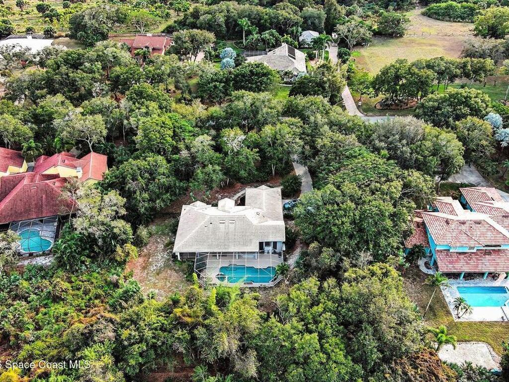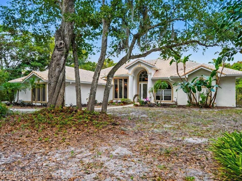 Hacienda Del Sol is a luxury enclave of distinguished estates that sprawl along the riverbanks, set amid lush tropical foliage. The community is defined by large lots, a rare river-to-river location, and a sense of refined privacy. Located at the tip of South Tropical Trail, where the Banana River runs on the east side and the Intracoastal Waterway on the west , Hacienda del Sol is TROPICAL OASIS . Sweeping river views, mature landscaping, and expansive homes create a quiet, resort-like atmosphere while remaining close to everyday conveniences. Privacy of 1 acre - set back from main road and surrounded by LUSH NATURAL FOLIAGE habitat for birds and wildlife this home is peaceful and feels like you always want to come home . Interiors offer tall ceiling height - pocket sliders that open up to lanai area. 3 bedrooms plus office allow comfort of work and family life. THE blending indoor and outdoor lifestyle with large pool - freshly painted lanai is unique with TROPICAL FOLIAGE