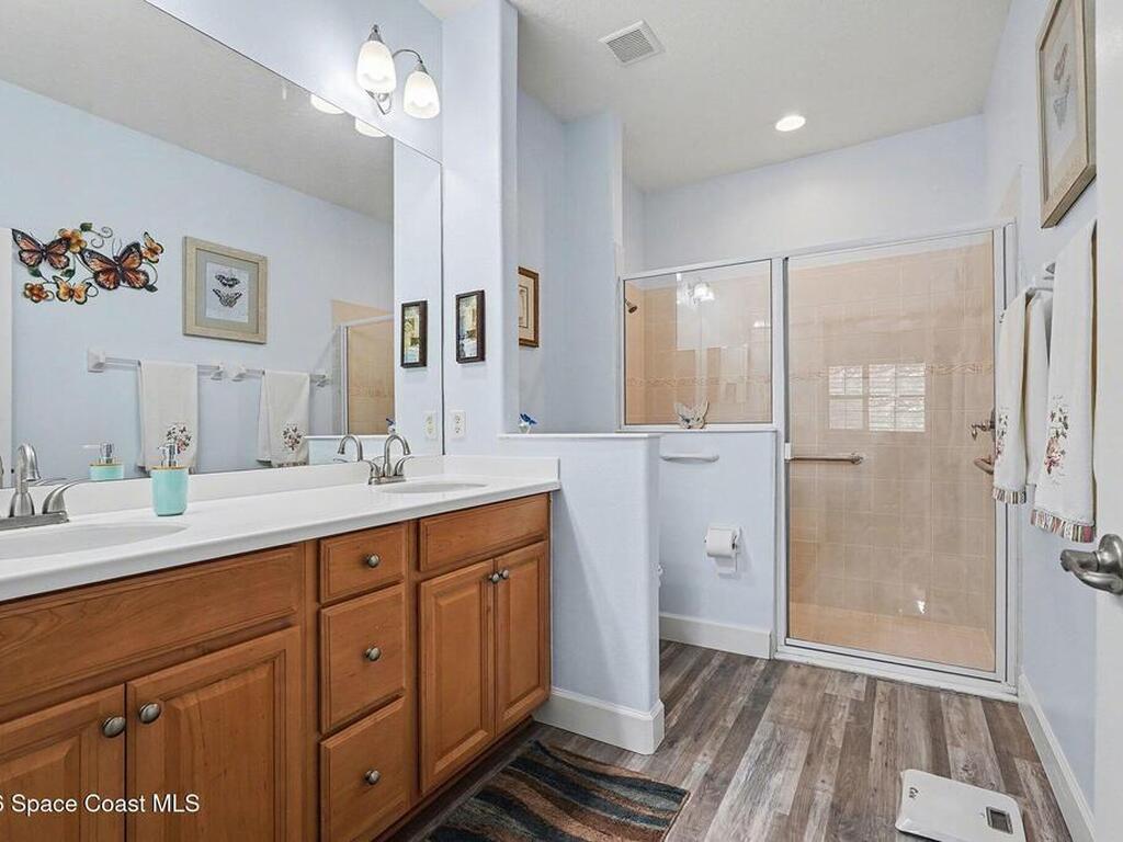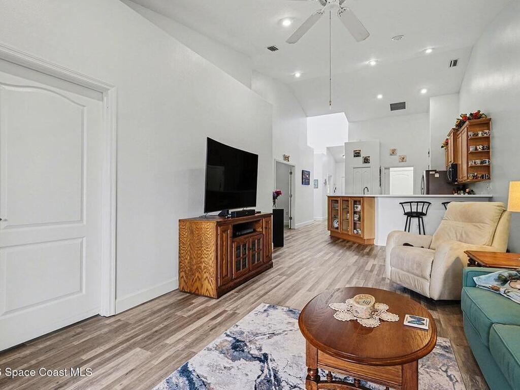 Welcome home!! Enjoy luxury senior living at it's best with an open floor plan and soaring ceilings that create a light, spacious feel throughout. Recent upgrades include fresh paint, new 5 3/4'' baseboards and durable luxury vinyl plank flooring, complemented by plantation shutters in the bedrooms for added style and privacy.The spacious primary suite offers a large walk-in closet and a spa-like bathroom with a generous walk-in shower and double vanities. The kitchen is equipped with easy-to-maintain Corian countertops, newer stainless steel appliances, and a functional layout perfect for everyday living or entertaining.Additional highlights include a newer tankless water heater, newer a/c, washer and dryer, and a screened patio ideal for relaxing outdoors. Conveniently located within walking distance to the clubhouse, pool, and all activities. Feel secure with the 24 hour guarded gate entrance --this home offers comfort, convenience, and a vibrant community lifestyle.