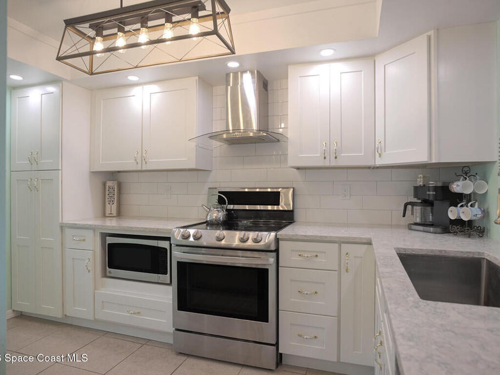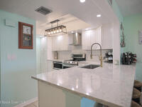 Welcome to coastal living at its best in this beautifully updated 2/2 condo in the heart of Cocoa Beach. Located on the fourth floor, this residence offers a bright, open layout designed to capture the relaxed beachside lifestyle. Tile throughout, recent complete renovation to kitchen with beautiful cabinets & countertops & both baths completely renovated. Shutters and hallway windows replaced 2018. AC and water heater replaced 2023. The primary suite features ample closet space an en-suite bath, while the second bedroom and full guest bath provide comfort and flexibility for guests or a home office. Deeded shared garage for convenience of beach gear, bikes and car with resort style amenities and a 24/7 guard gate. Enjoy ocean breezes and the convenience of beachside living just steps from the sand, with easy access to Cocoa Beach's dining, shopping and entertainment.