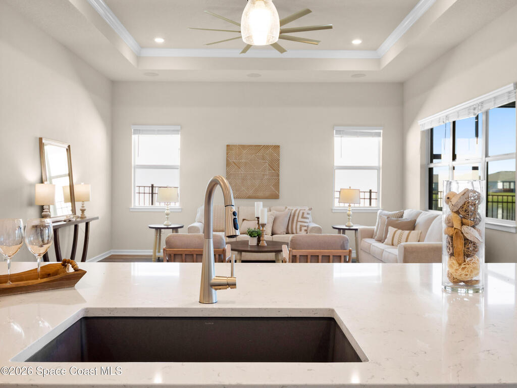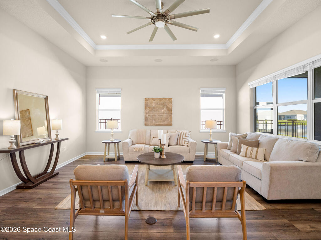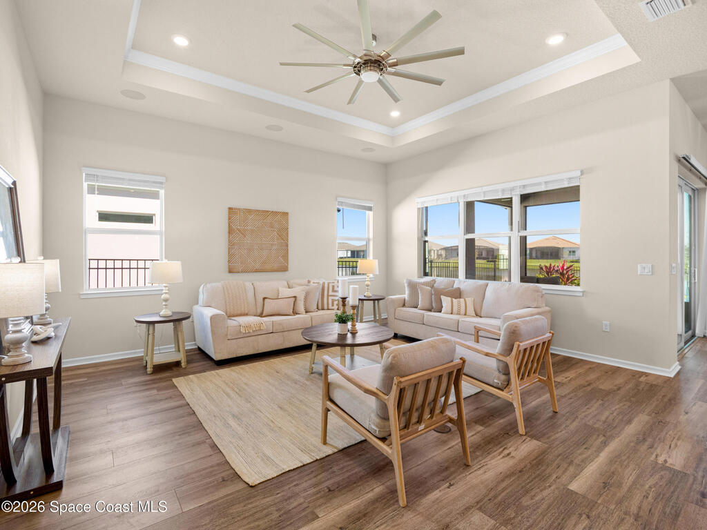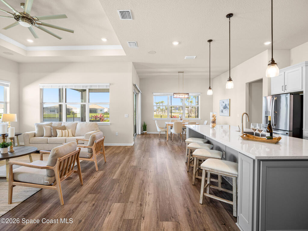 Live the Florida lifestyle in this stunning lakefront home located in the gated Del Webb at Viera 55+ community. Situated on a premium corner lot with peaceful water views, this move-in-ready residence offers an open-concept layout with high ceilings and luxury vinyl plank flooring throughout.The gourmet kitchen features quartz countertops, a 5-burner gas cooktop, double ovens, upgraded cabinetry, and a custom walk-in pantry--perfect for entertaining or everyday living. Three of the four bedrooms include private en-suite baths, providing comfort and privacy for owners and guests.Enjoy outdoor living on the screened lanai overlooking the lake, with a fenced yard and the rare opportunity to watch Cape Canaveral rocket launches from home. Additional highlights include custom closets throughout, upgraded lighting and fans, and an extended 3-car garage with epoxy flooring.