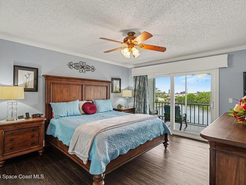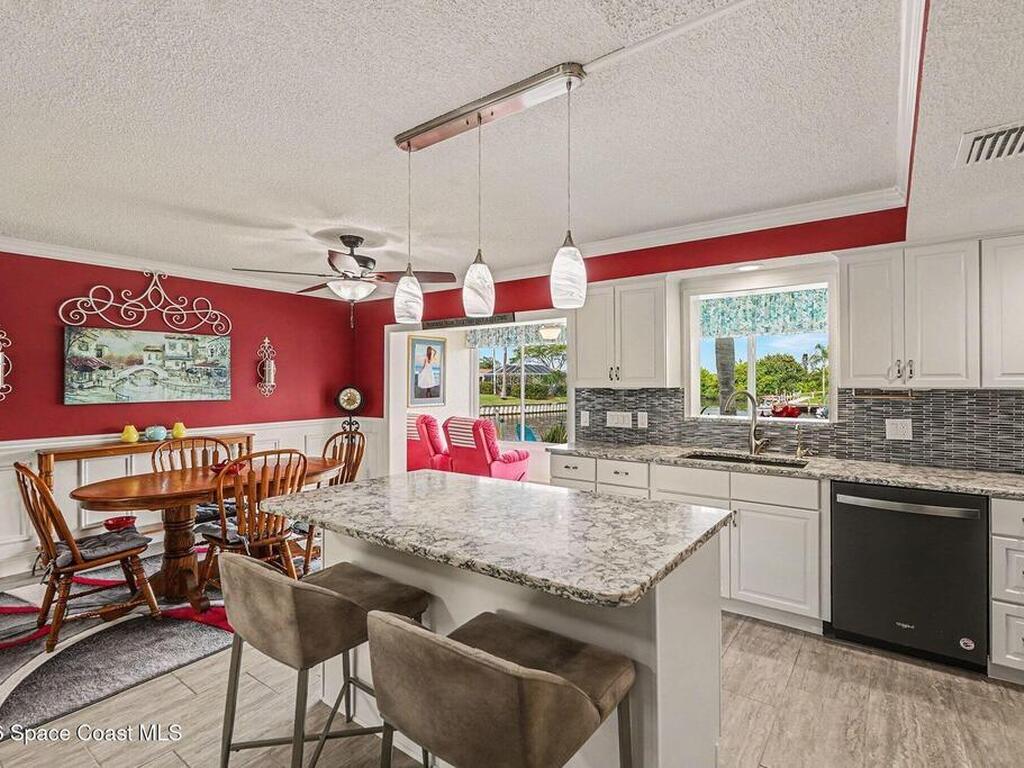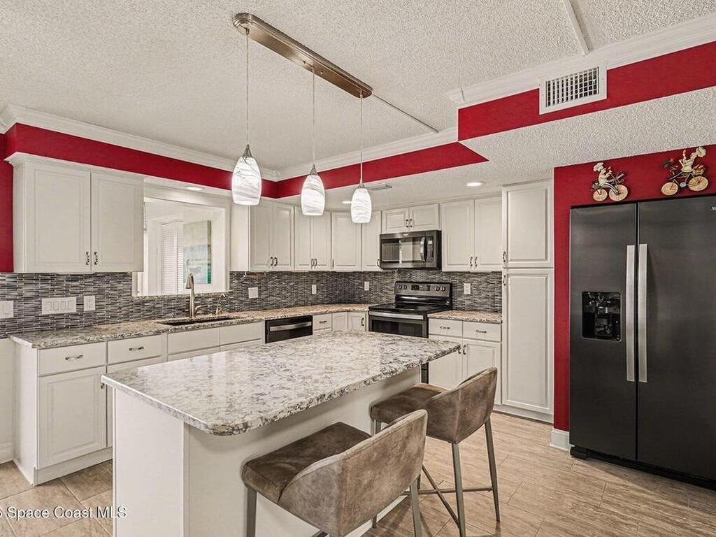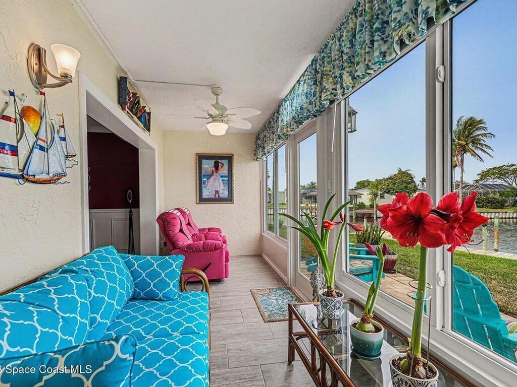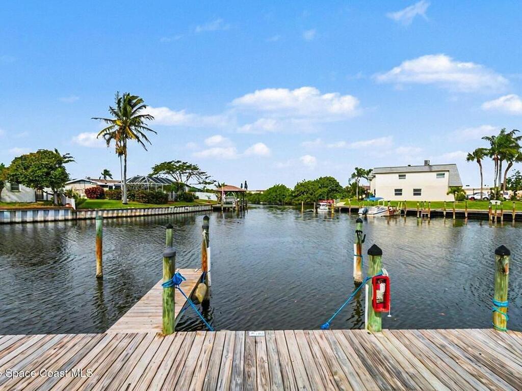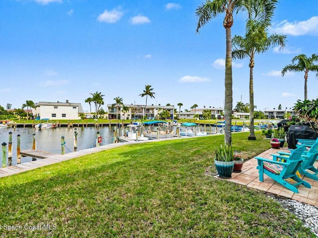 Fully renovated and ideally located in Satellite Beach, this 2-story waterfront home offers an exceptional blend of style, comfort, & carefree coastal living. The upper level features three bedrooms & two full baths, highlighted by crown molding and LVP throughout. Downstairs, an open living and dining area creates a welcoming space for entertaining, complemented by a convenient half bath. The stunning kitchen is the heart of the home, showcasing quartz countertops, white cabinetry, tile backsplash, a spacious island, pantry with pull-out drawers, and sleek gun-metal appliances. The enclosed lanai adds approx.120 square feet of living space and allows for an indoor laundry area, adding everyday convenience. Enjoy tranquil water views and the rare advantage of a private, designated boat slip with direct access to the Banana River. Additional upgrades include impact windows, HVAC 2018, Roof 2017, HWH 2018, and xtra outlets. One of the nicest unit in the complex. A must see!